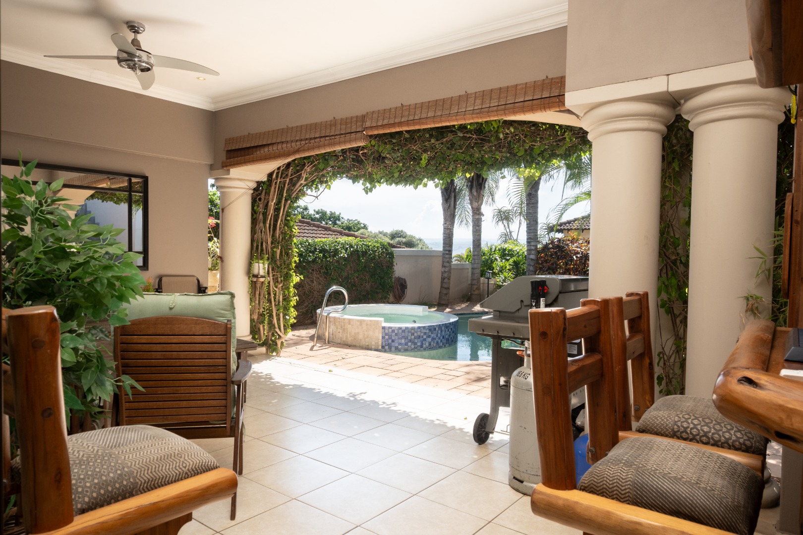Outdoor living is a highlight of this home, with a private swimming pool featuring an integrated jacuzzi seat, perfect for relaxation. The covered patio is also a well utilized area of this home, complete with it's built-in-bar.