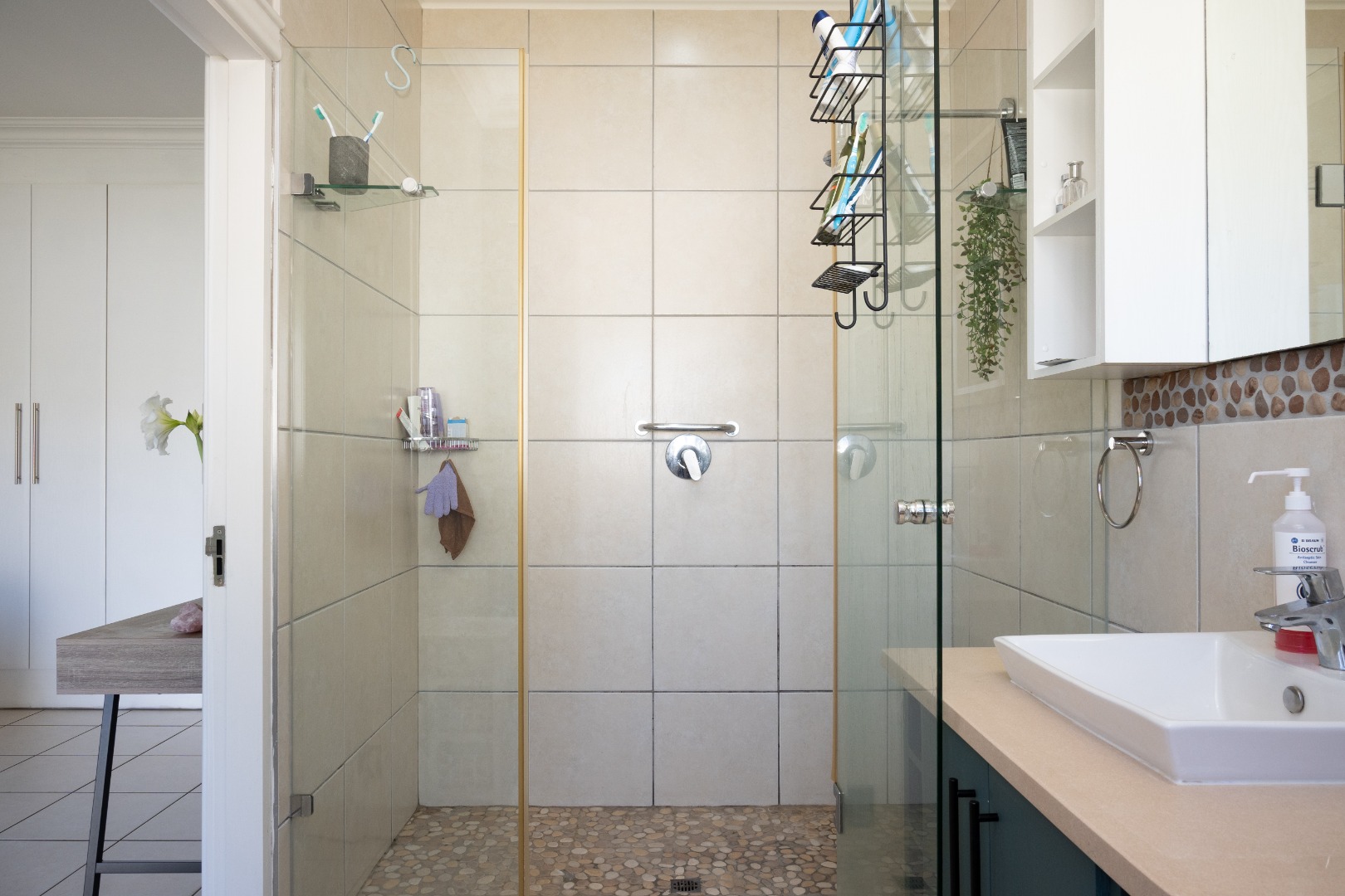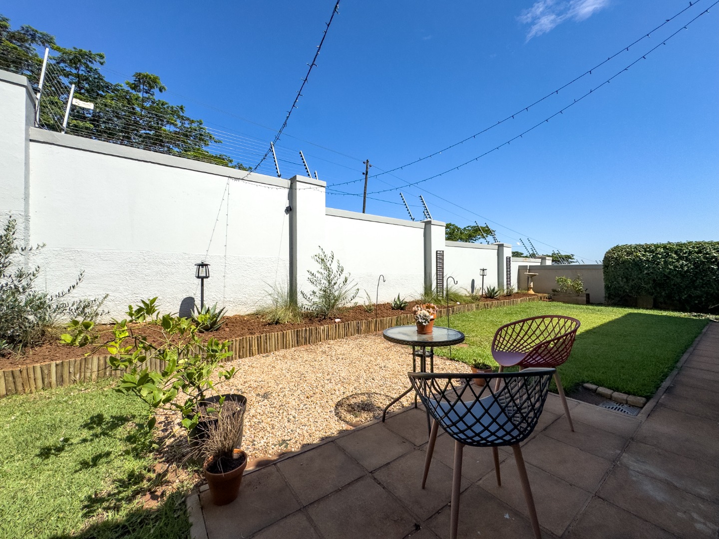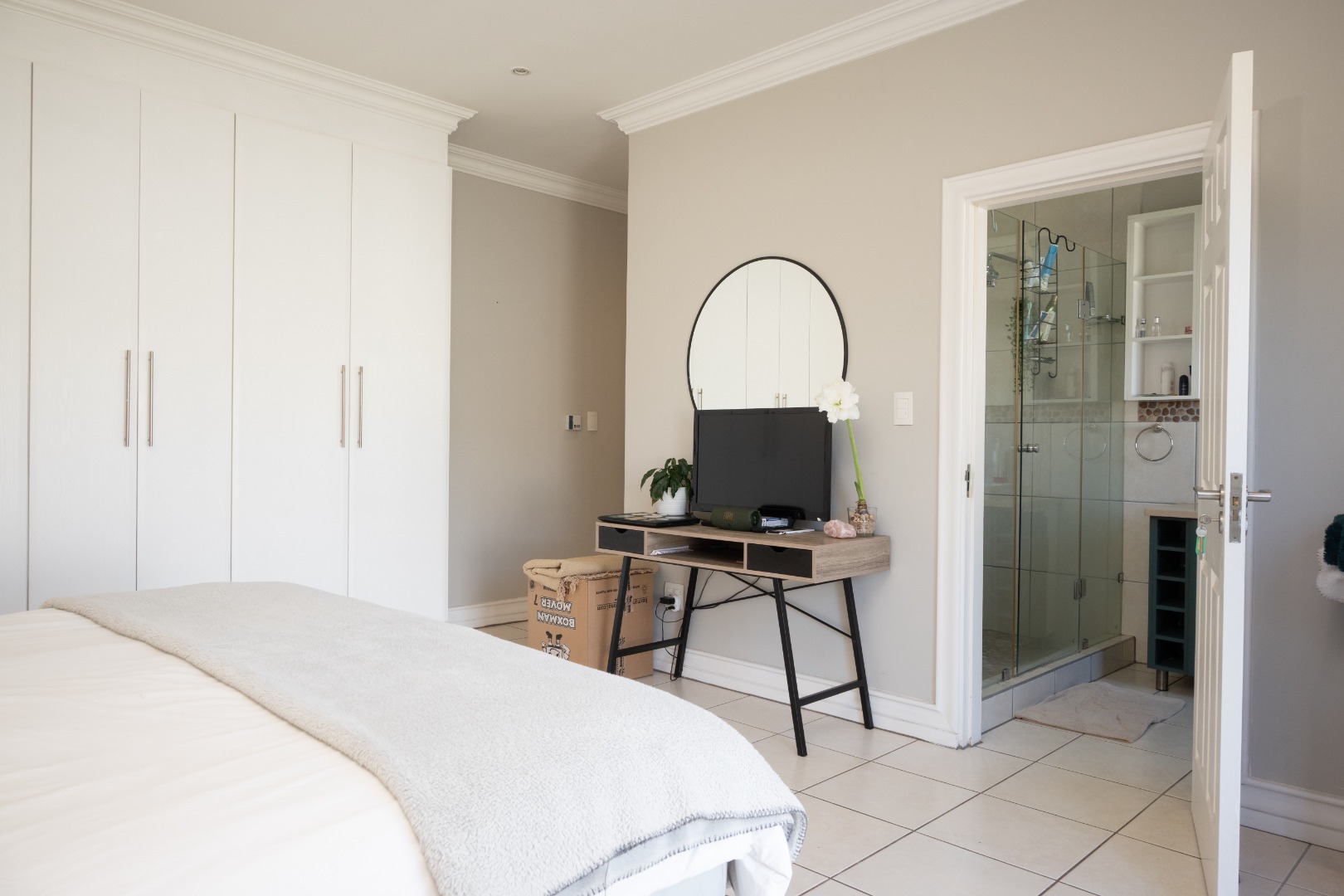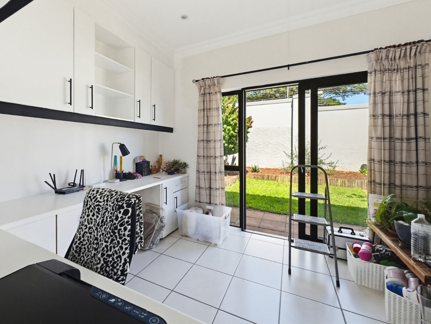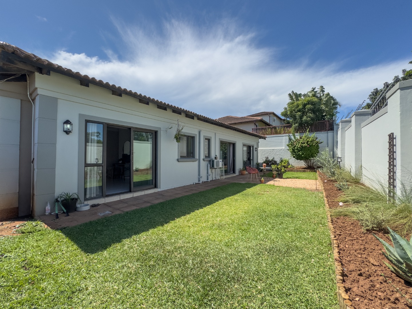 This home comprises three comfortable bedrooms and three bathrooms (two are en-suites). It also has a dedicated study with built in cupboards that offers a convenient space to work in, from home. It opens onto the back garden as does the main bedroom and second bedroom. A double garage and additional parking ensure ample space for vehicles.