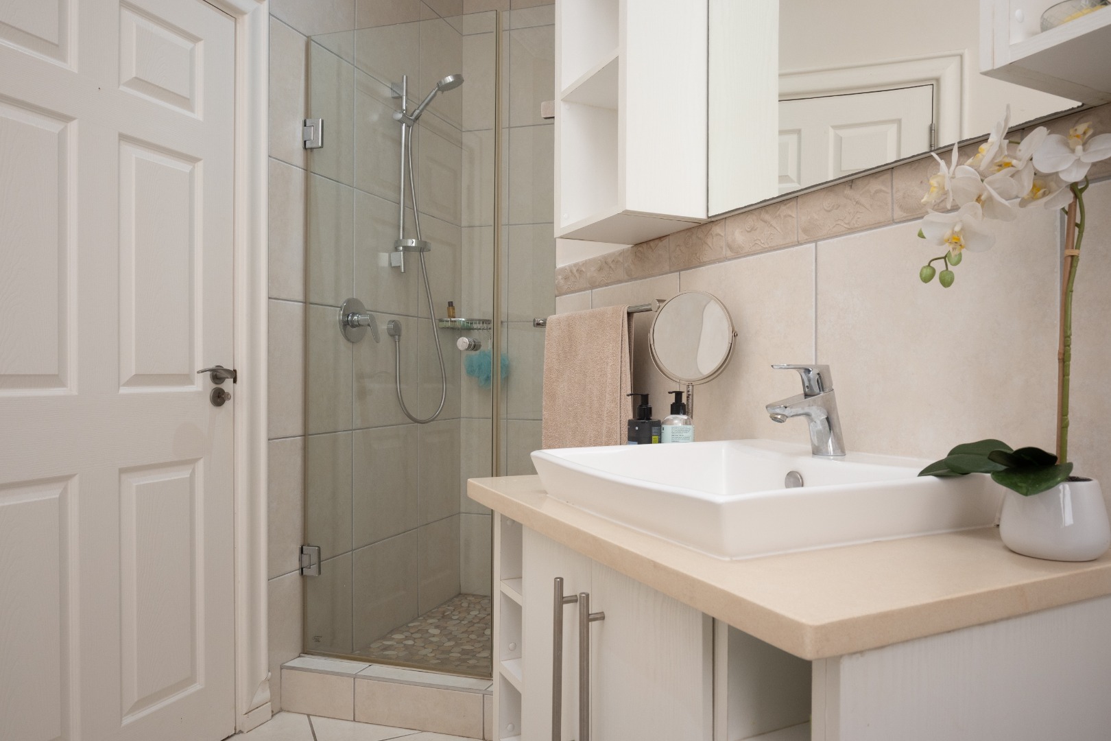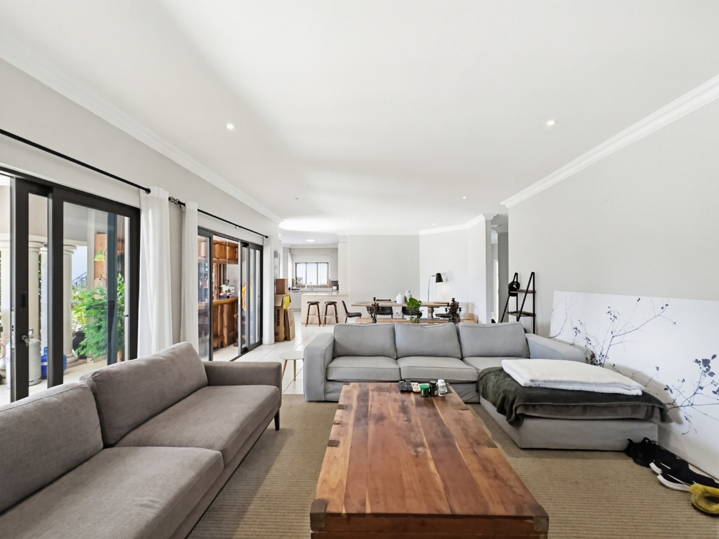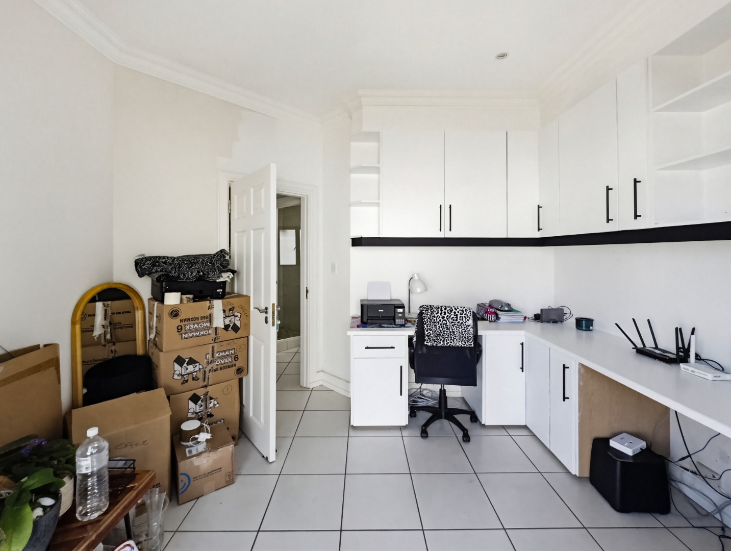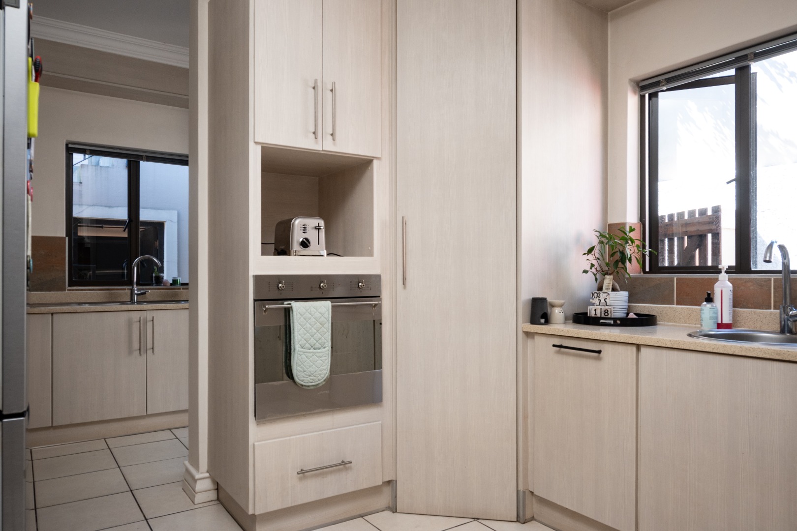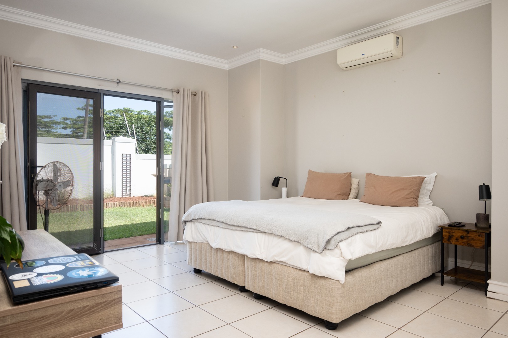 This home comprises three comfortable bedrooms and three bathrooms (two are en-suites). It also has a dedicated study with built in cupboards that offers a convenient space to work in, from home. It opens onto the back garden as does the main bedroom and second bedroom. A double garage and additional parking ensure ample space for vehicles.