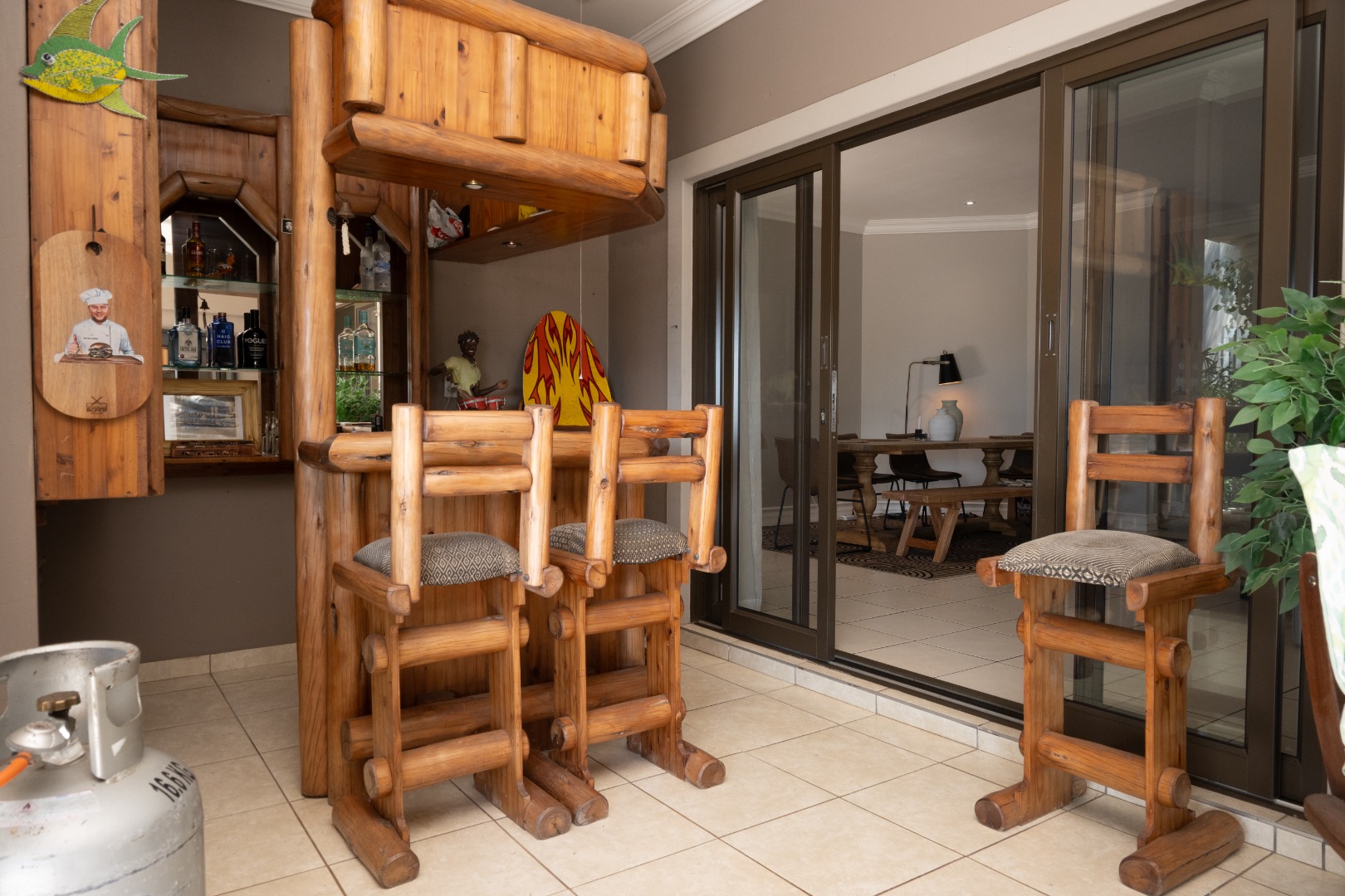 The interior of the main home has a spacious, open-plan layout designed for modern living. The lounge area features a striking stone accent wall, a gas fireplace, and large sliding doors that open onto the outdoor covered patio and the pool. The well-appointed kitchen is equipped with a gas hob, extractor fan, ample cabinetry and a seperate scullery. The home also offers airconditioning.