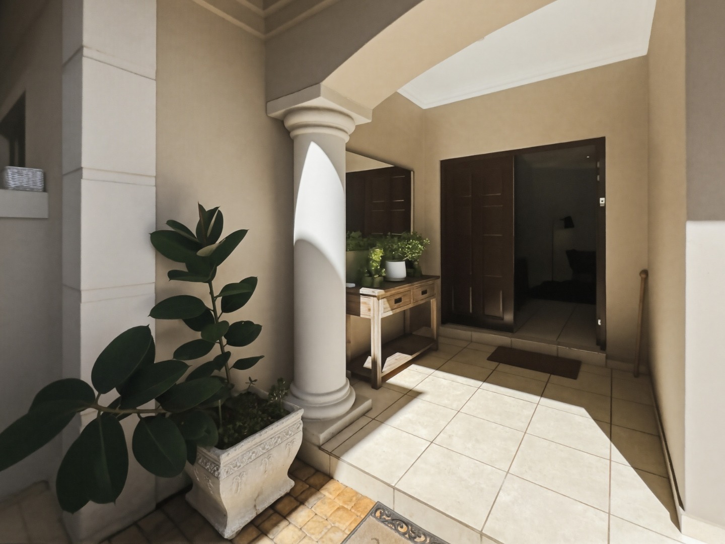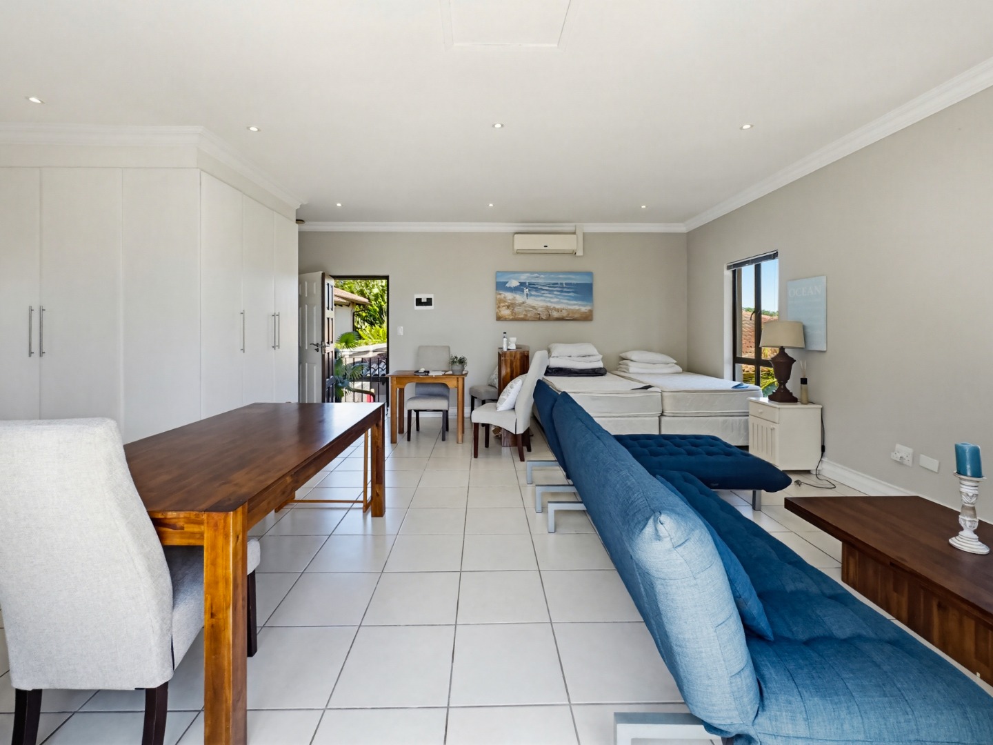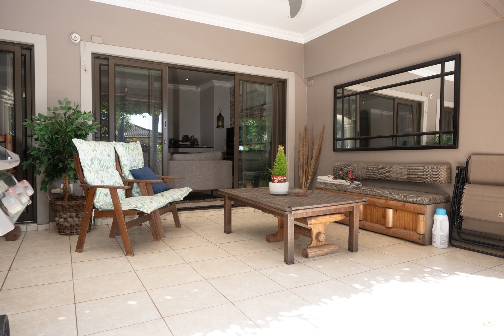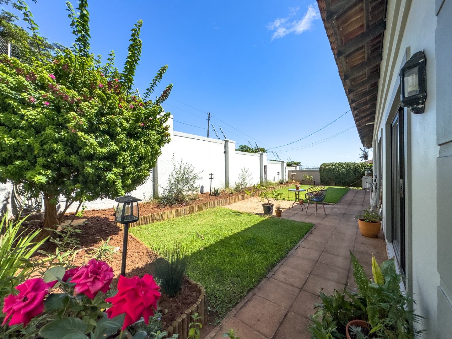This home comprises three comfortable bedrooms and three bathrooms (two are en-suites). It also has a dedicated study with built in cupboards that offers a convenient space to work in, from home. It opens onto the back garden as does the main bedroom and second bedroom. A double garage and additional parking ensure ample space for vehicles.