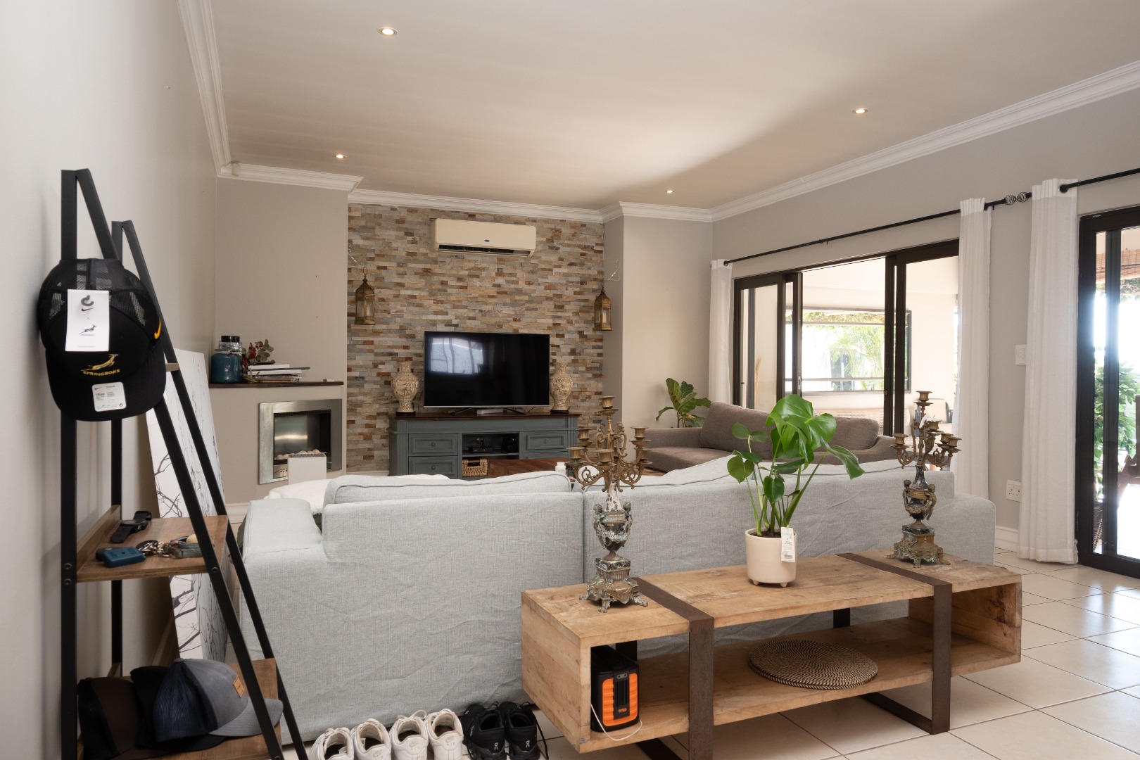 The interior of the main home has a spacious, open-plan layout designed for modern living. The lounge area features a striking stone accent wall, a gas fireplace, and large sliding doors that open onto the outdoor covered patio and the pool. The well-appointed kitchen is equipped with a gas hob, extractor fan, ample cabinetry and a seperate scullery. The home also offers airconditioning.