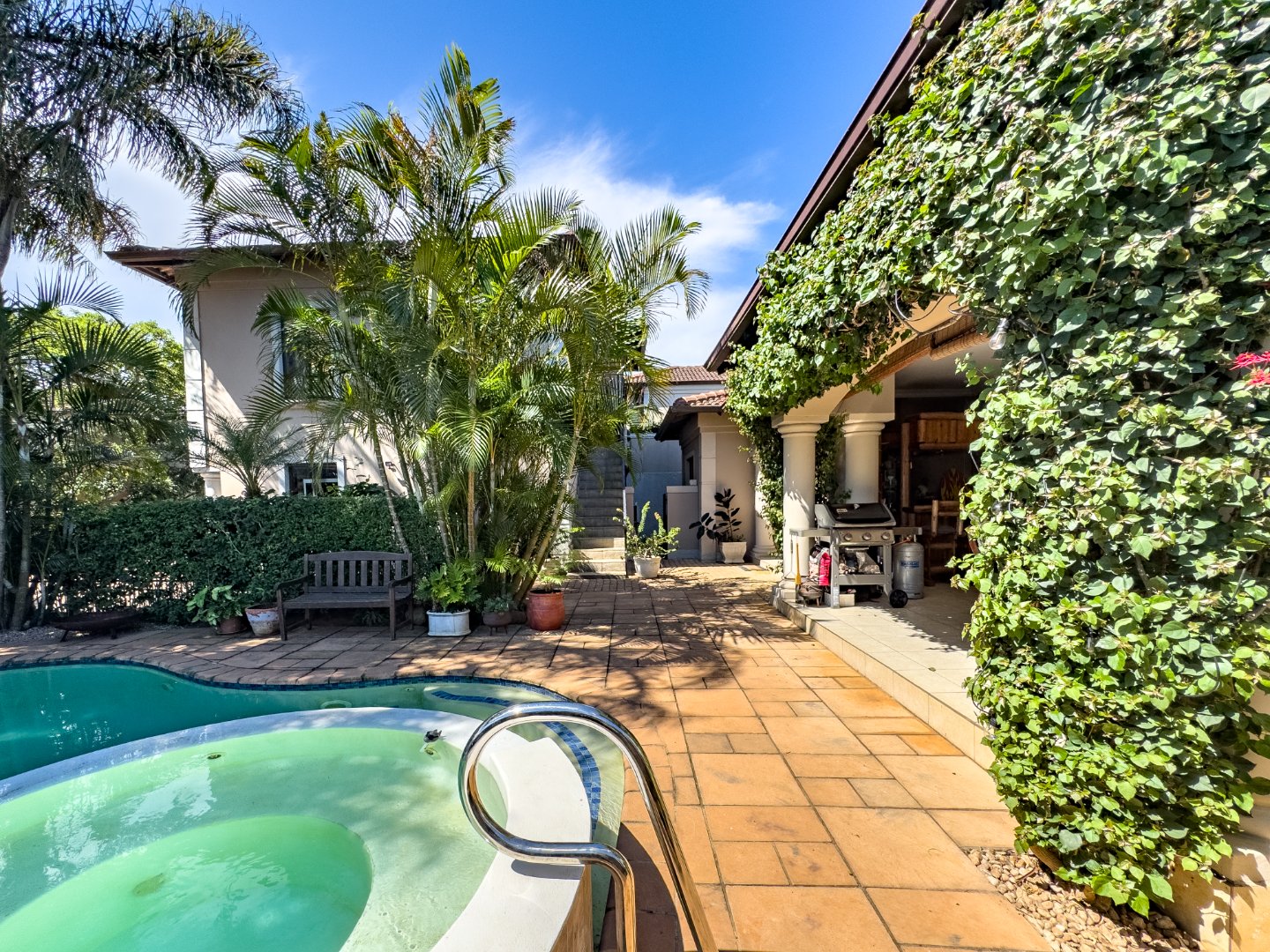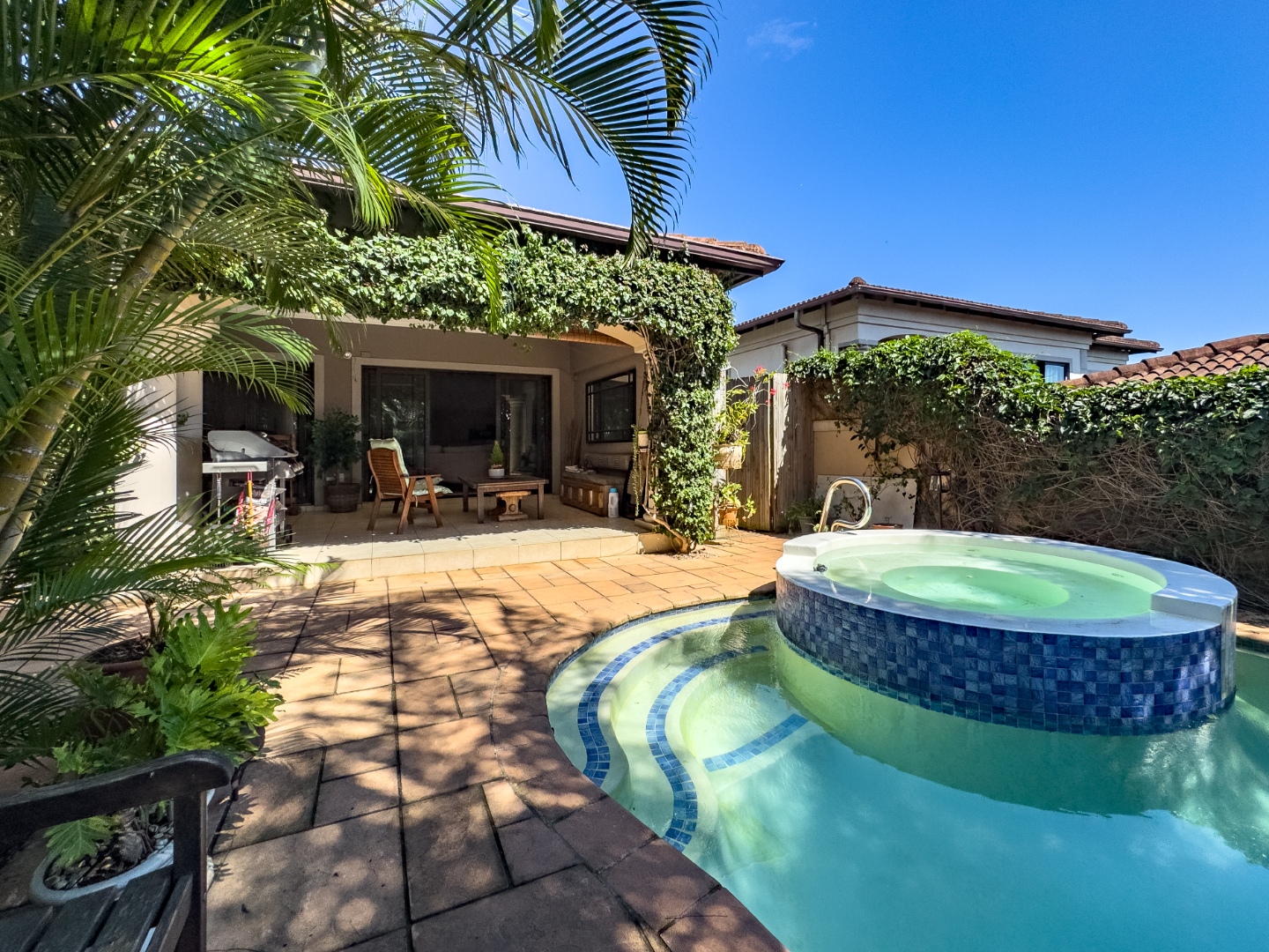 Outdoor living is a highlight of this home, with a private swimming pool featuring an integrated jacuzzi seat, perfect for relaxation. The covered patio is also a well utilized area of this home, complete with it's built-in-bar.