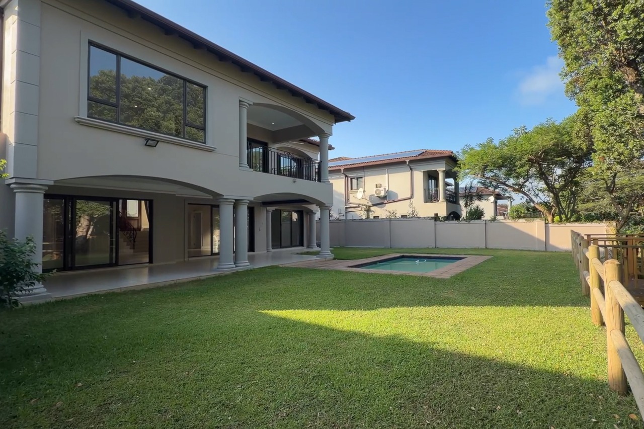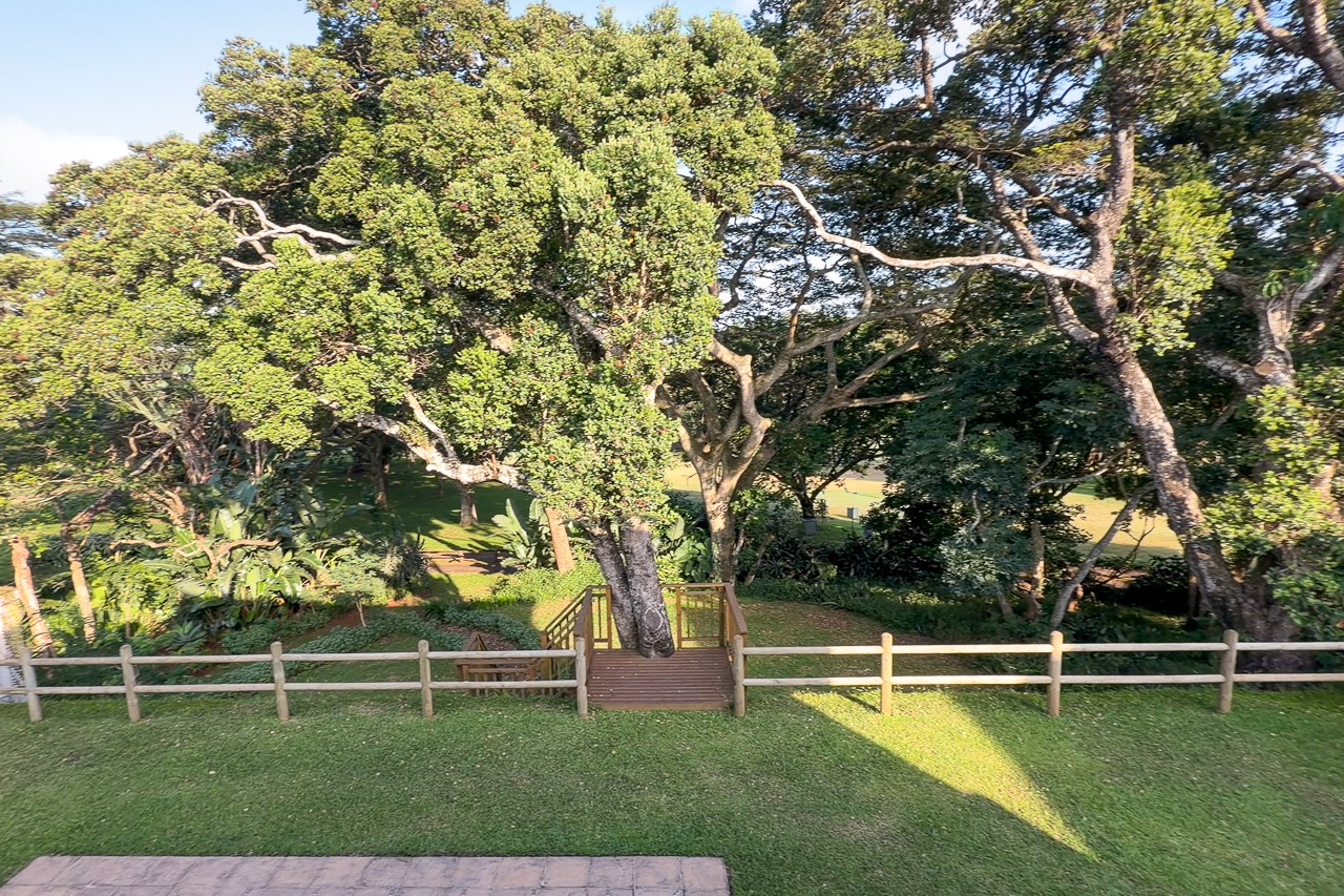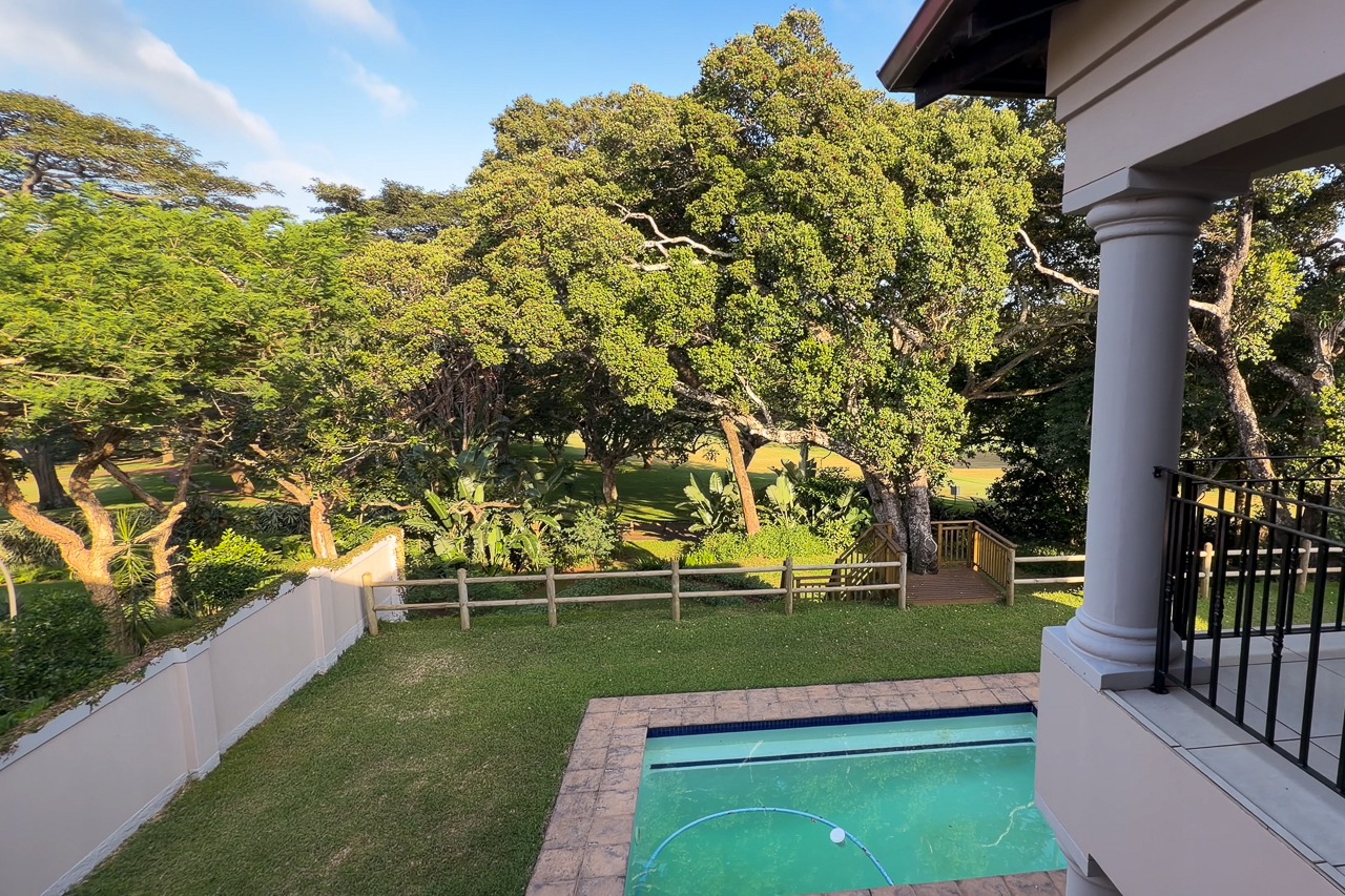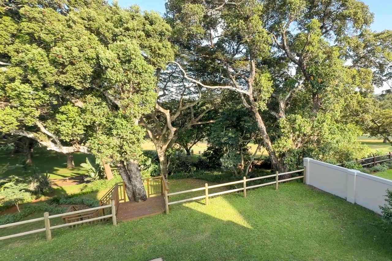 Nestled within the prestigious Umhlali Golf Estate in Ballito, South Africa, this magnificent 4-bedroom residence offers an exceptional lifestyle. The property immediately impresses with its attractive Mediterranean-style architecture, featuring light stucco walls, terracotta roof tiles, and grand double wooden front doors. A spacious paved driveway leads to a two-car and golf cart garage, providing ample parking and a welcoming first impression.