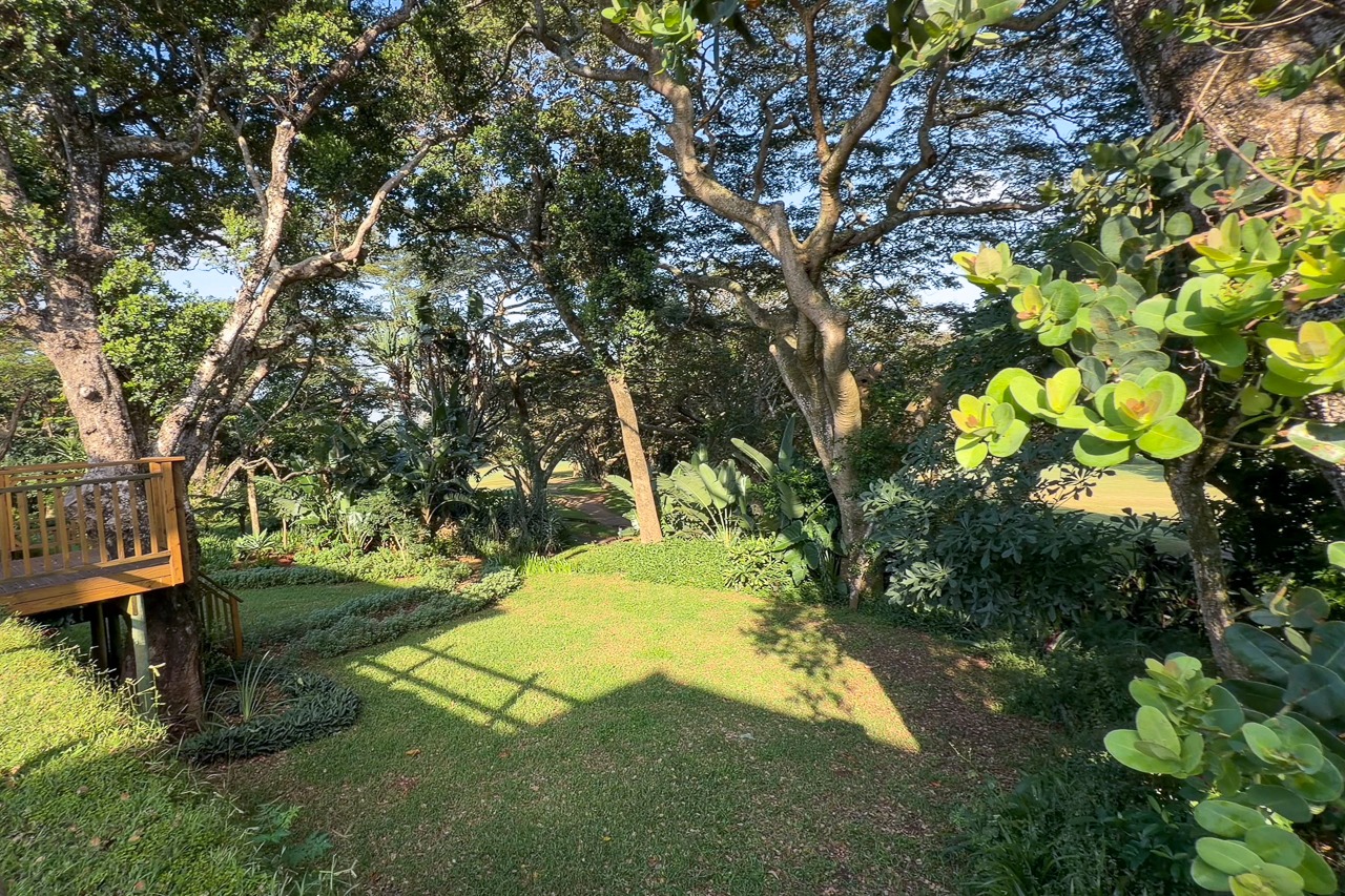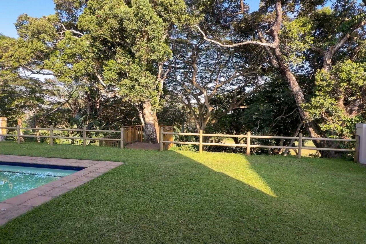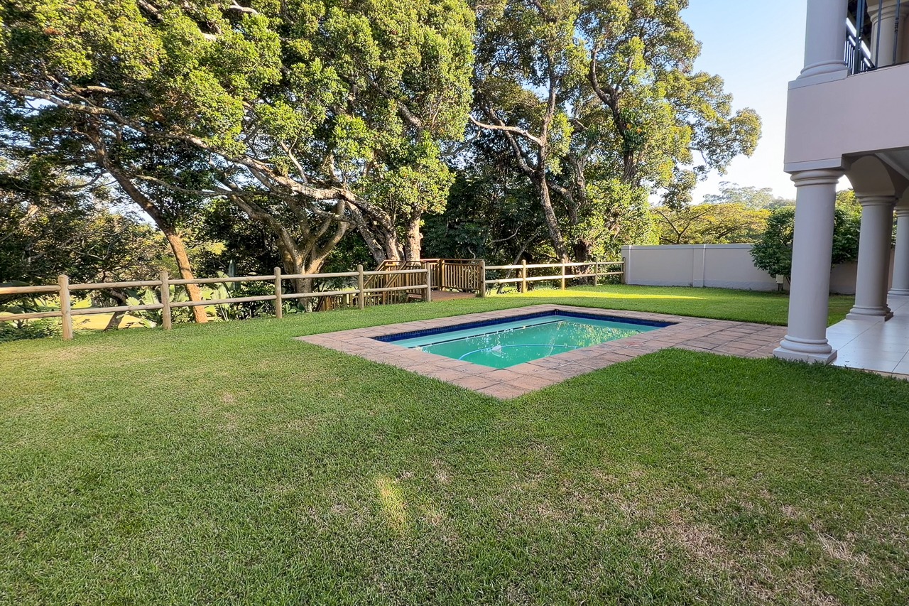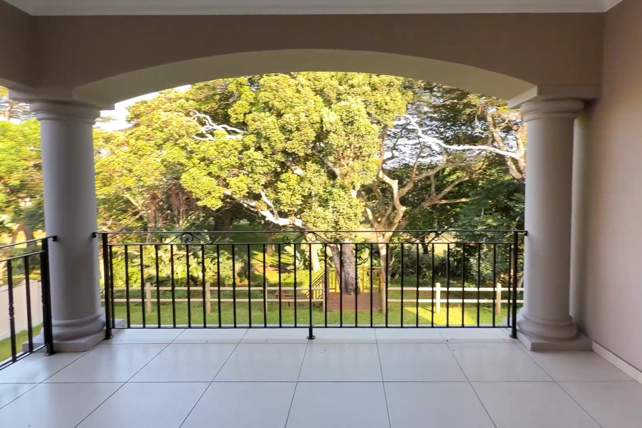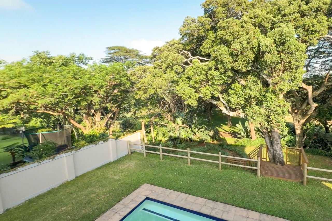 Nestled within the prestigious Umhlali Golf Estate in Ballito, South Africa, this magnificent 4-bedroom residence offers an exceptional lifestyle. The property immediately impresses with its attractive Mediterranean-style architecture, featuring light stucco walls, terracotta roof tiles, and grand double wooden front doors. A spacious paved driveway leads to a two-car and golf cart garage, providing ample parking and a welcoming first impression.