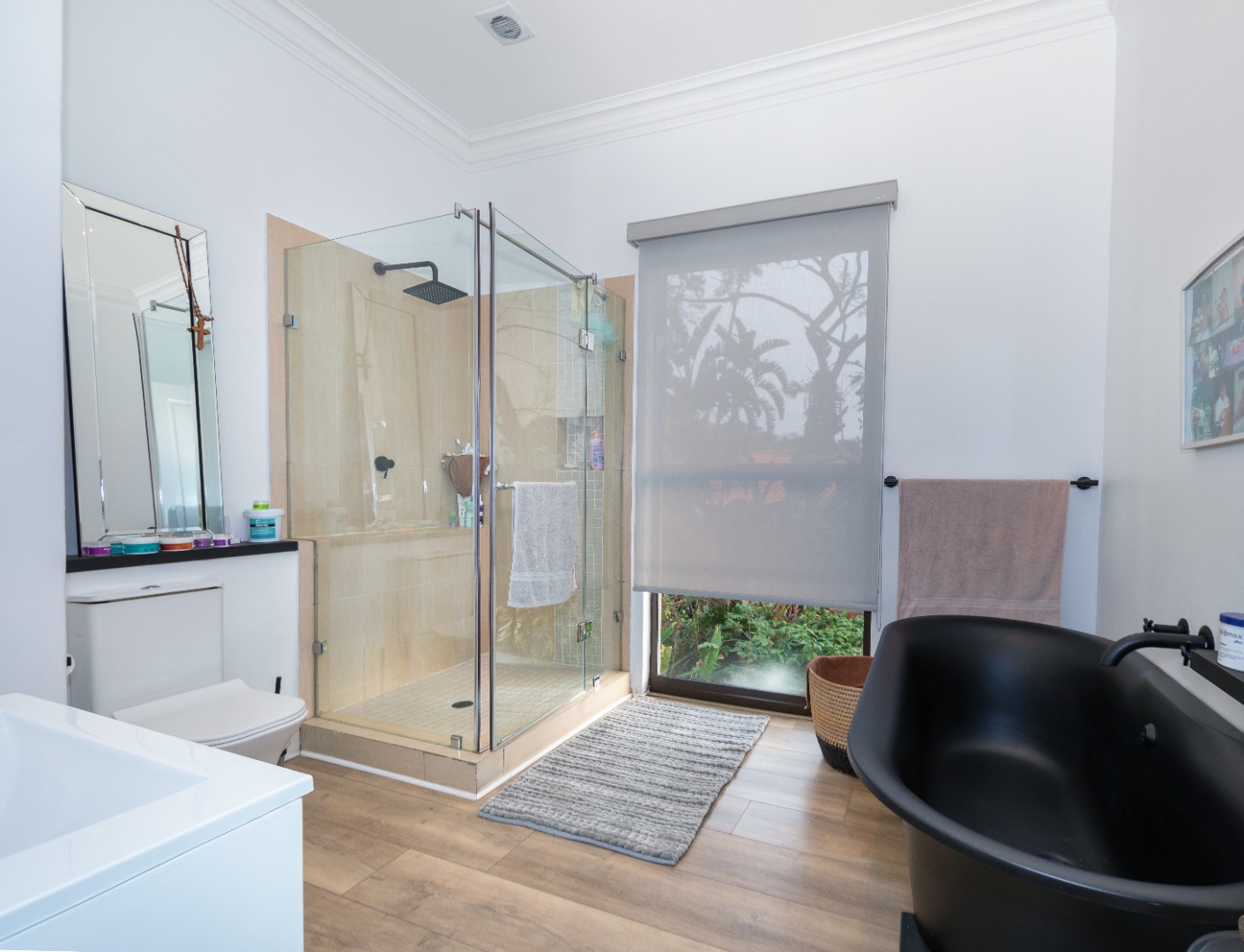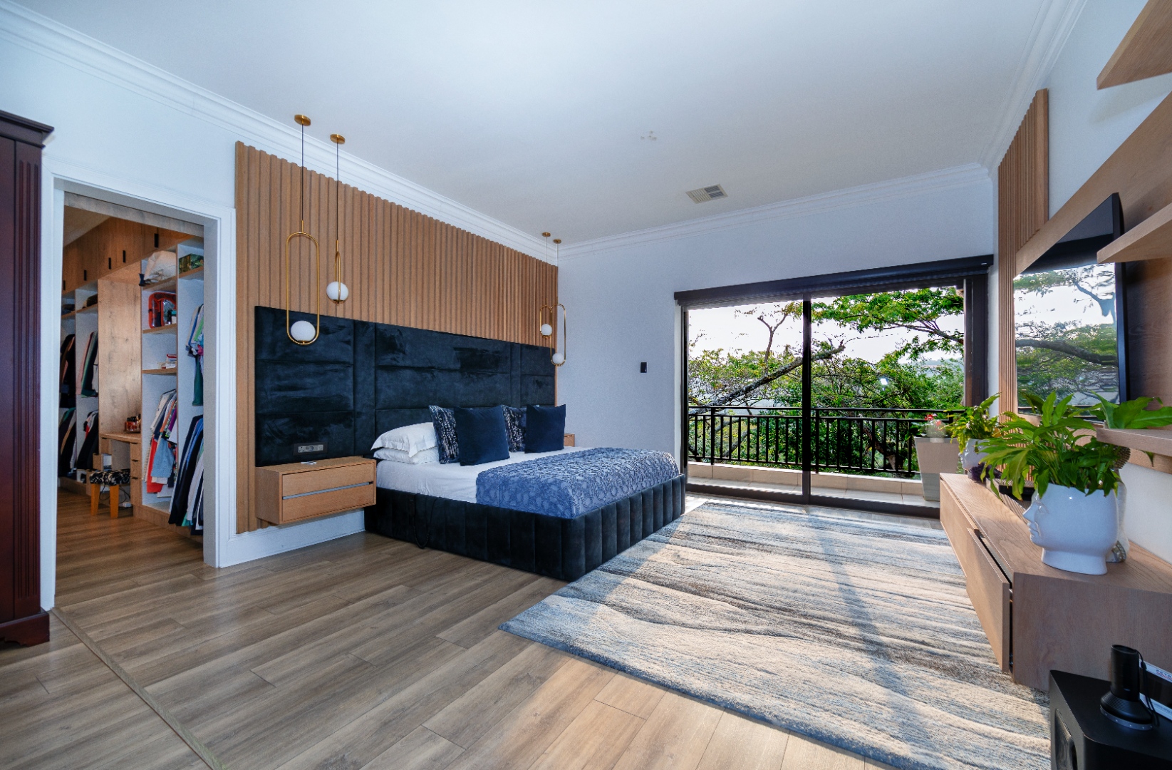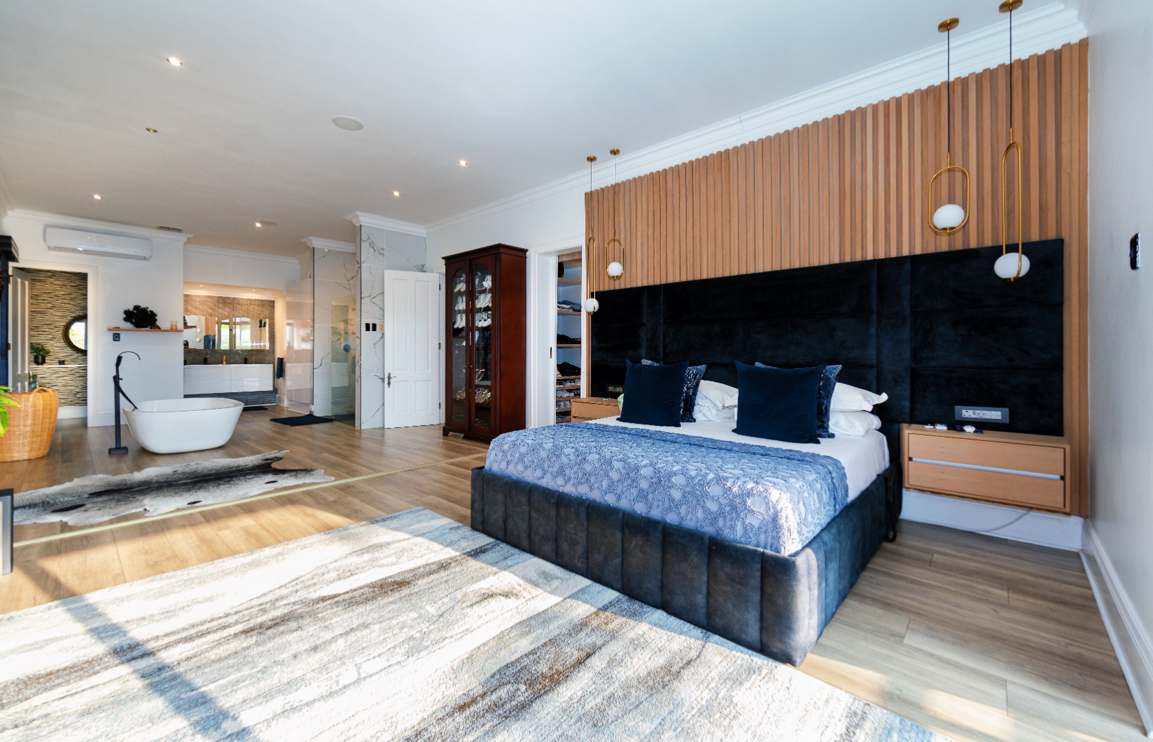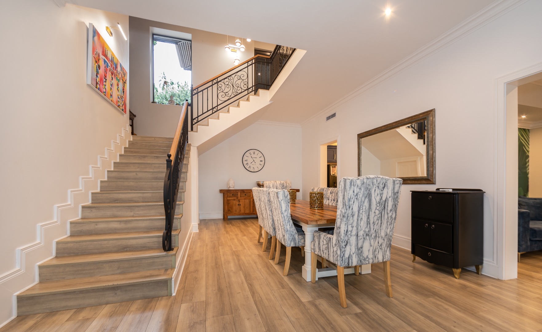 On the upper level you will find three spacious and beautifully appointed bedrooms,all with en suite bathrooms.The main bedroom is something to behold and is extremely spacious. A modern bathroom and separate toilet, as well as a full walk in dressing room create the feeling of opulence that one would expect from a Zimbali home and sliding doors open this room out onto a private balcony, with views across the golf course and the estate.