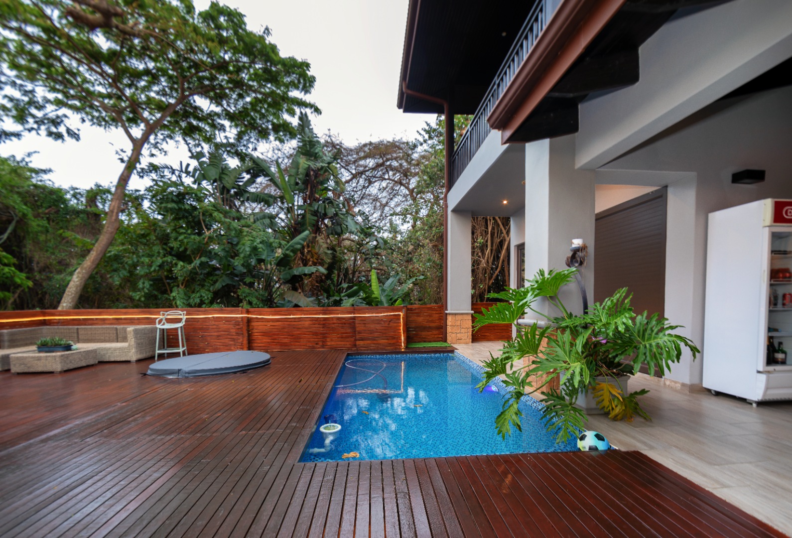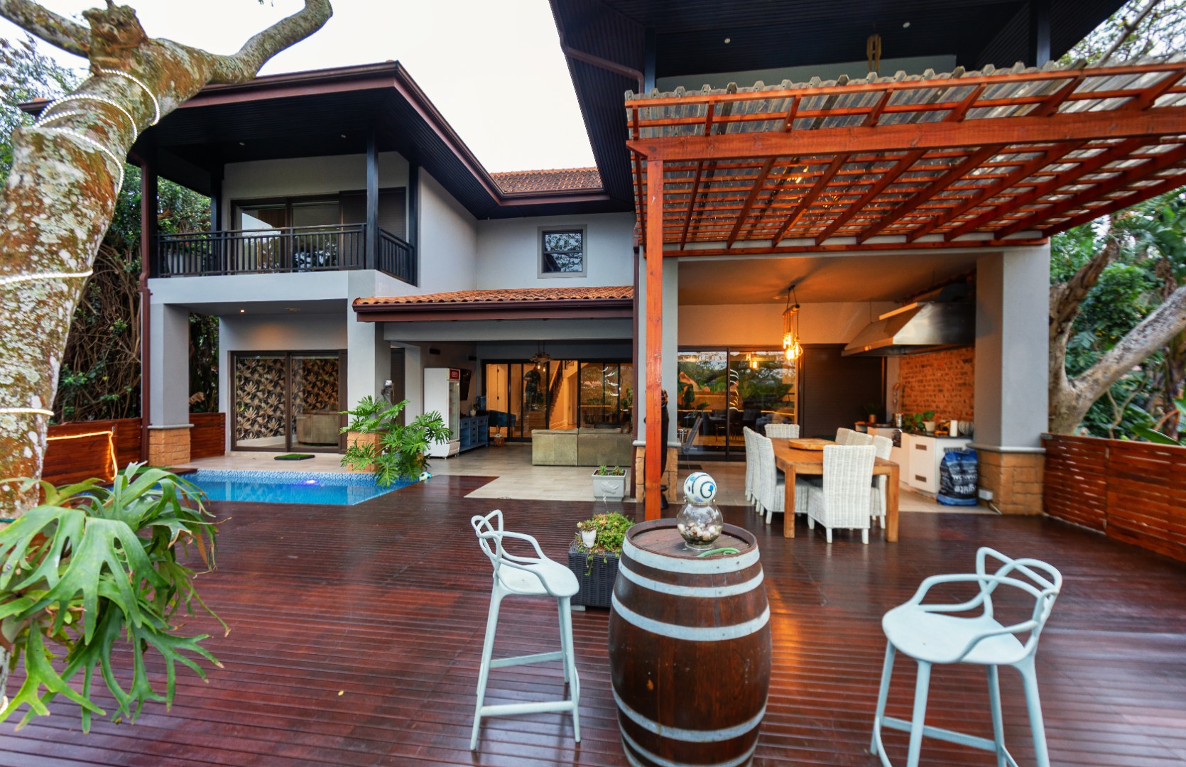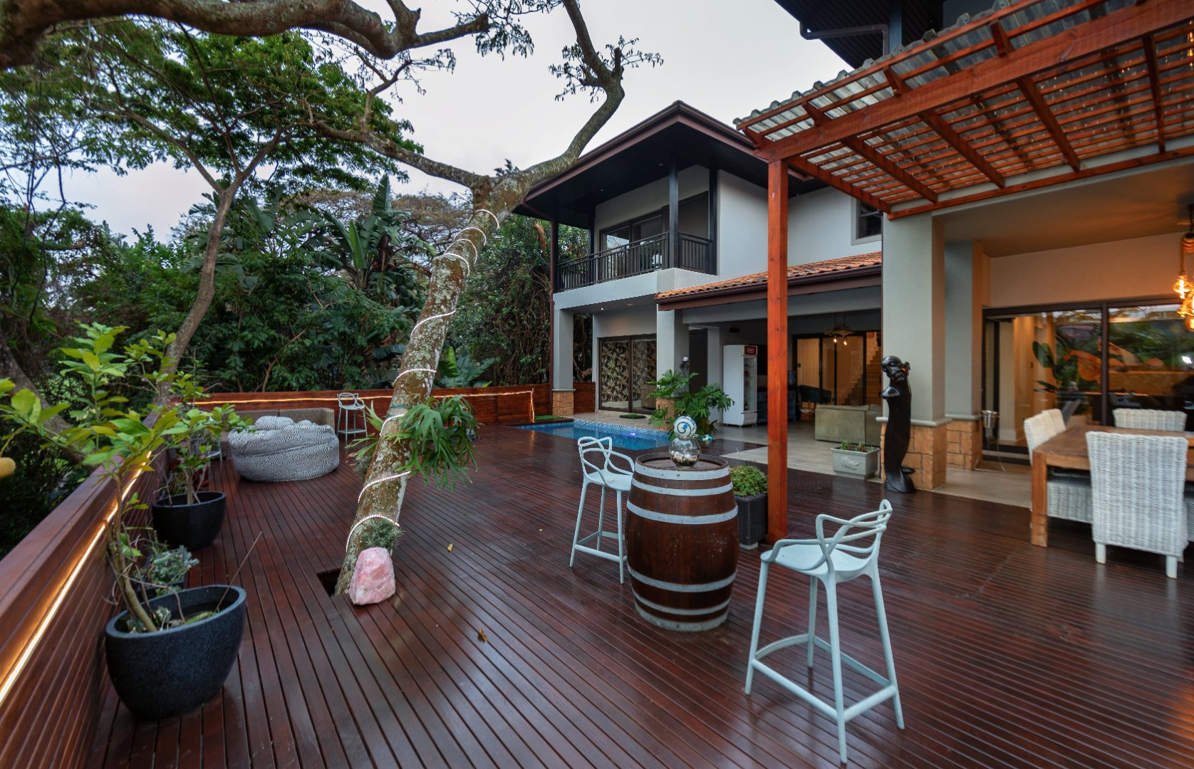 This amazing home is ideally suited for entertaining and family time. Modernised and beautifully appointed, this spacious home set on two levels. embraces the ultimate in Zimbali indoor/outdoor seamless living. The open plan lounge, dining room, TV lounge feeds seamlessly onto a large spacious deck as well as an undercover veranda and built in braai. The dimensions of the deck this size are seldom seen and cleverly planned destinations create spaces for a swimming pool, jacuzzi,outside lounge,bar area,undercover built in braai and undercover lounge area,creating the most amazing entertainment spaces for family and friends. Located on the fairway of the famous Zimbali Golf Course an atmosphere of pure tranquility has been created in this wonderful home.