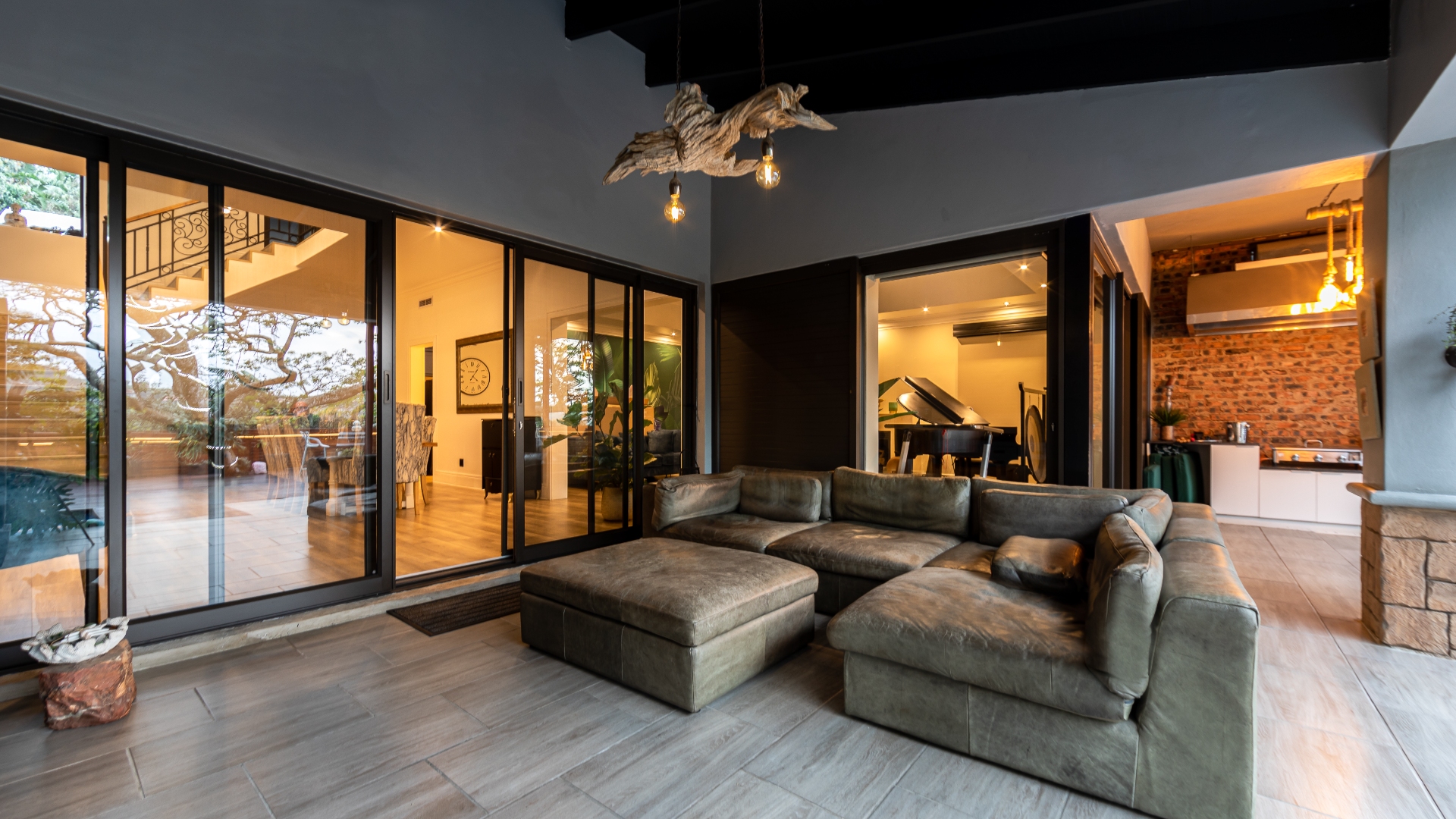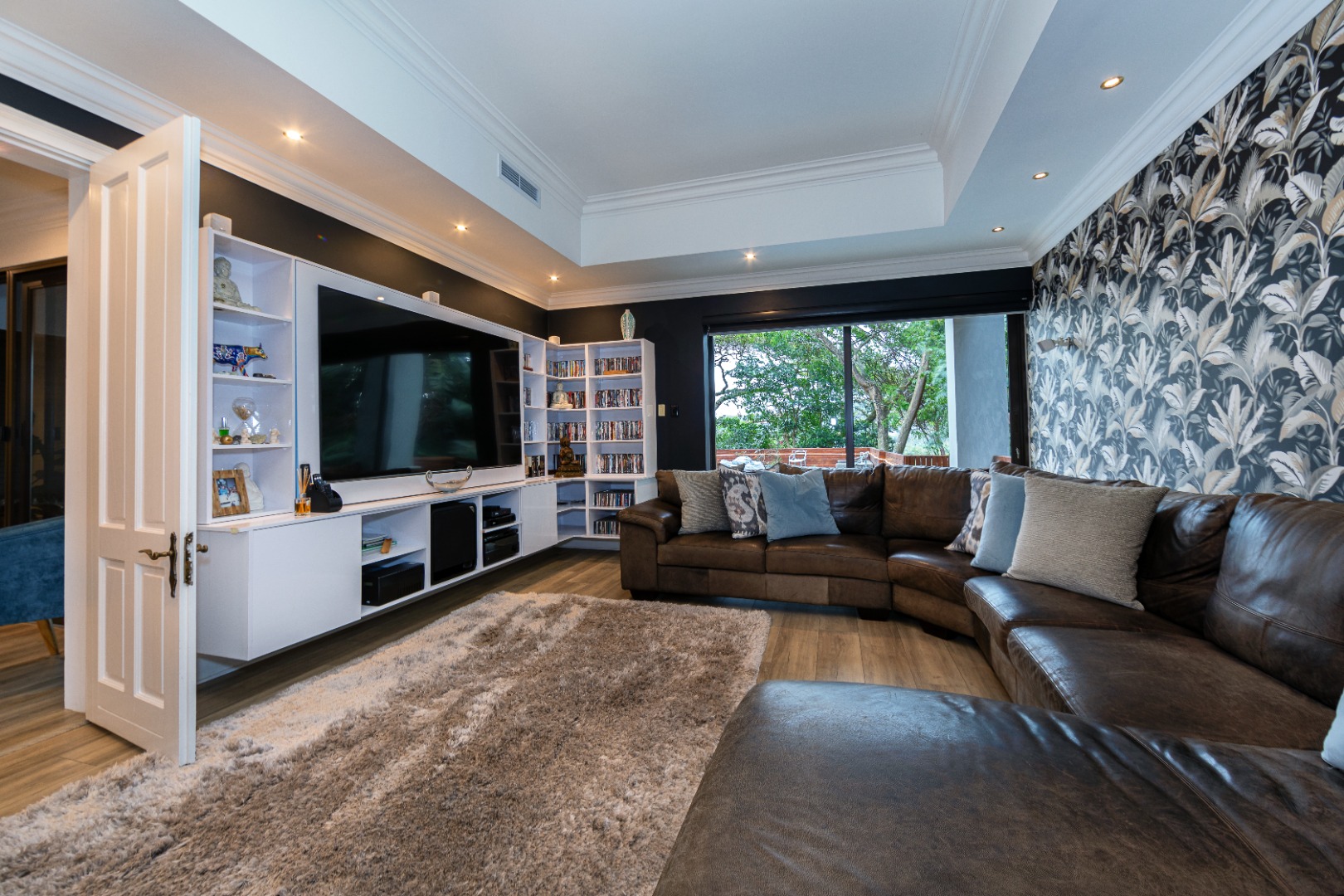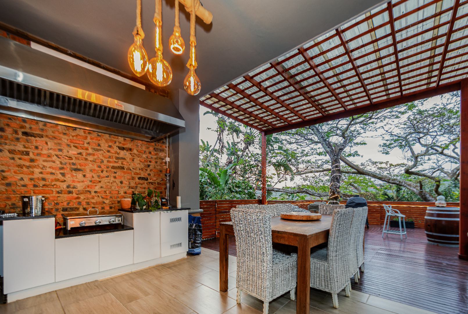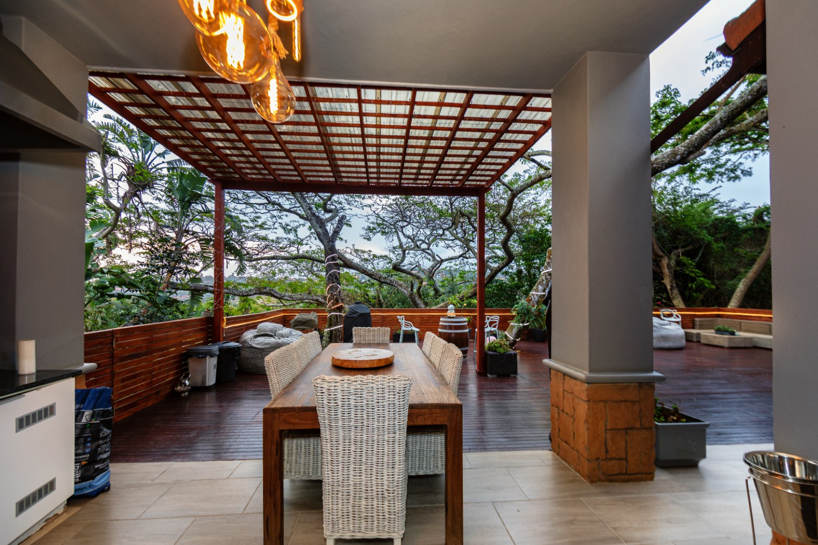 This amazing home is ideally suited for entertaining and family time. Modernised and beautifully appointed, this spacious home set on two levels. embraces the ultimate in Zimbali indoor/outdoor seamless living. The open plan lounge, dining room, TV lounge feeds seamlessly onto a large spacious deck as well as an undercover veranda and built in braai. The dimensions of the deck this size are seldom seen and cleverly planned destinations create spaces for a swimming pool, jacuzzi,outside lounge,bar area,undercover built in braai and undercover lounge area,creating the most amazing entertainment spaces for family and friends. Located on the fairway of the famous Zimbali Golf Course an atmosphere of pure tranquility has been created in this wonderful home.