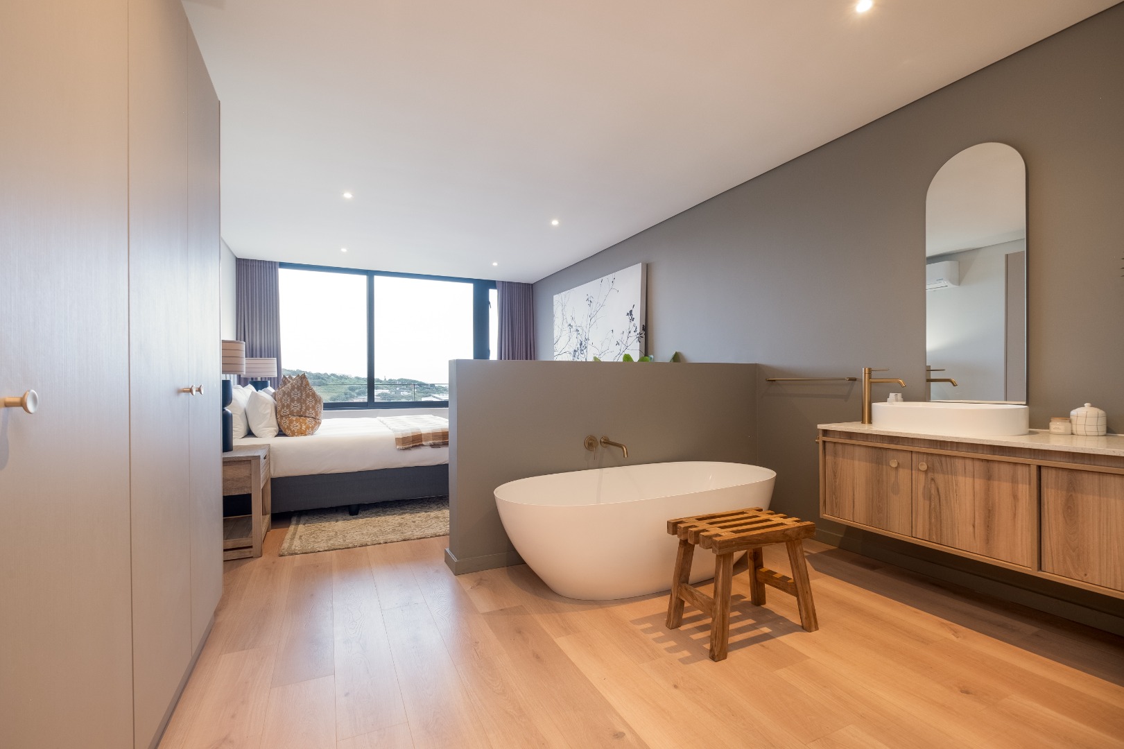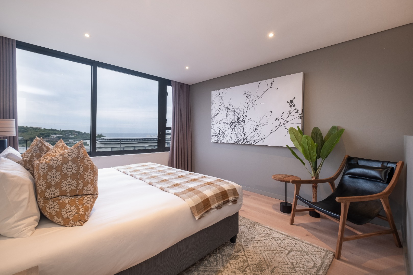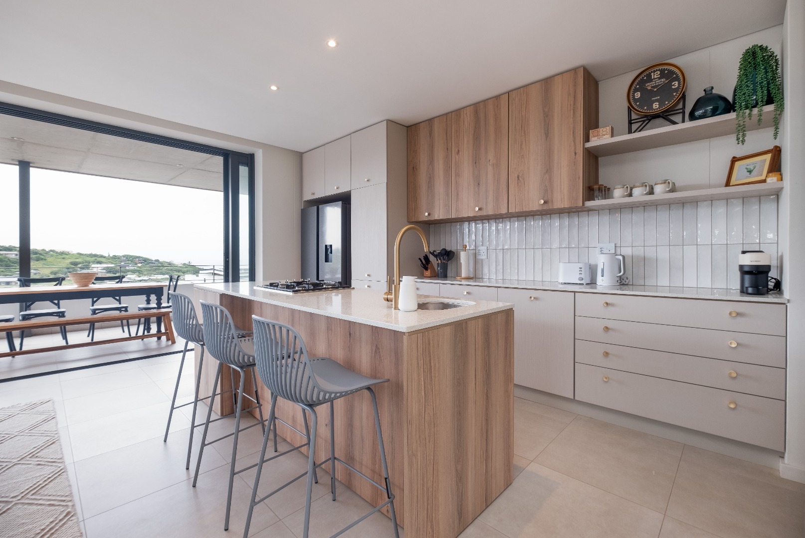 Floor-to-ceiling stacking doors blur the boundaries between inside and out, bathing interiors in light and allowing gentle sea breezes to animate every living space. The vast living and kitchen area — complete with a scullery — flows seamlessly onto an expansive balcony with sweeping ocean views, ideal for entertaining or al fresco dining. On the opposite side, this main living space opens onto a private garden retreat for added serenity.