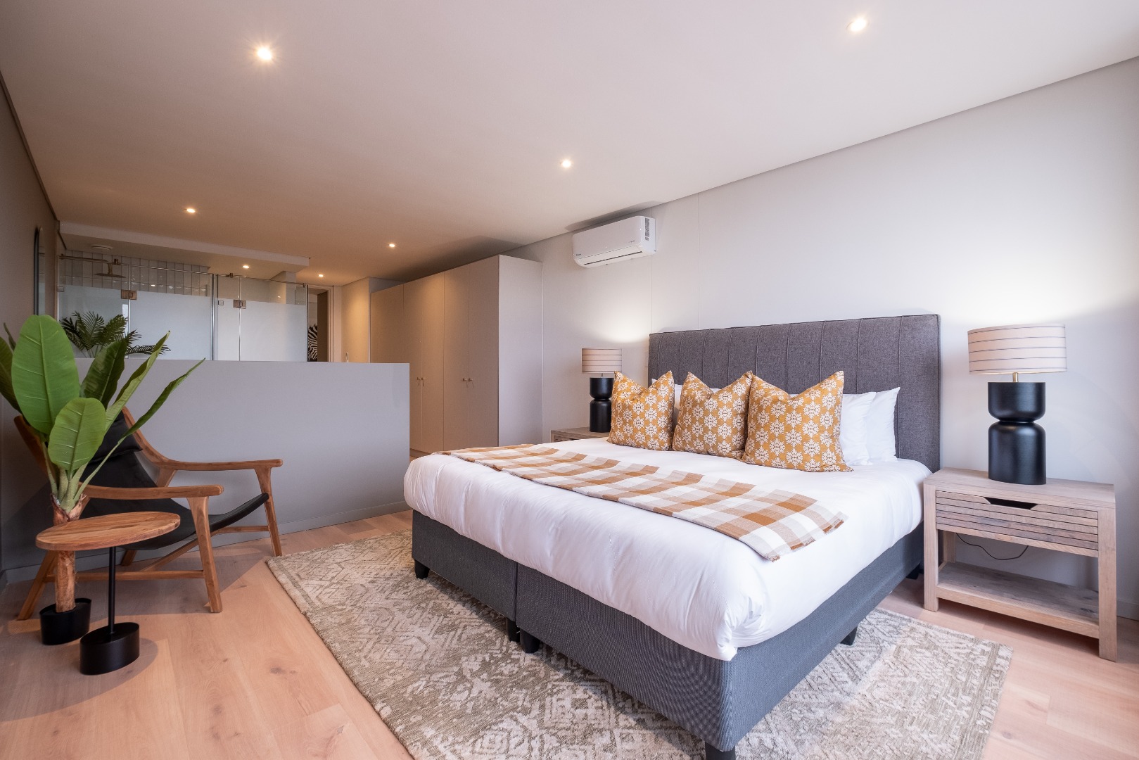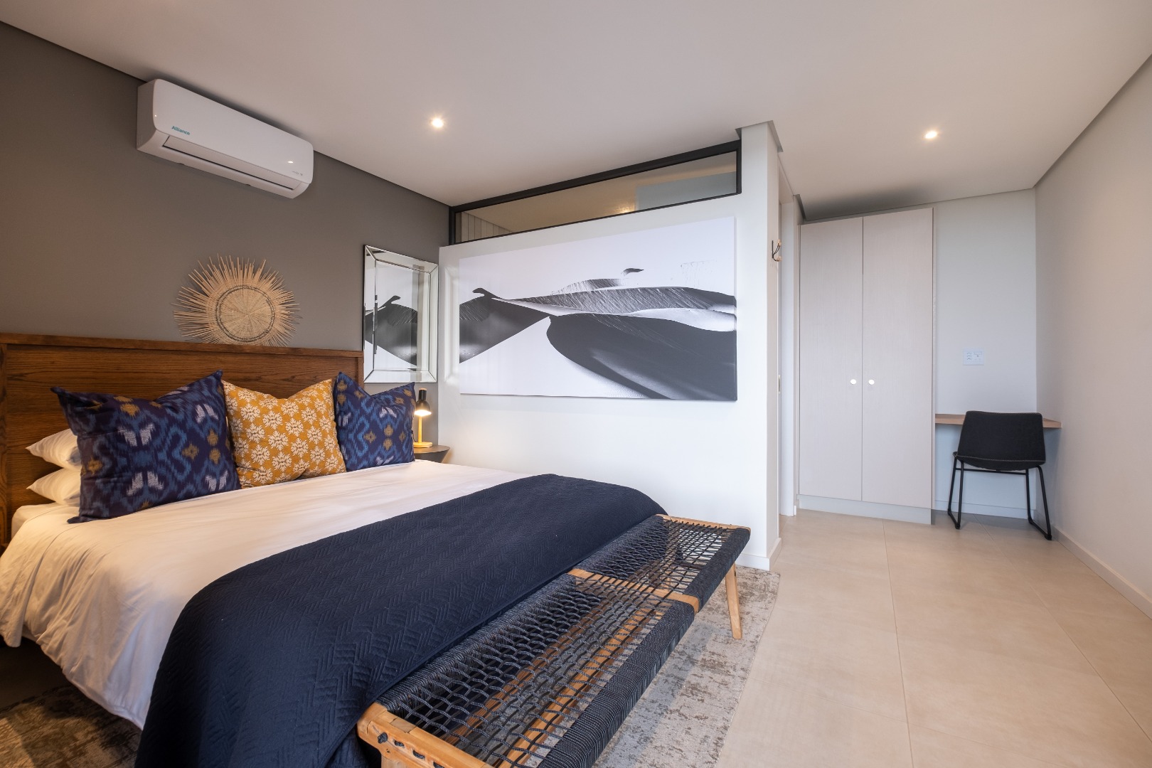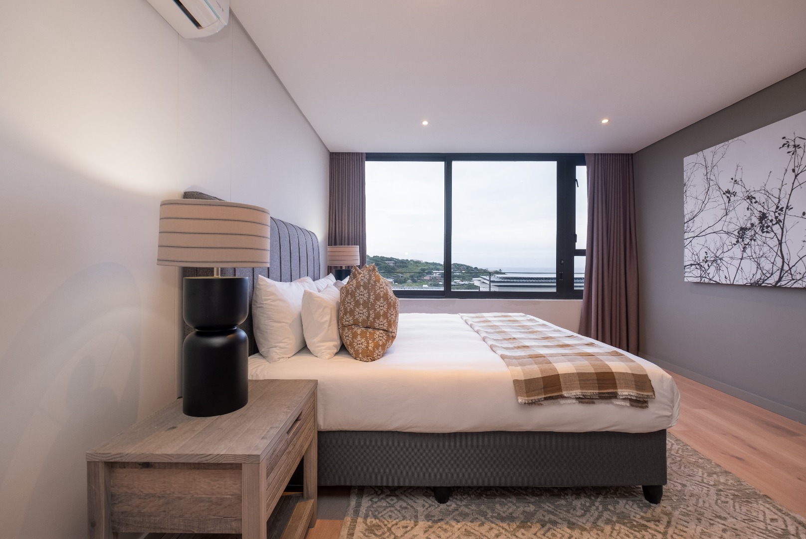 Floor-to-ceiling stacking doors blur the boundaries between inside and out, bathing interiors in light and allowing gentle sea breezes to animate every living space. The vast living and kitchen area — complete with a scullery — flows seamlessly onto an expansive balcony with sweeping ocean views, ideal for entertaining or al fresco dining. On the opposite side, this main living space opens onto a private garden retreat for added serenity.