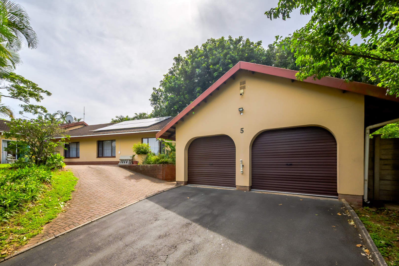 A long brick-paved driveway leads up to the home and detached double garage, with additional paved parking available. The garden is lush and well established, adding to the overall appeal of the property.