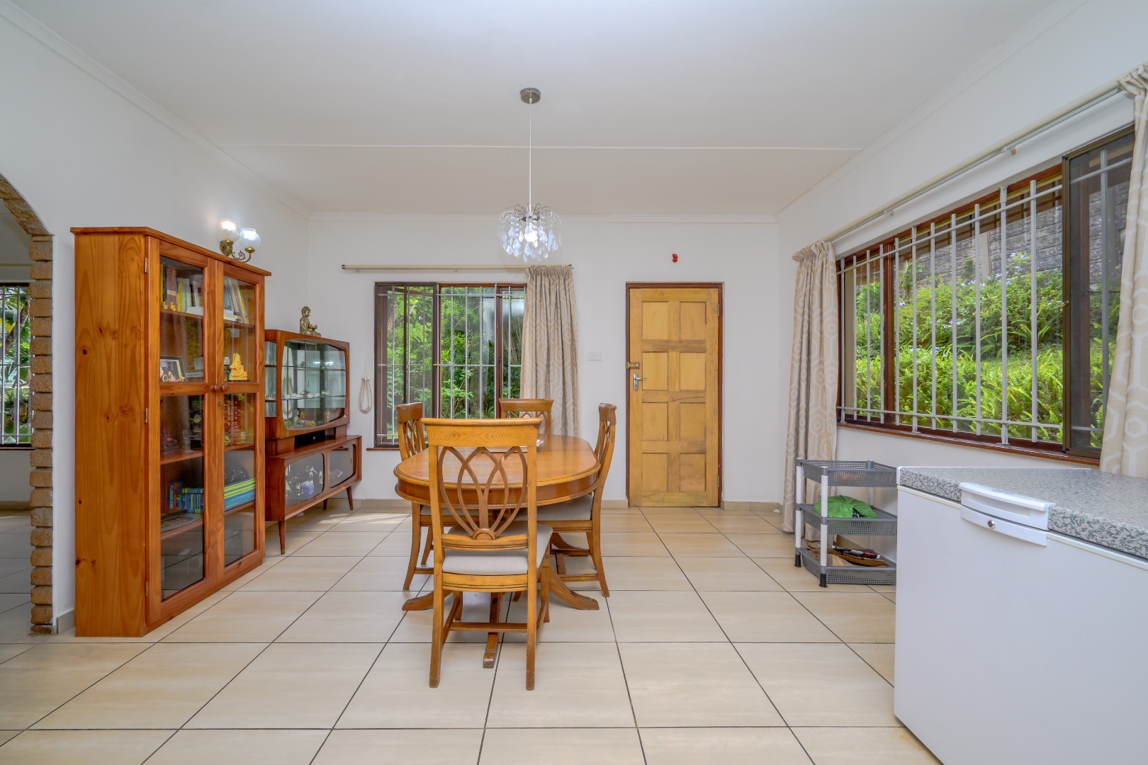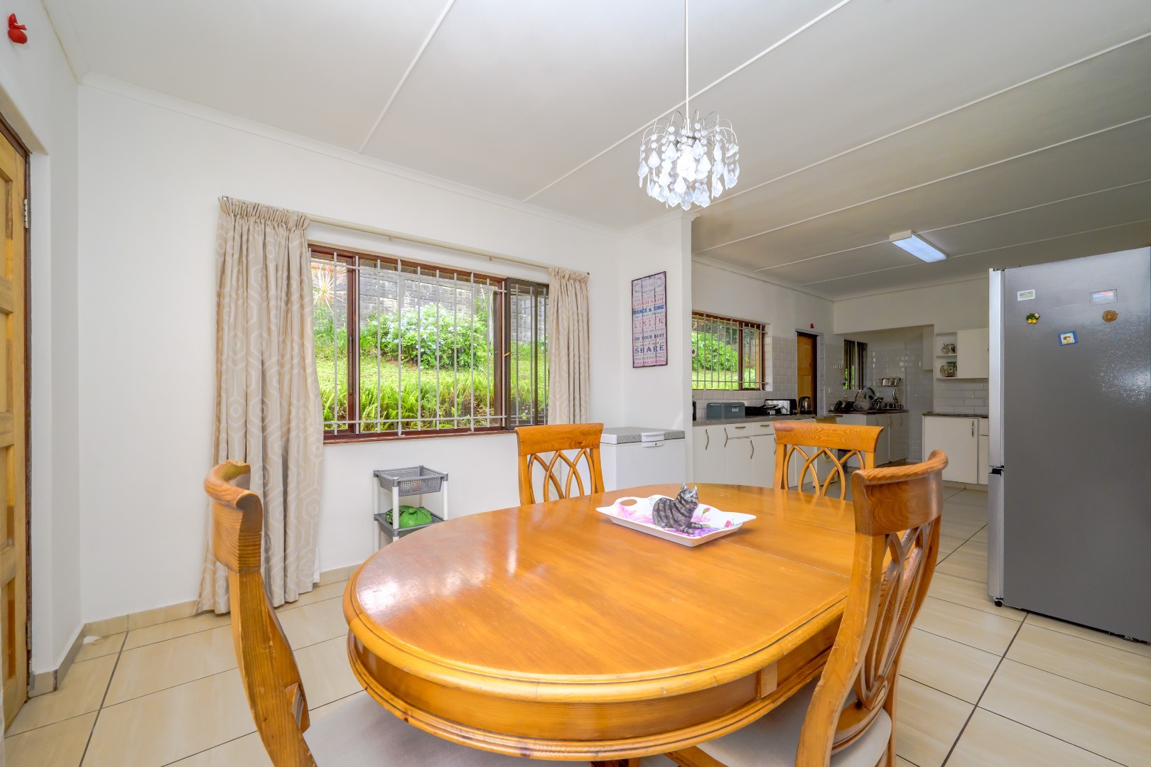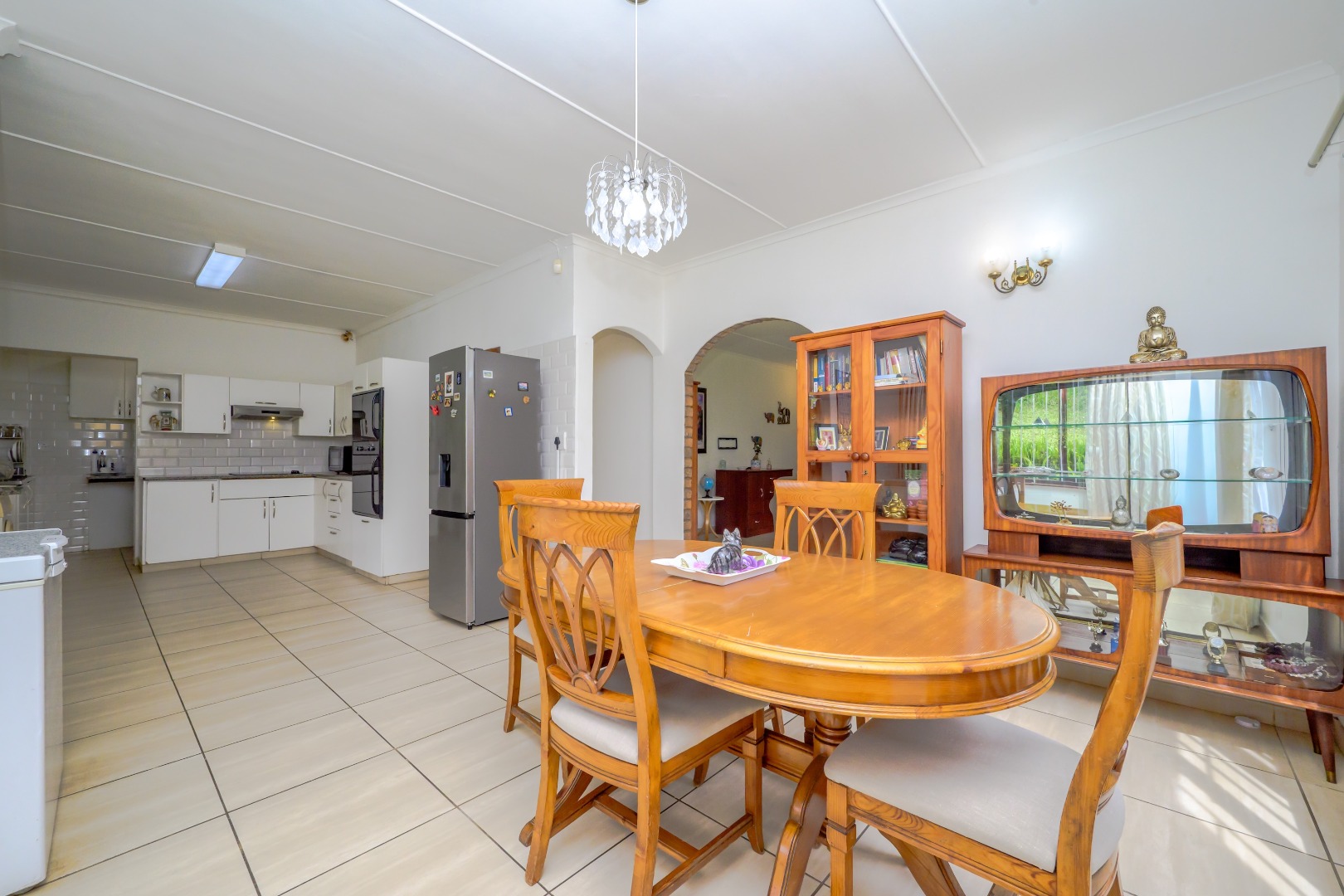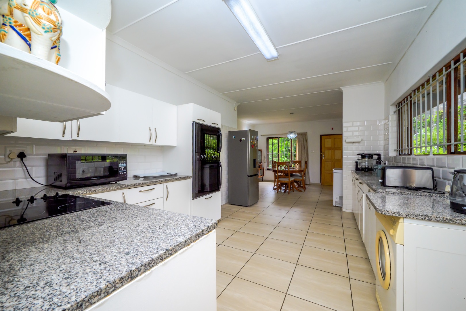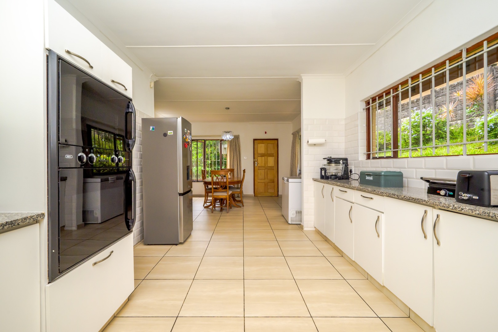 Inside, the home offers a comfortable layout with two lounges and a separate dining room, providing good space for both everyday living and entertaining. The open-plan kitchen flows into the dining area and features white cabinetry, granite countertops, tiled flooring, and built-in eye level oven and hob. The kitchen benefits from large windows that allow plenty of natural light.