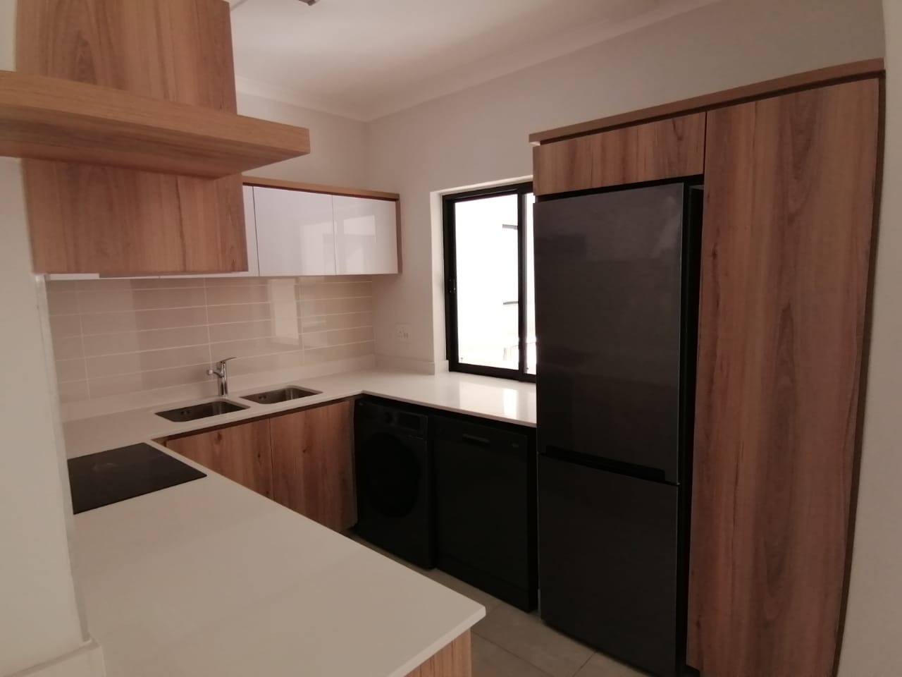 The heart of the home is its open-plan living area, seamlessly connecting to a modern kitchen. The kitchen boasts stylish two-tone cabinetry, light countertops, a built-in hob. Tiled flooring extends throughout the apartment, ensuring easy maintenance and a cohesive look. Each of the three bedrooms features built-in wardrobes, providing ample storage, with one bedroom benefiting from a private en-suite bathroom.