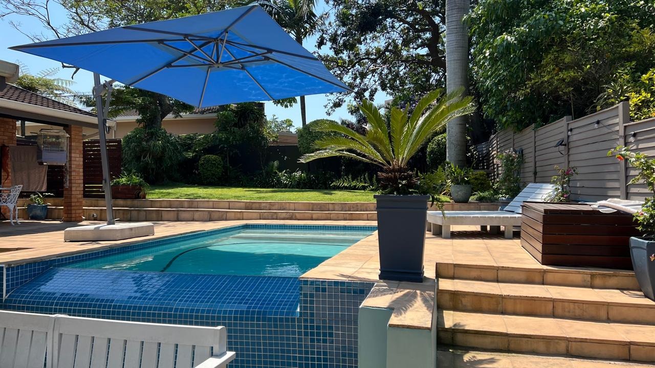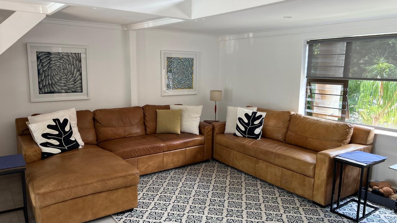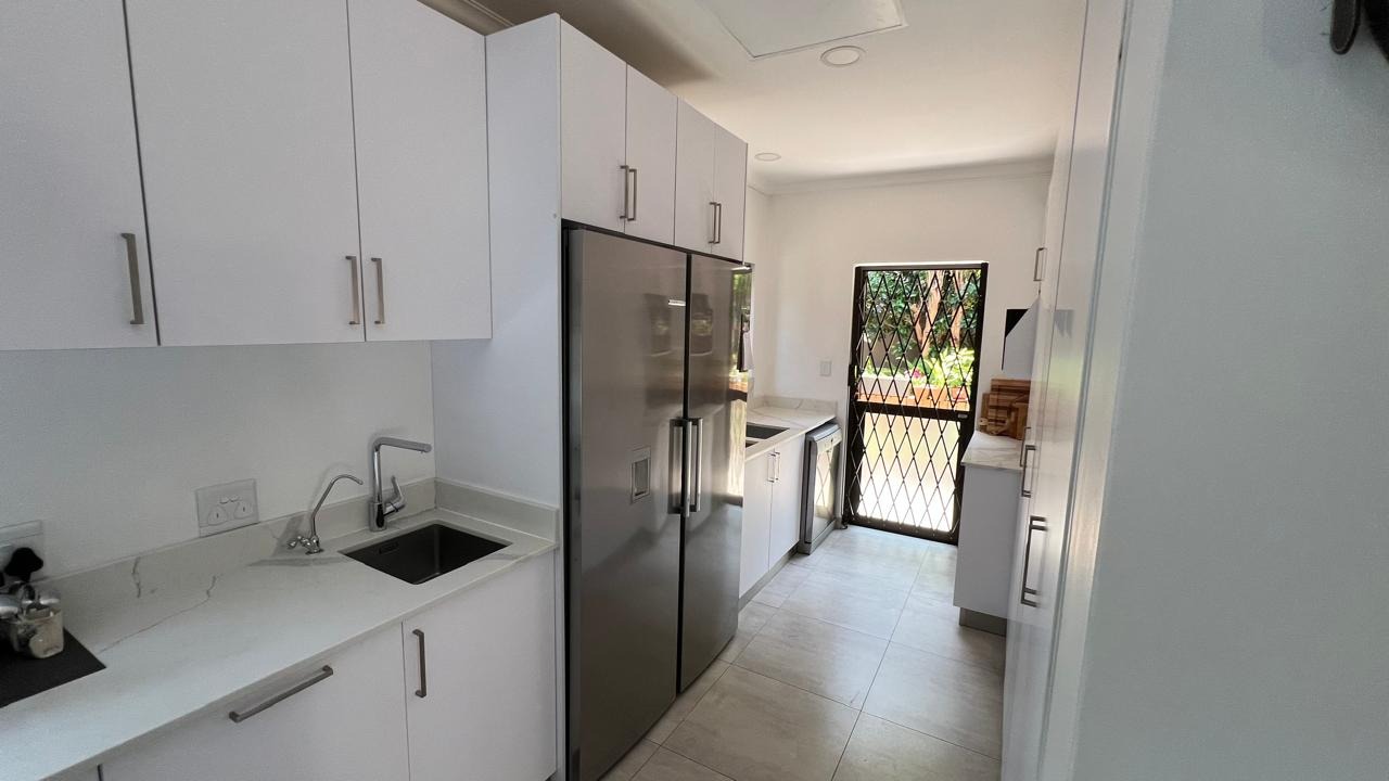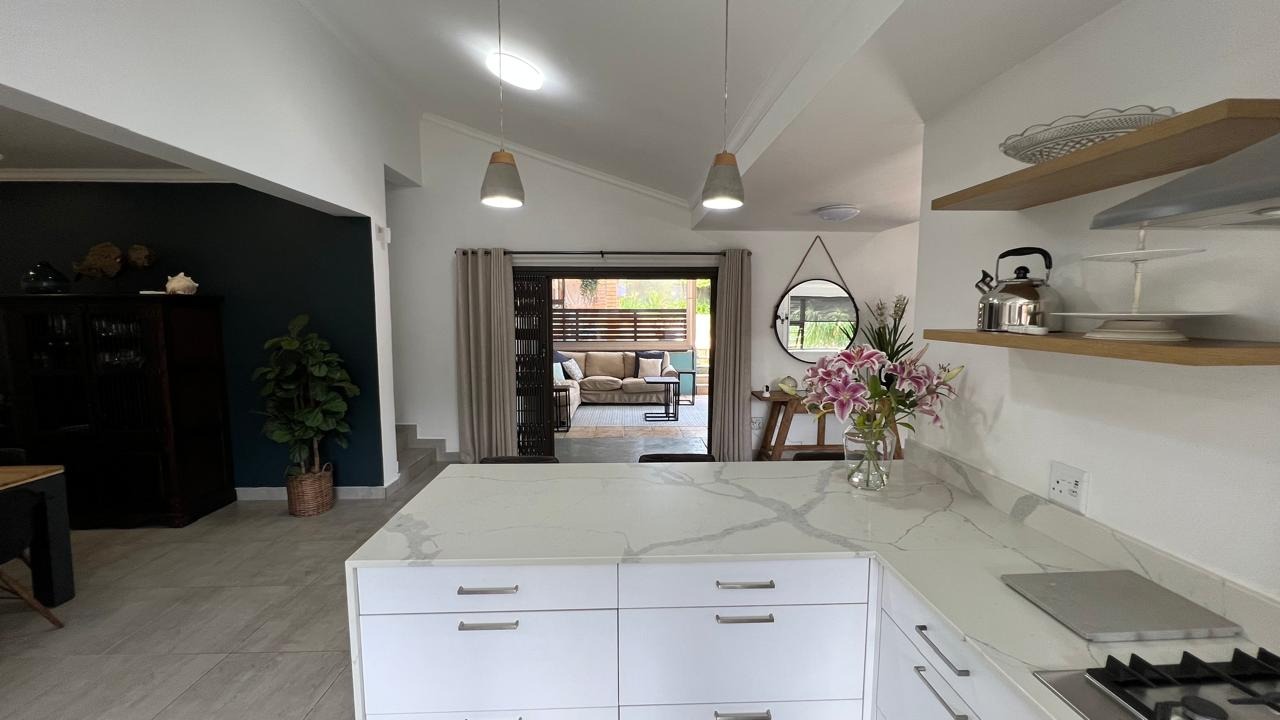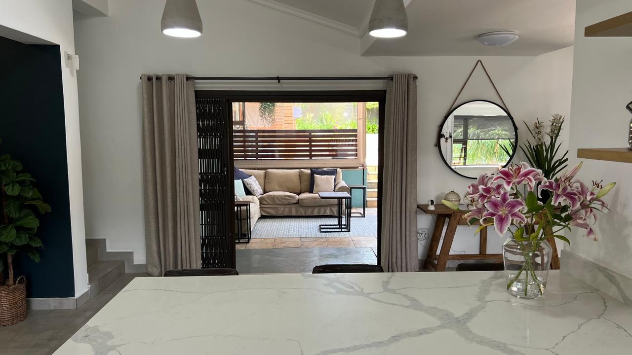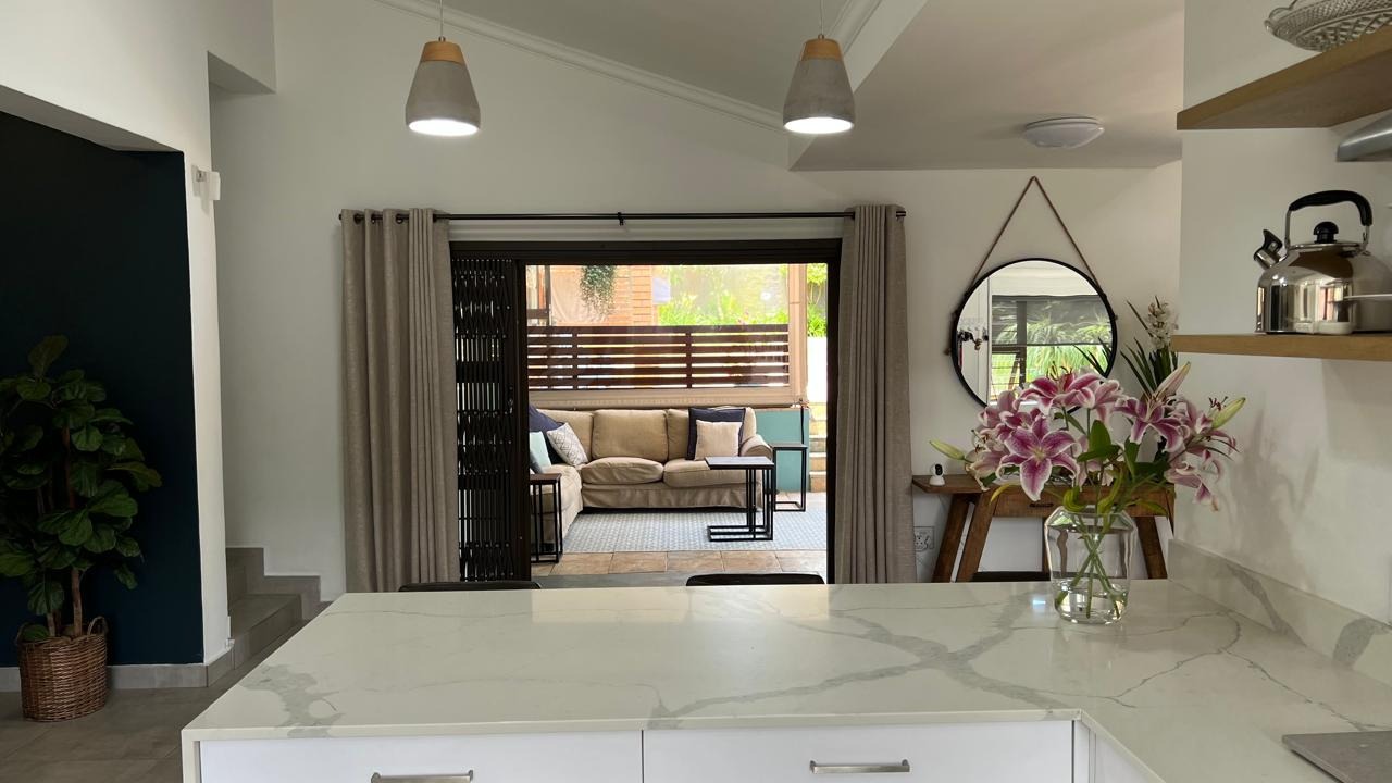 This contemporary 3-bedroom, 2.5-bathroom residence offers an ideal rental opportunity in Ballito Central. The open-plan living area features a modern kitchen with sleek white cabinetry, a large island, and a pantry. This inviting space flows into the dining and lounge areas, enhanced by air conditioning and natural light.
