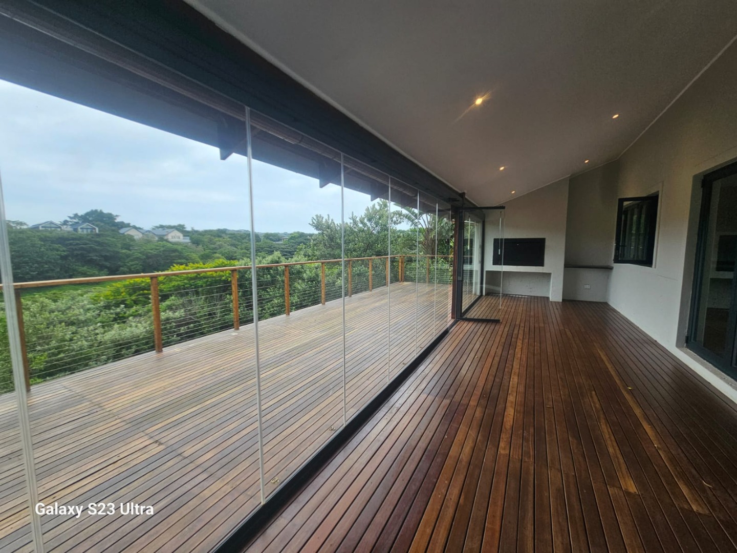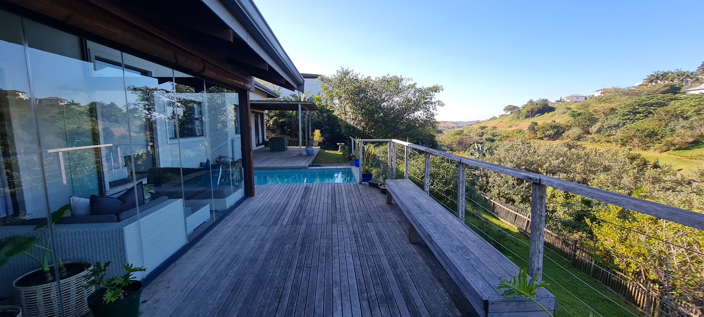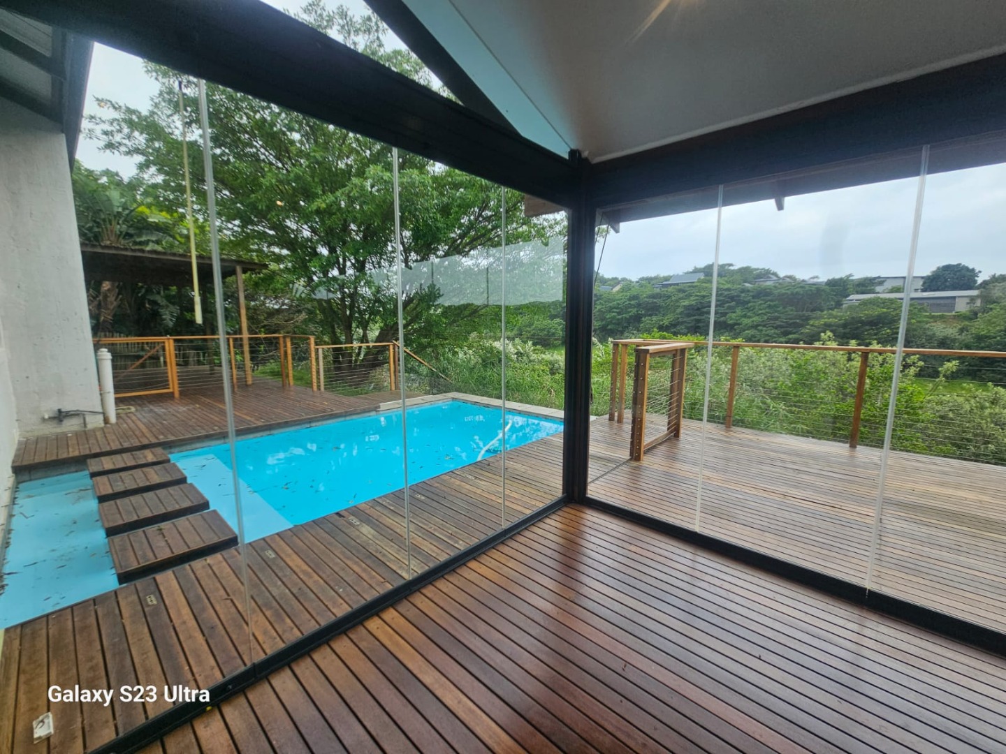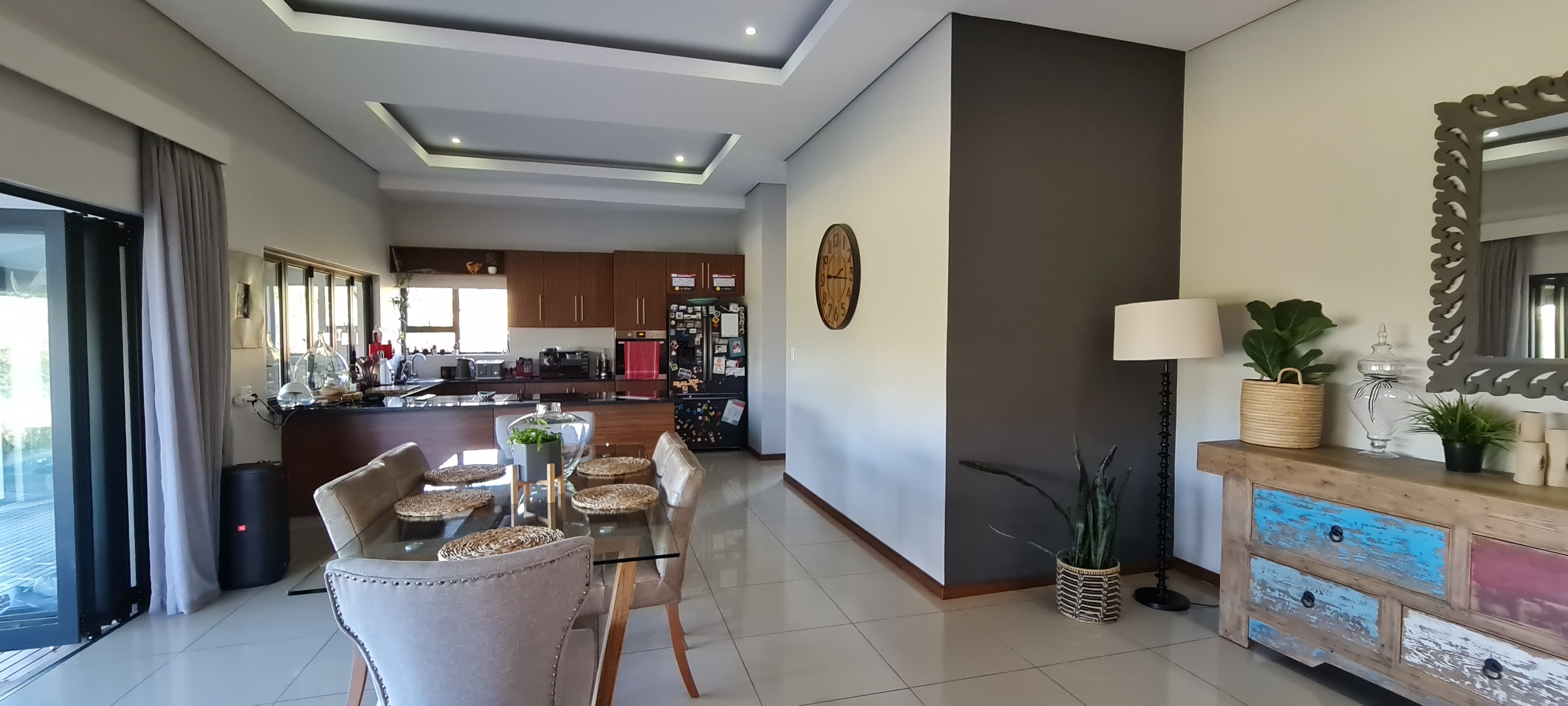 The home features a large open-plan living and dining area with sliding doors leading to an enclosed glass patio that overlooks the golf course and swimming pool.