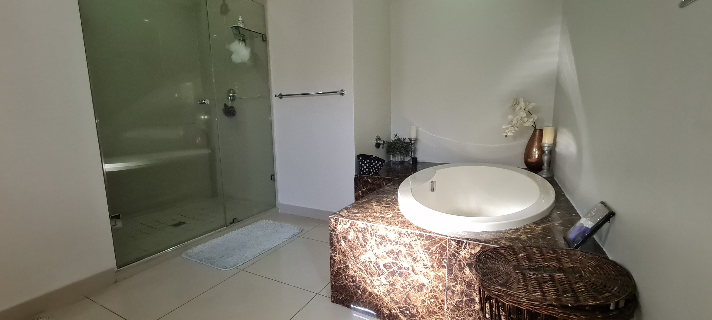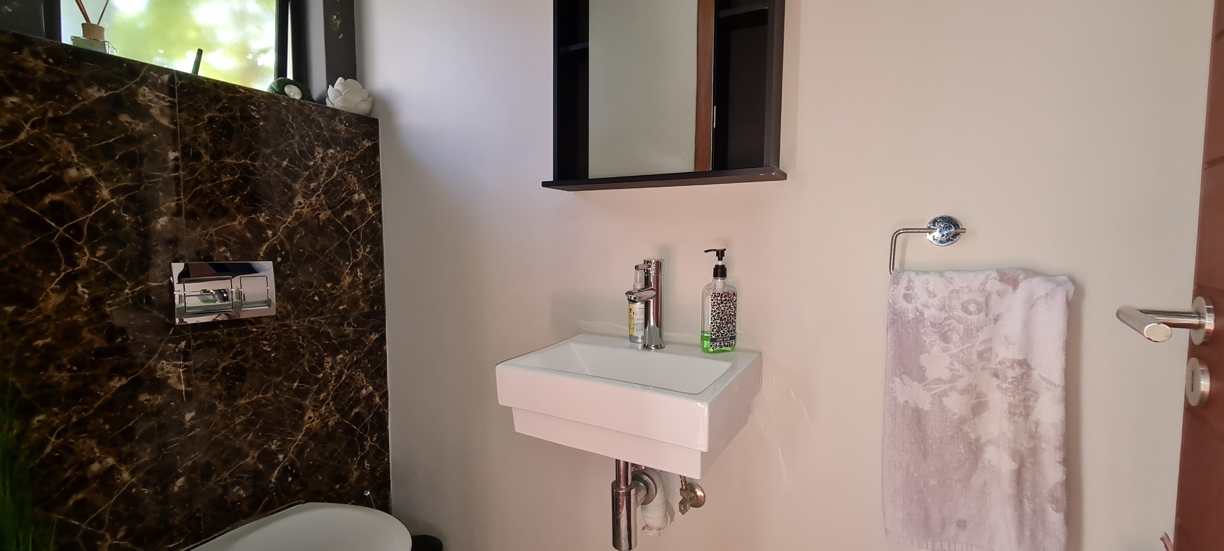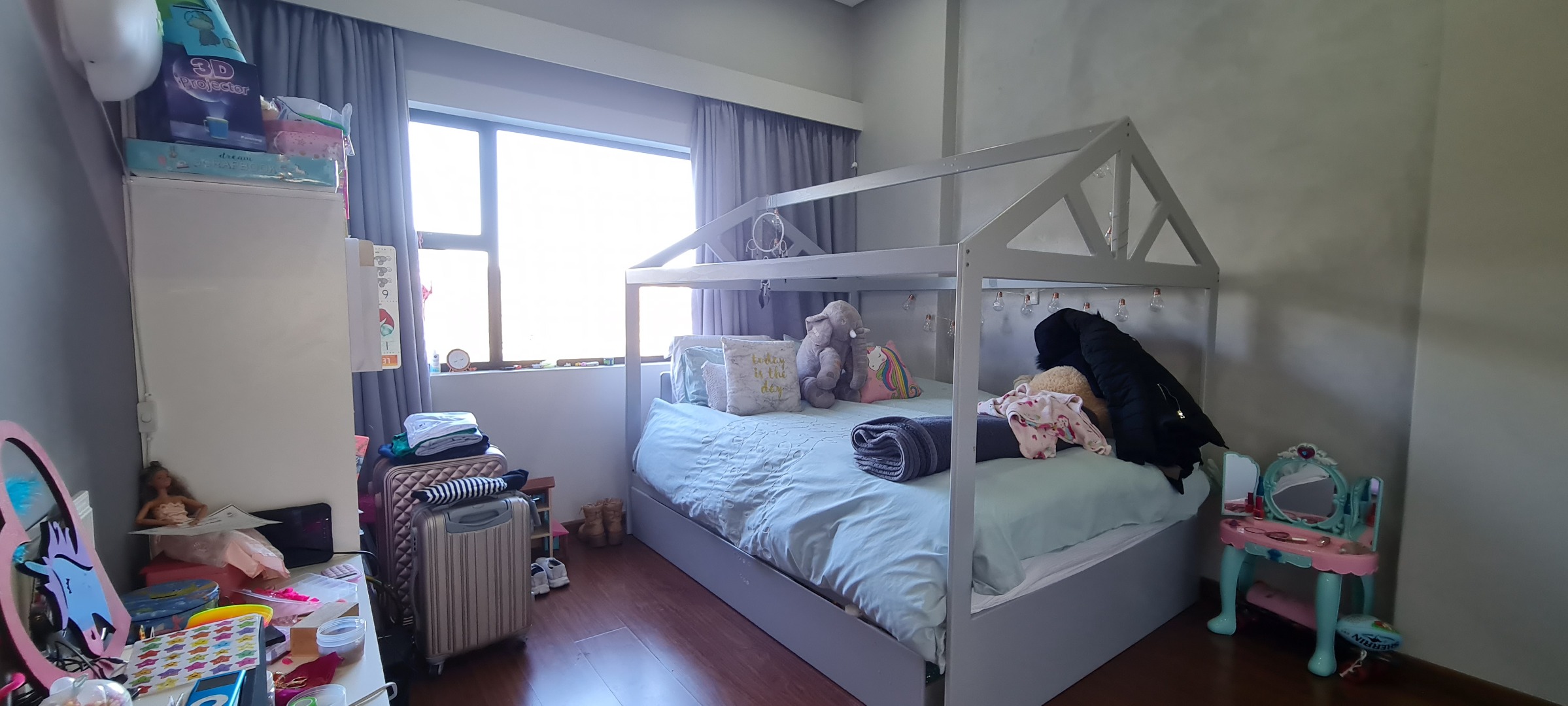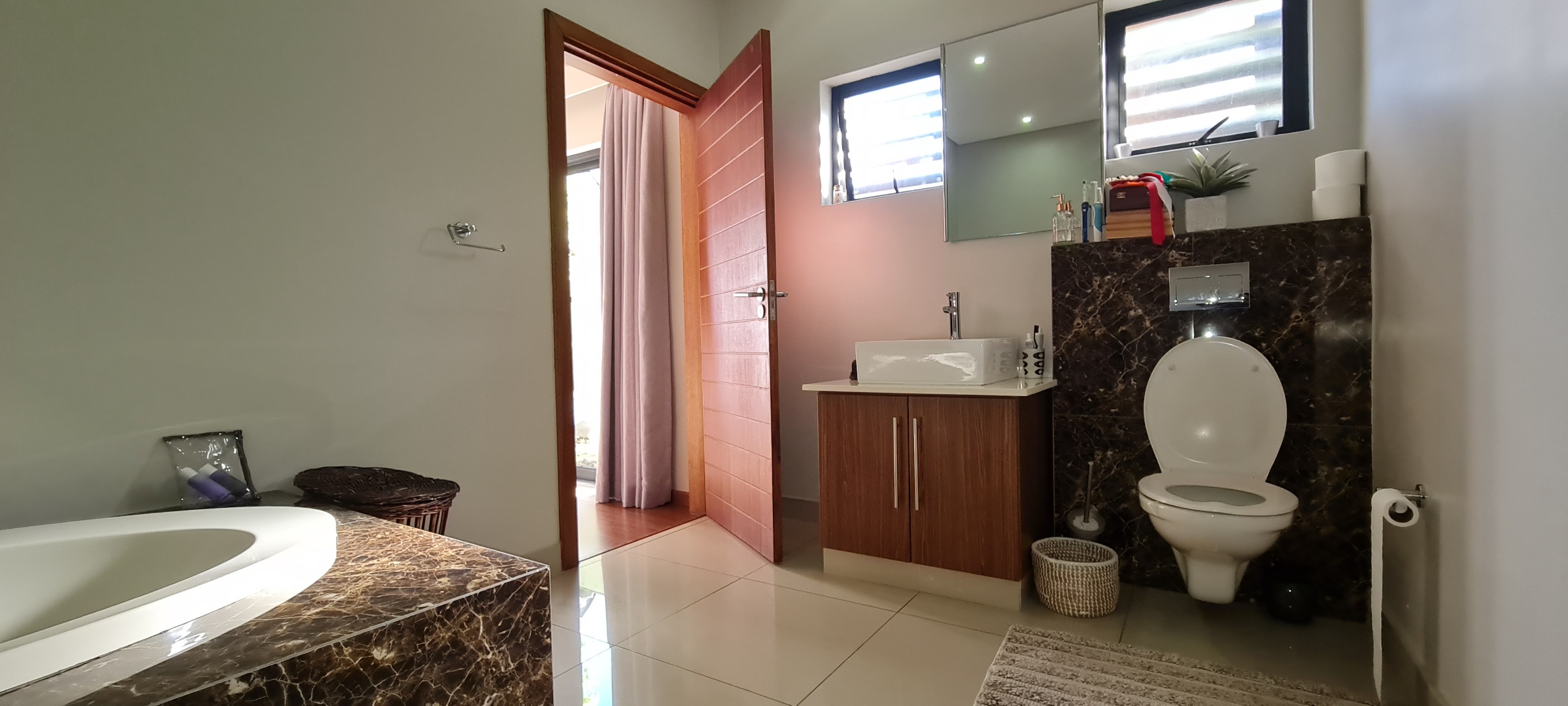 This spacious home offers four family-sized bedrooms. The guest bedroom features sliding doors and a large en-suite bathroom. Two additional bedrooms share a generous family bathroom, while the main bedroom boasts a walk-in closet, a large en-suite bathroom, and sliding doors opening onto a wooden patio.