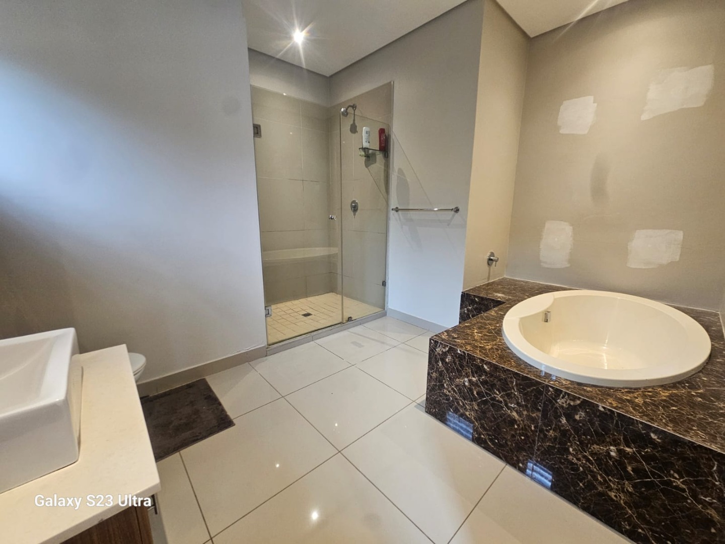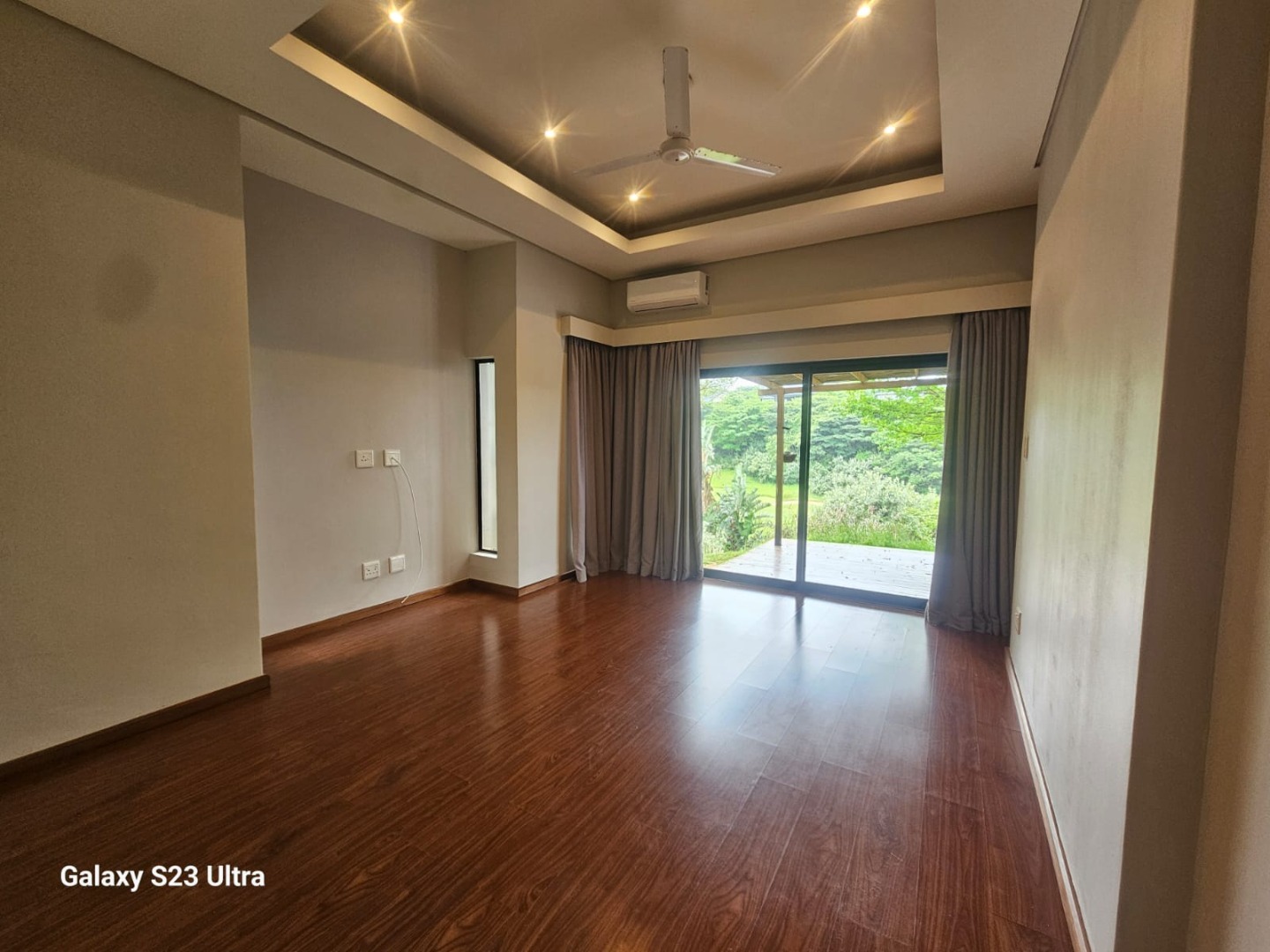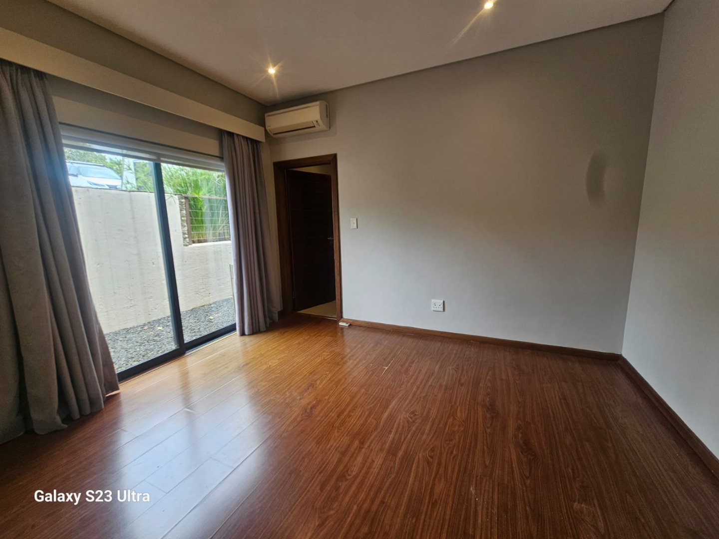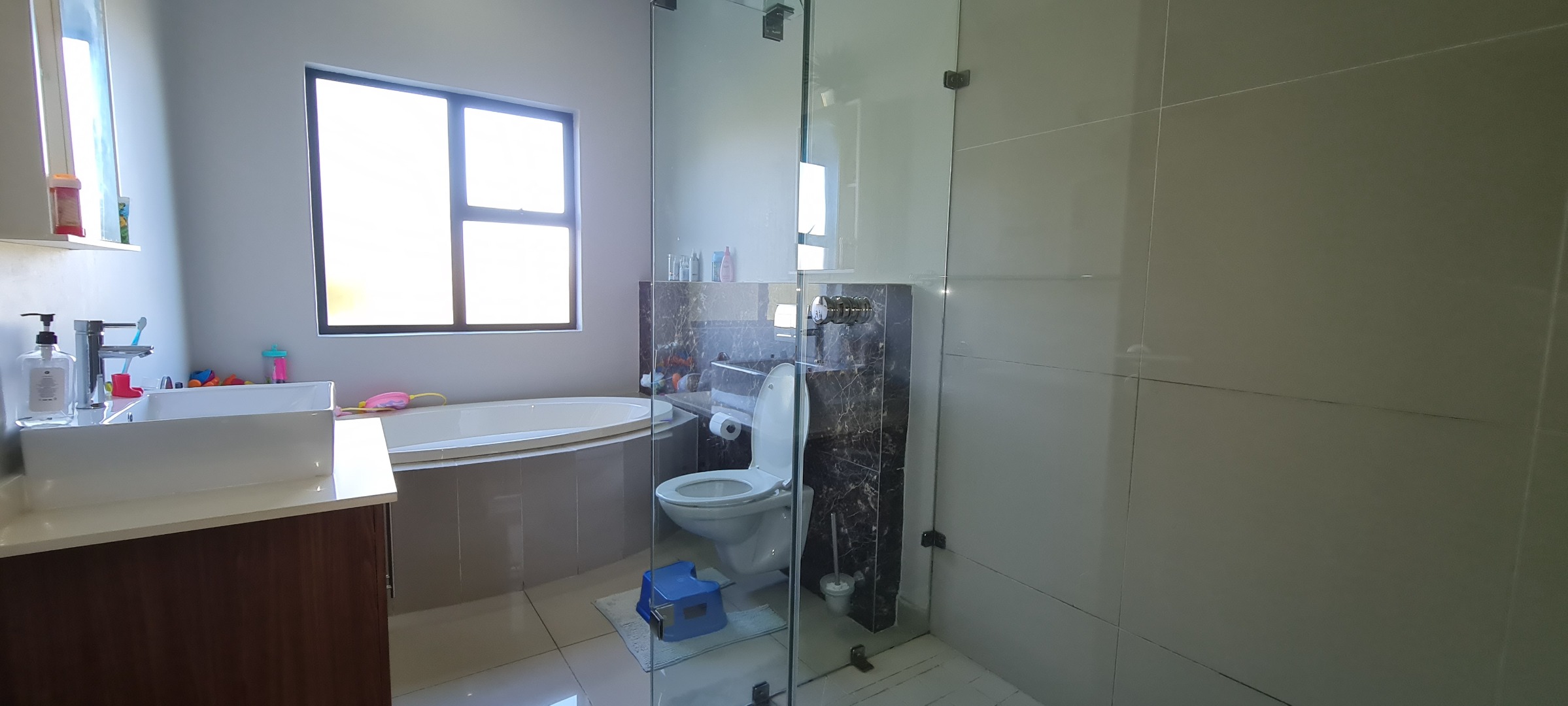 This spacious home offers four family-sized bedrooms. The guest bedroom features sliding doors and a large en-suite bathroom. Two additional bedrooms share a generous family bathroom, while the main bedroom boasts a walk-in closet, a large en-suite bathroom, and sliding doors opening onto a wooden patio.
