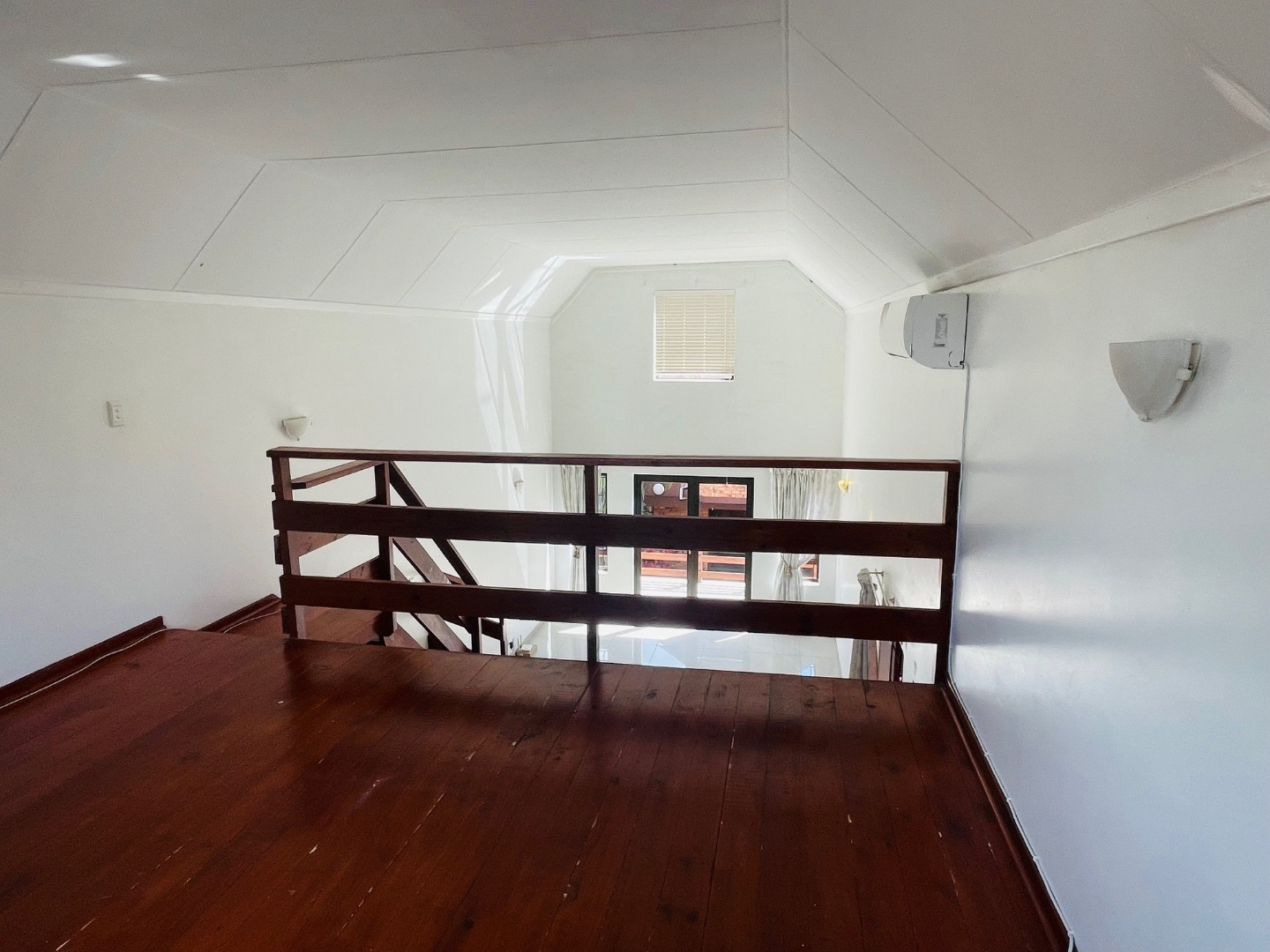 The interior features a spacious 159 sqm floor plan with an open-plan layout, enhanced by high vaulted ceilings and tiled flooring throughout. The main living area includes a lounge and a dining room, providing ample space for both entertaining and daily comfort. An integrated kitchen area is functional and open plan. A prominent wooden staircase leads to a versatile loft area, offering additional living space or a private retreat, complete with an air conditioning unit for year-round comfort.