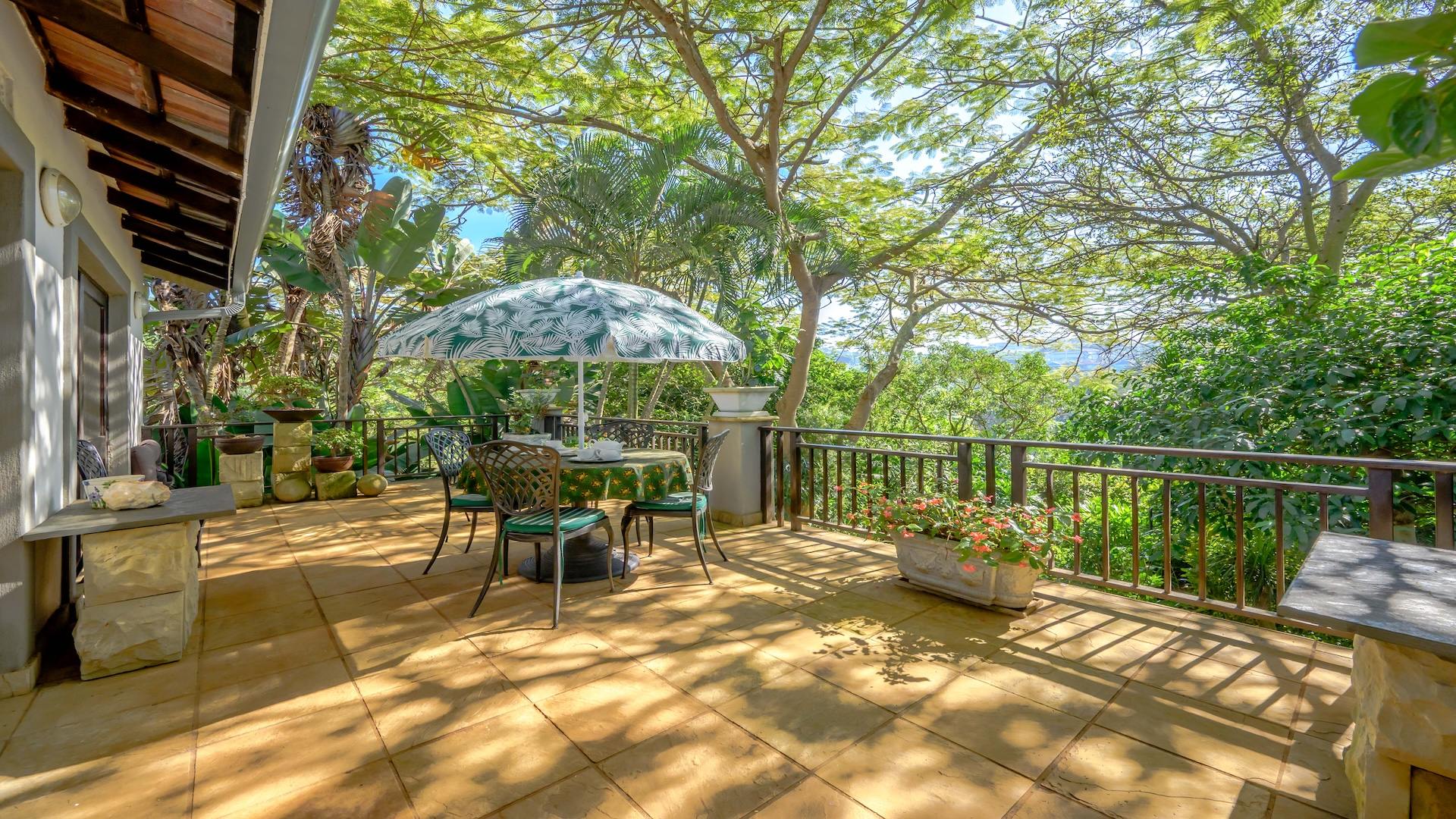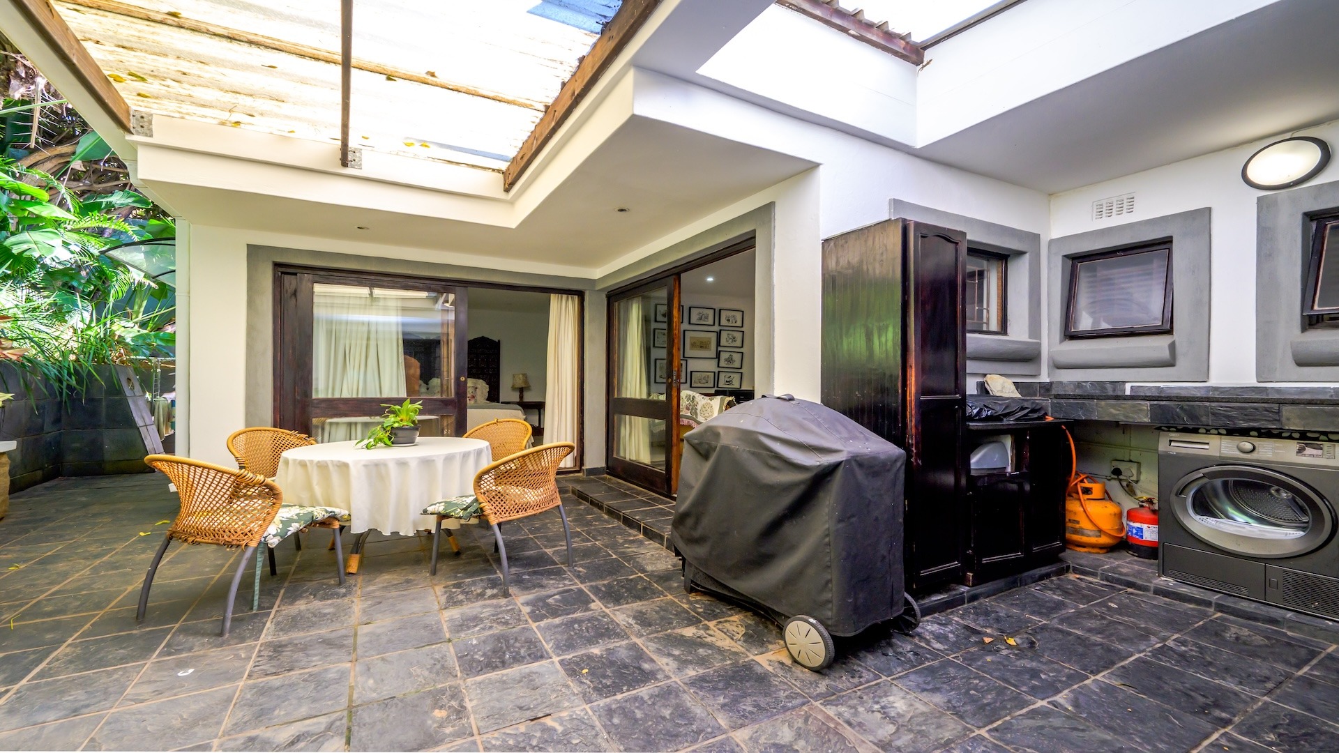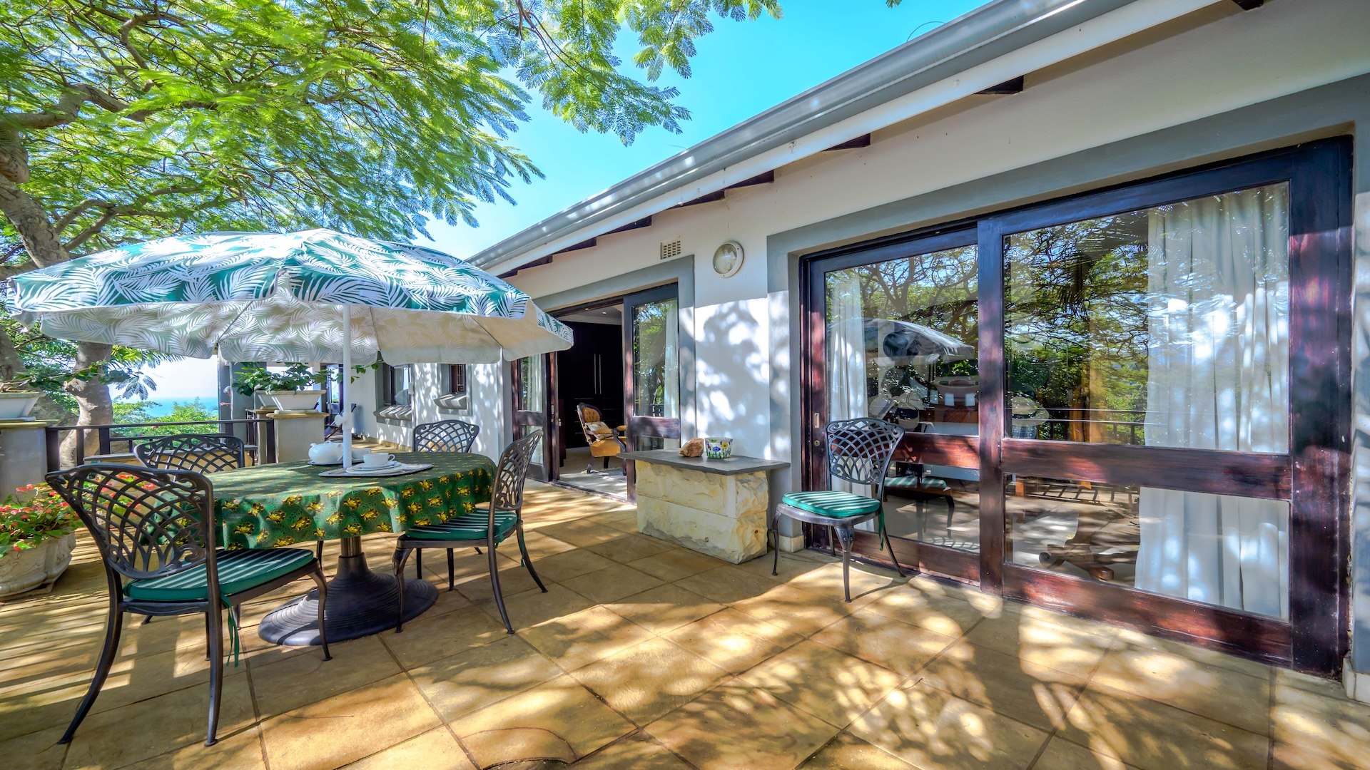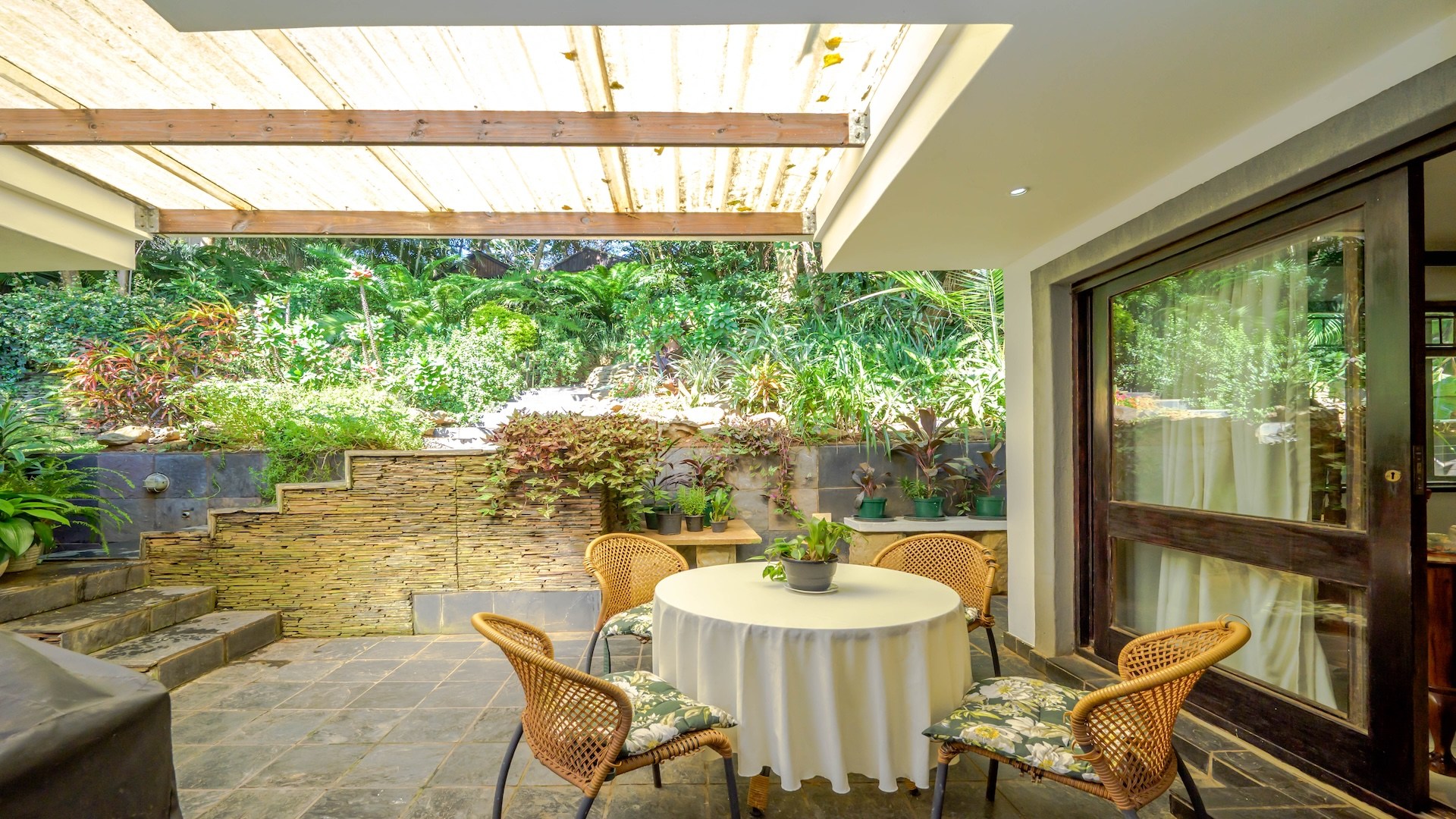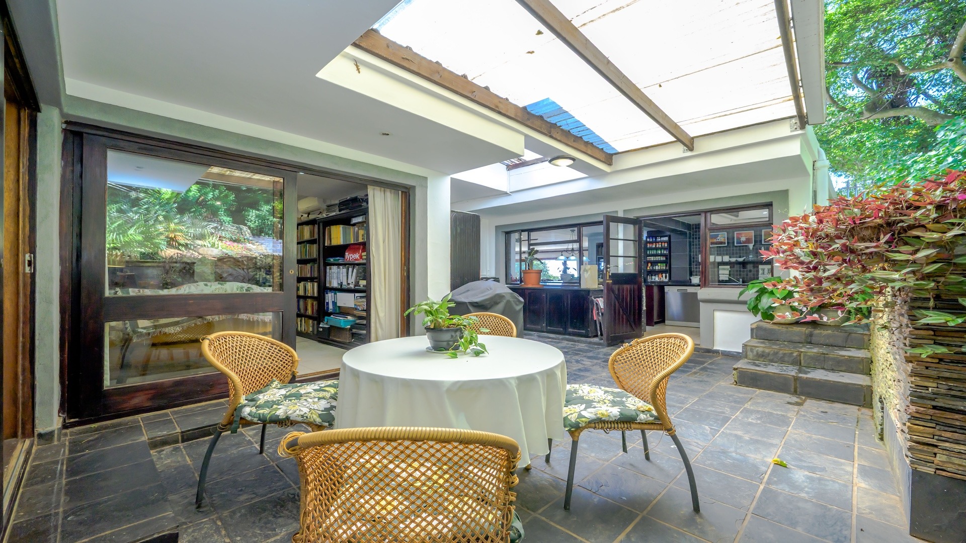 Outdoors, the home is framed by a beautifully established indigenous garden and gorgeous large trees, complete with a built-in braai — perfect for summer evenings. The patio offers breathtaking views, ideal for your morning coffee or evening sundowners. At the back, a slate-surrounded entertainment area awaits with ample space for gatherings.