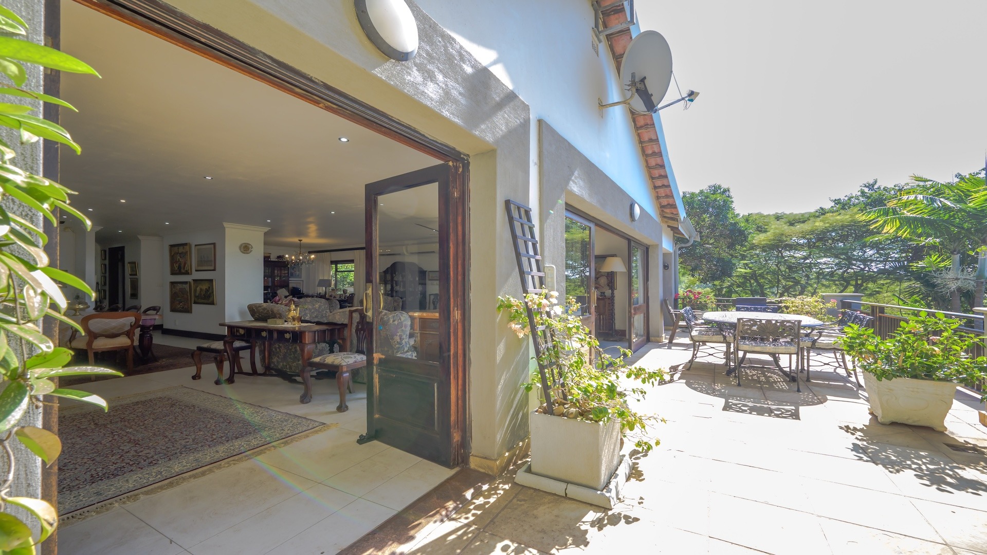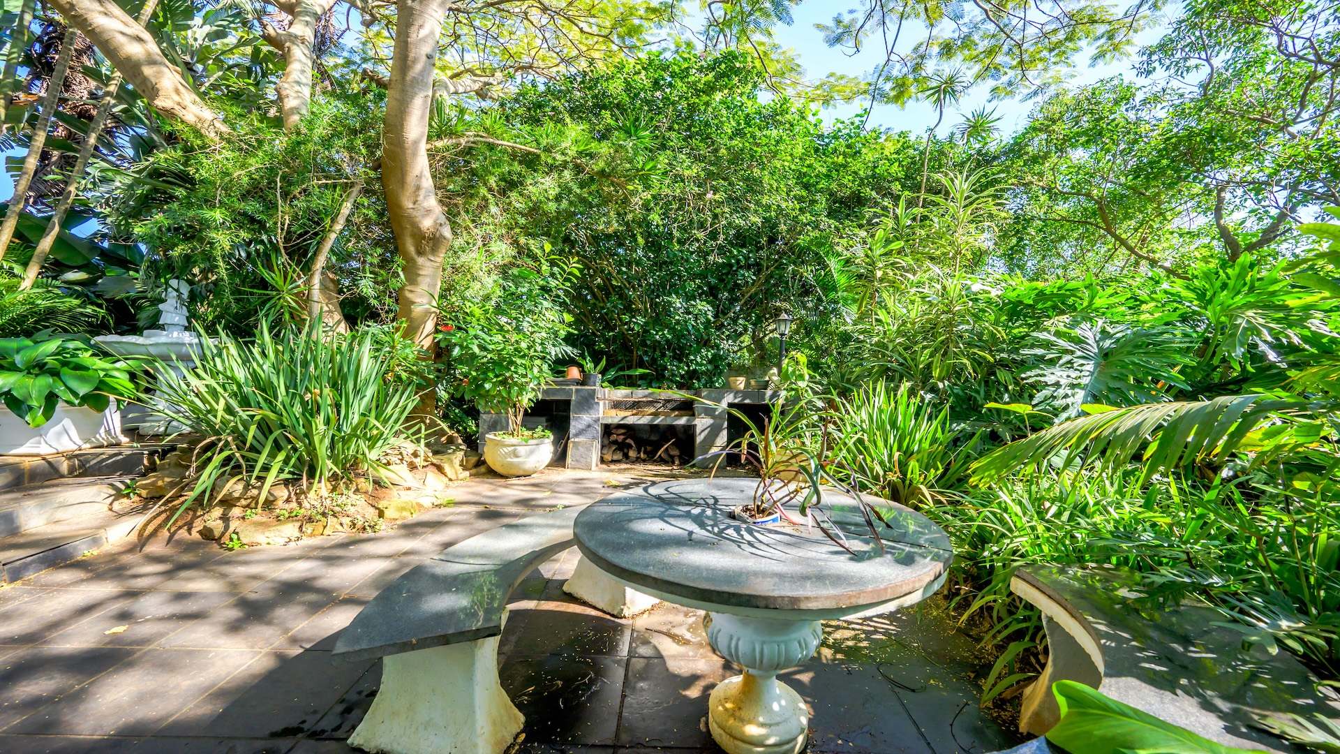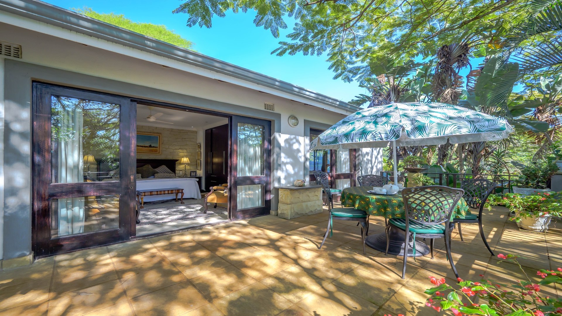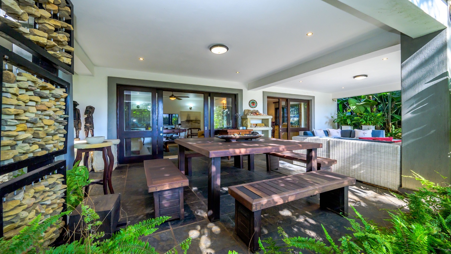 Outdoors, the home is framed by a beautifully established indigenous garden and gorgeous large trees, complete with a built-in braai — perfect for summer evenings. The patio offers breathtaking views, ideal for your morning coffee or evening sundowners. At the back, a slate-surrounded entertainment area awaits with ample space for gatherings.