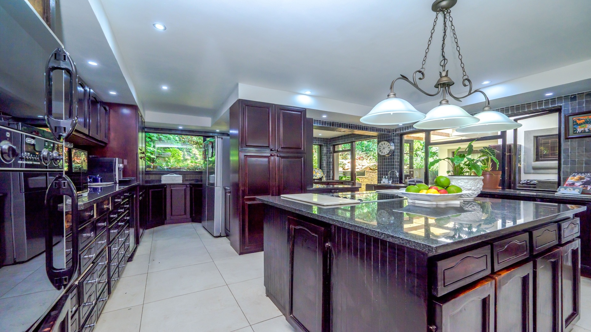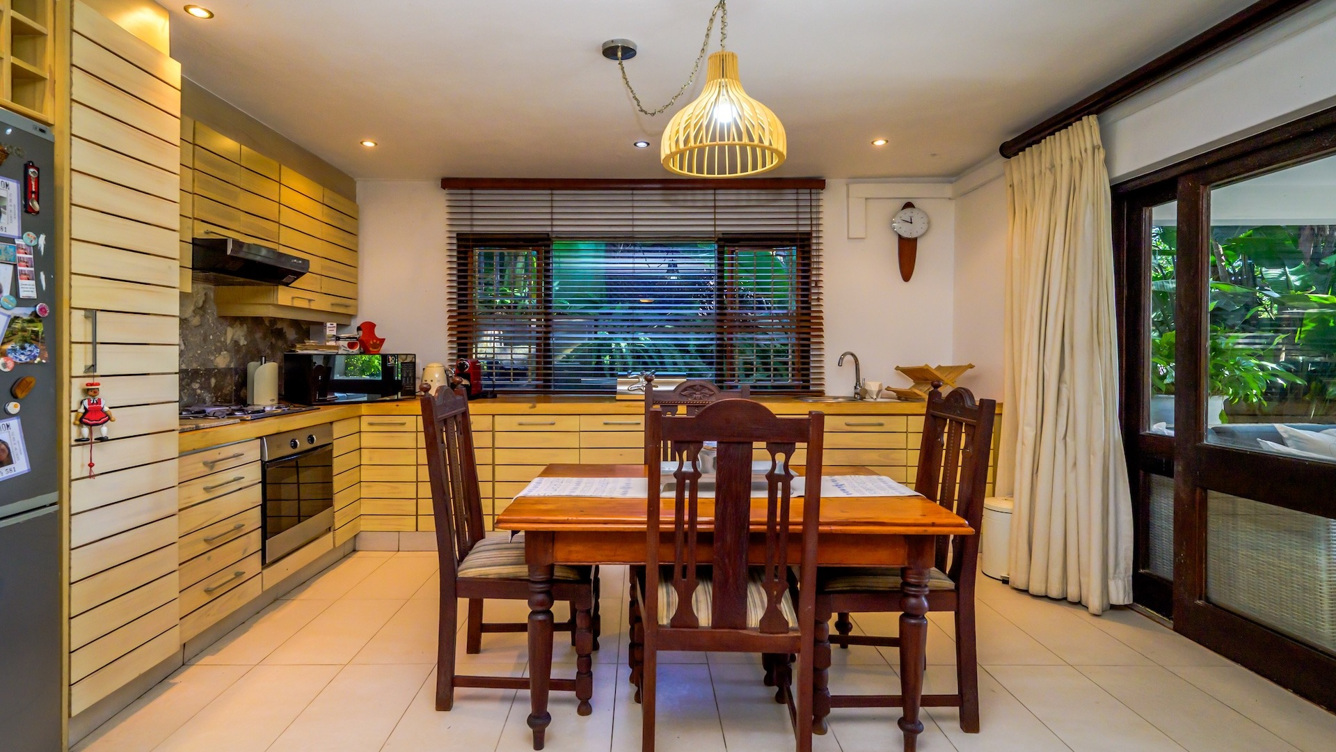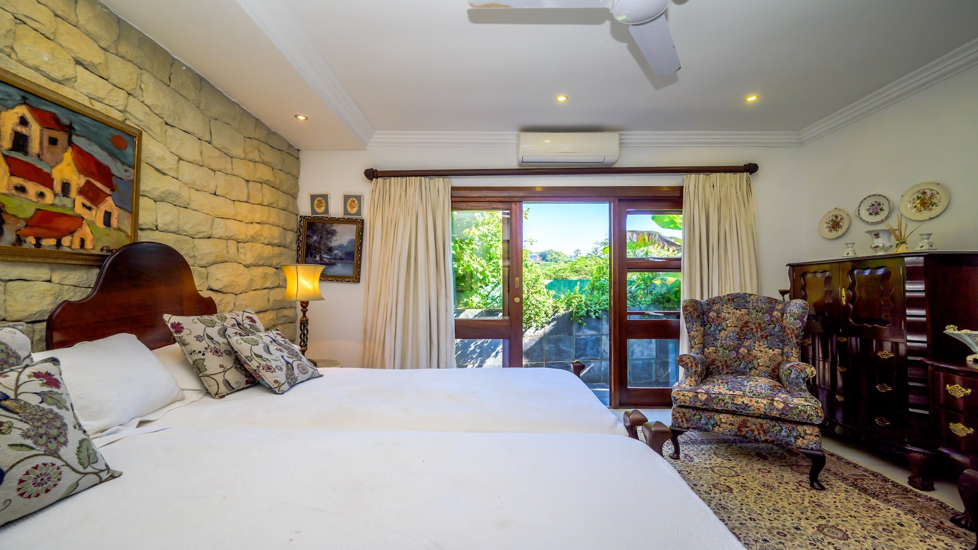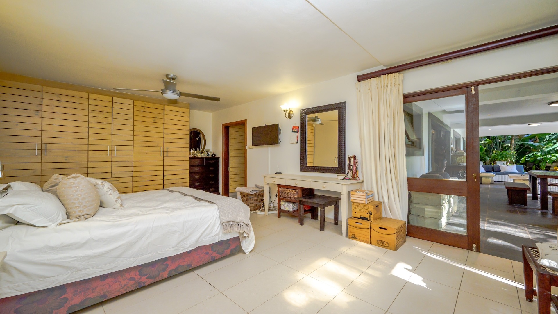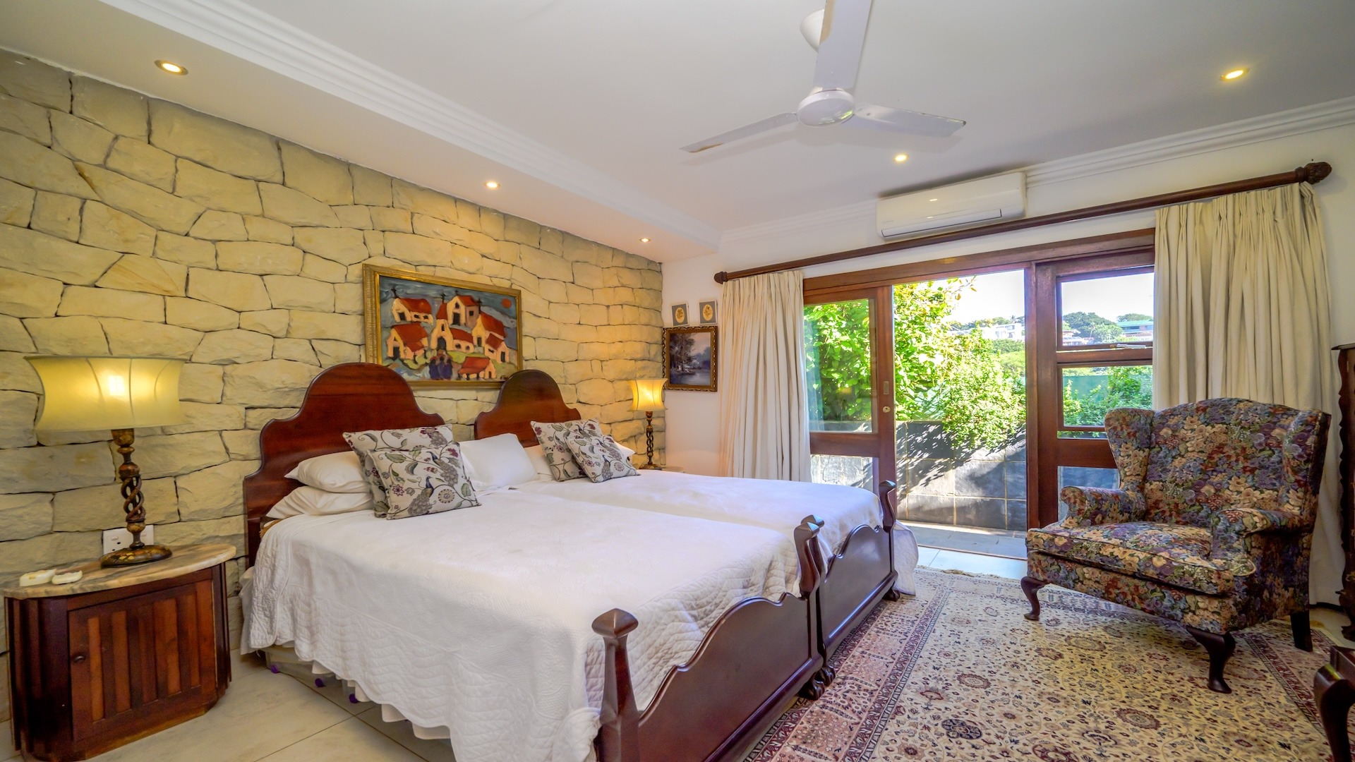 Outdoors, the home is framed by a beautifully established indigenous garden and gorgeous large trees, complete with a built-in braai — perfect for summer evenings. The patio offers breathtaking views, ideal for your morning coffee or evening sundowners. At the back, a slate-surrounded entertainment area awaits with ample space for gatherings.