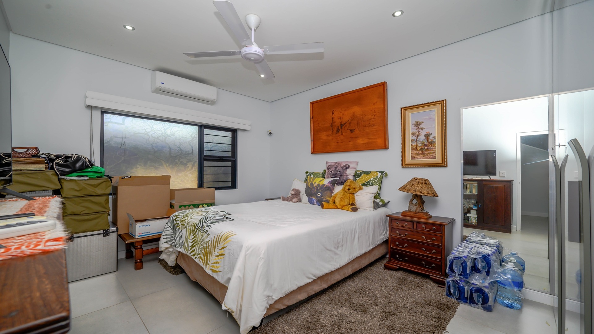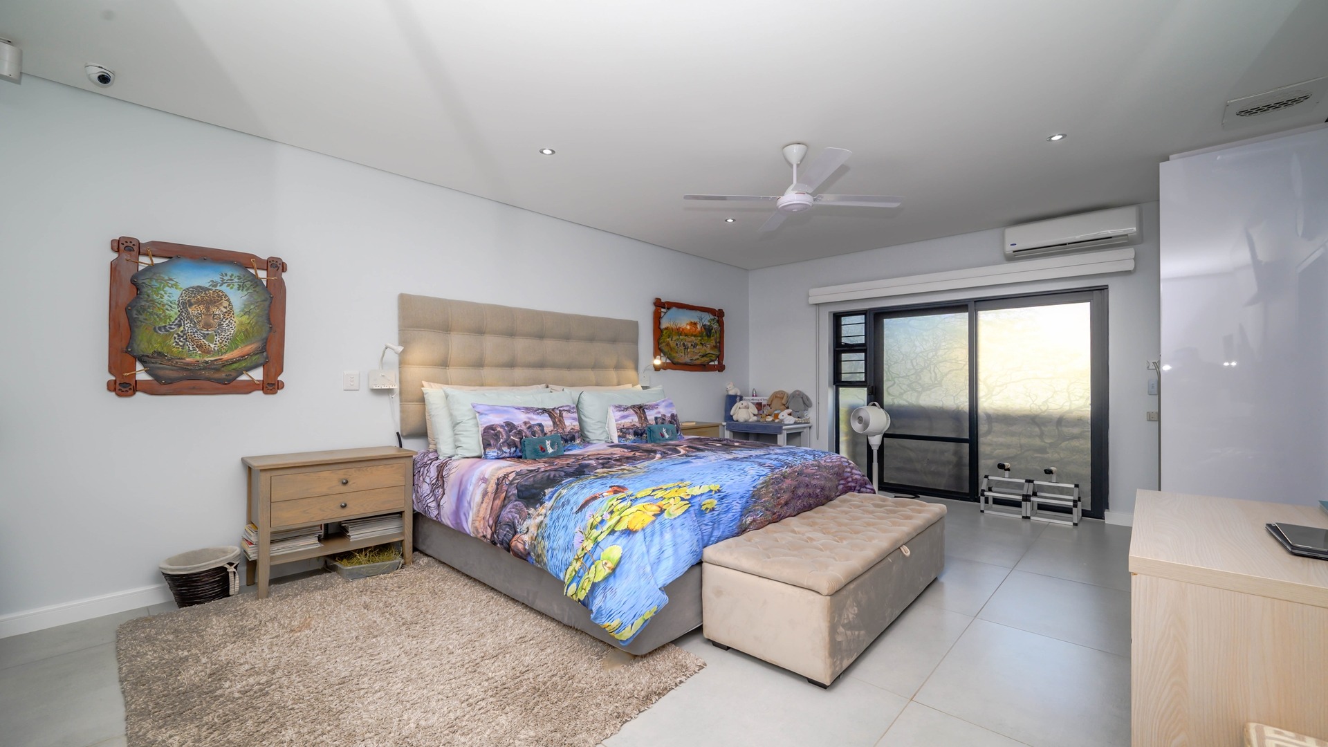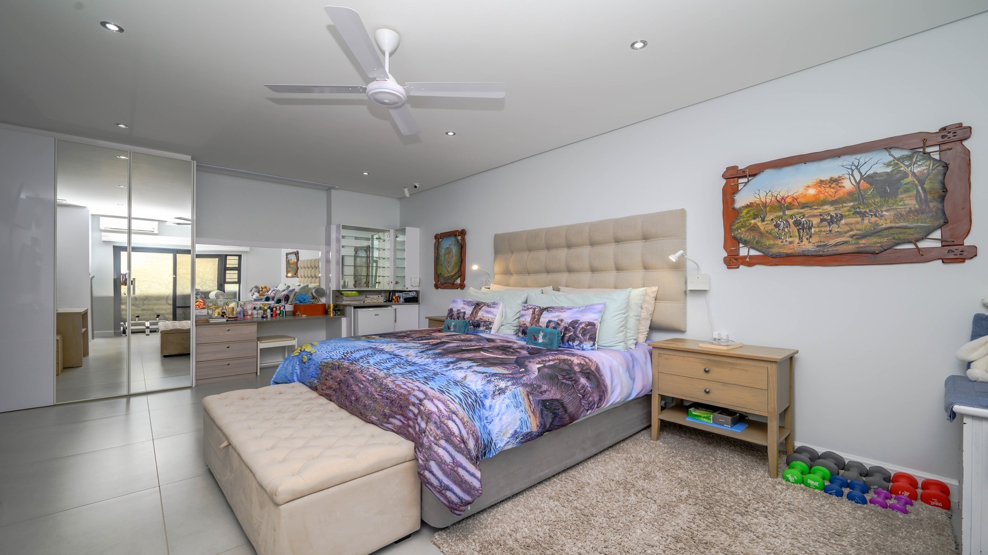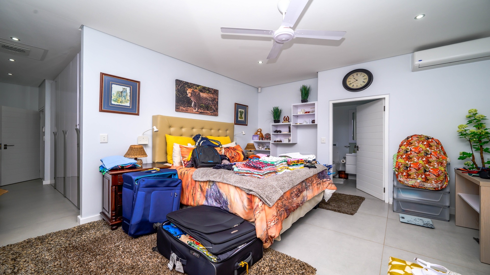 The master bedroom is upstairs fwith a small balcony and en-suite bathroom with double vanity. A guest toilet and two en-suite bedrooms on the lower level add to the luxury throughout the fully air-conditioned home. Insect and monkey screen doors & windows, a gas geyser & hob, private court yard, extra length automated double garage with laundry fittings and additional double undercover parking bay complete the value and style of this home for the discerning buyer.