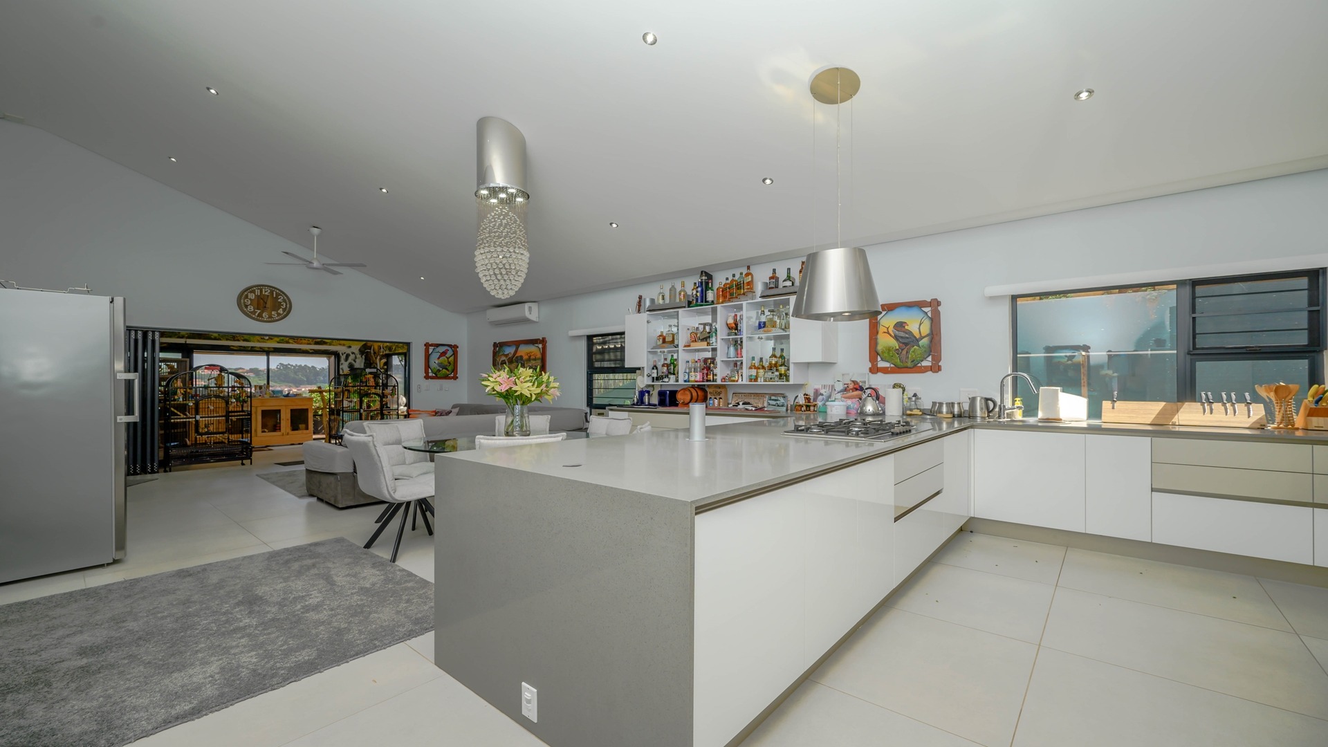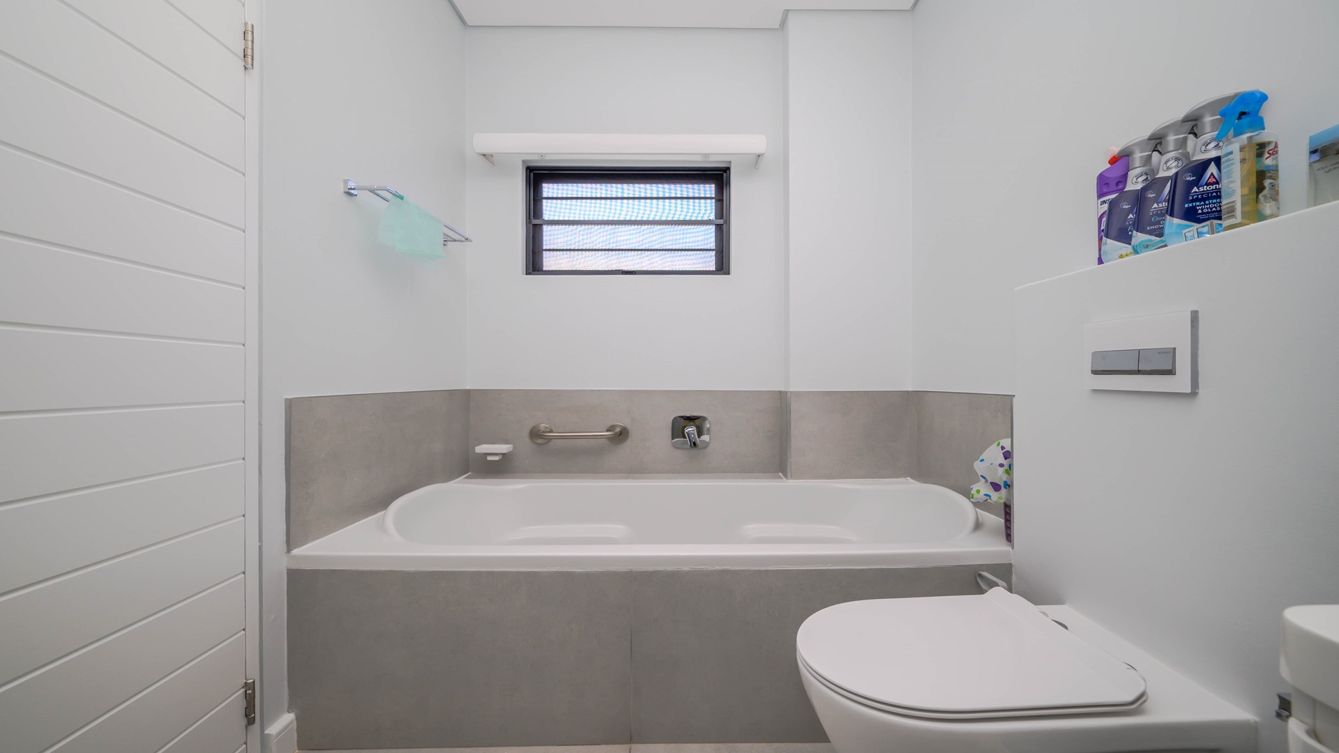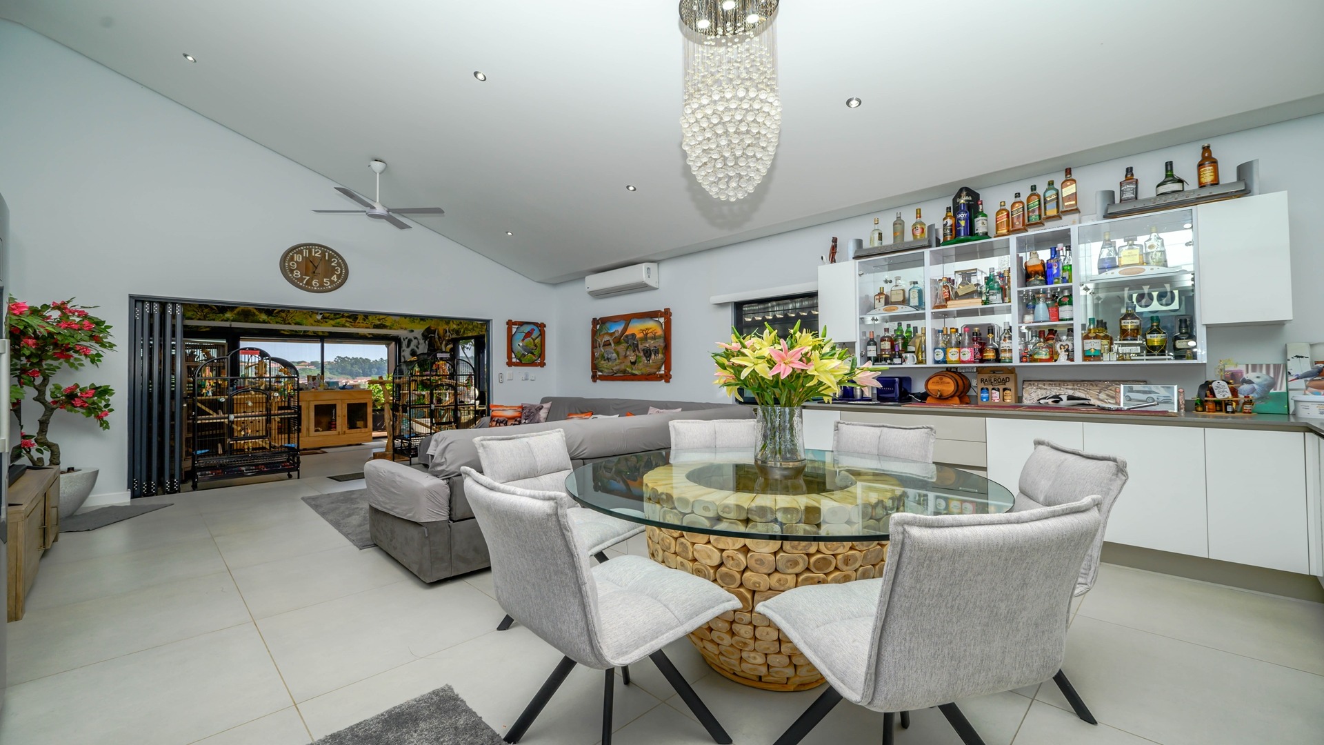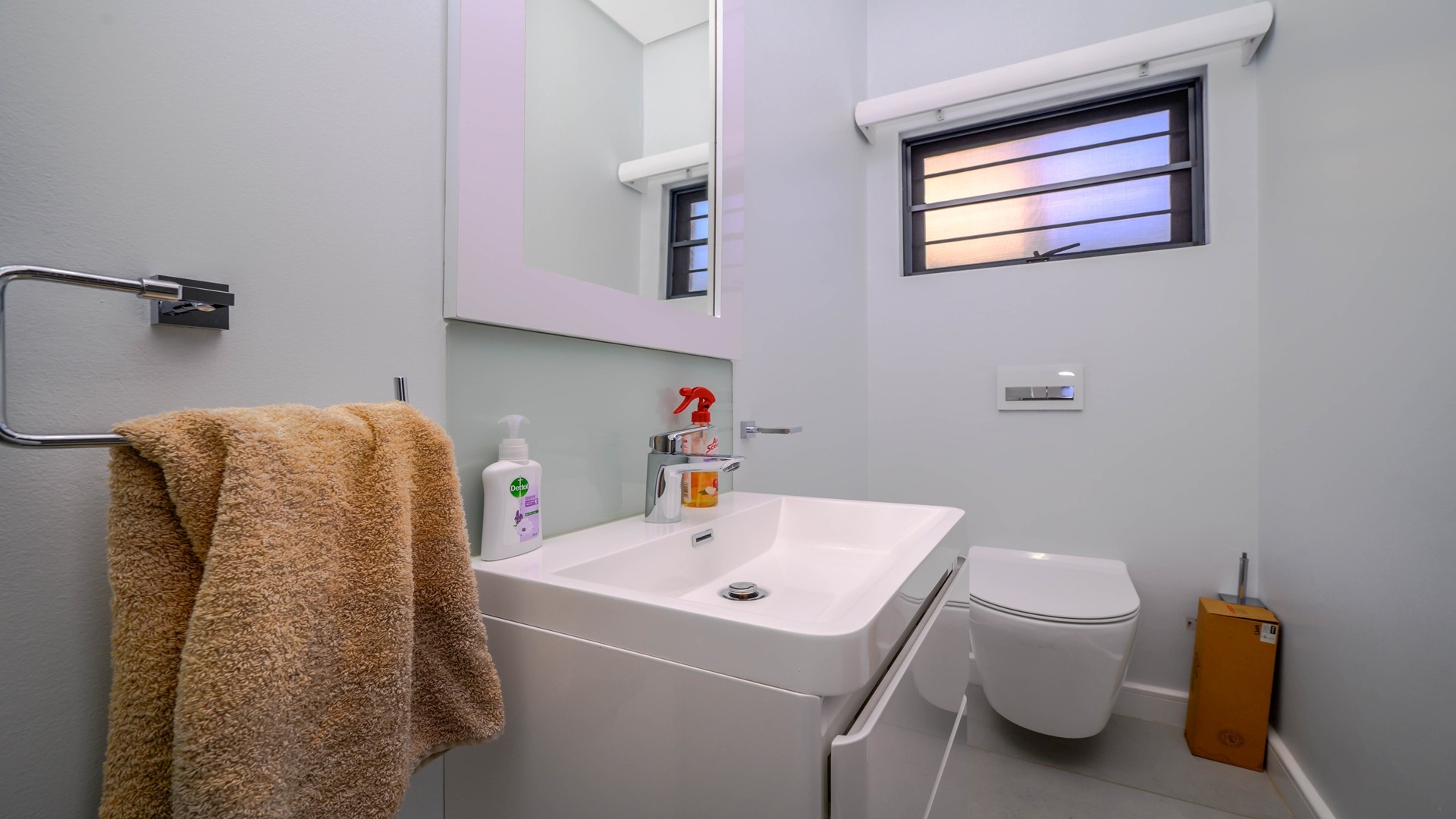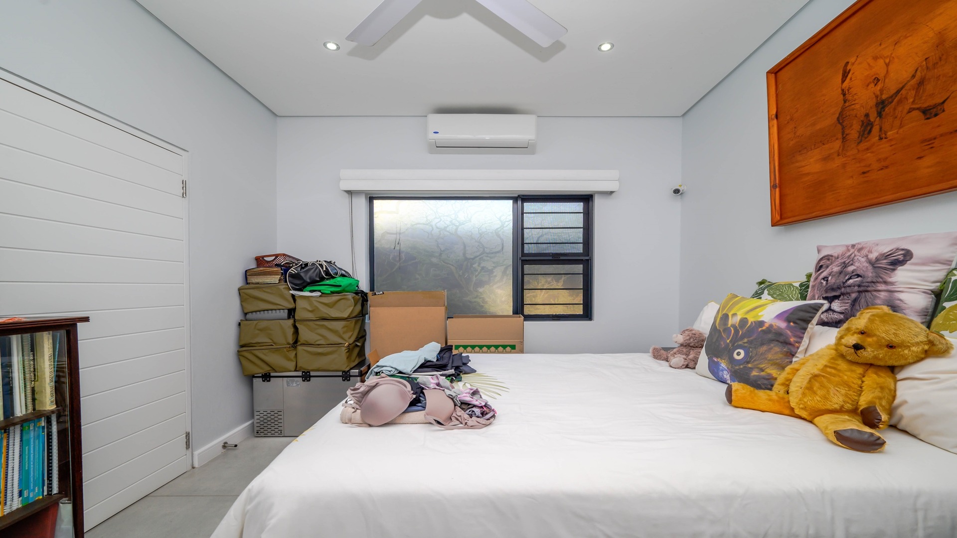 The master bedroom is upstairs fwith a small balcony and en-suite bathroom with double vanity. A guest toilet and two en-suite bedrooms on the lower level add to the luxury throughout the fully air-conditioned home. Insect and monkey screen doors & windows, a gas geyser & hob, private court yard, extra length automated double garage with laundry fittings and additional double undercover parking bay complete the value and style of this home for the discerning buyer.