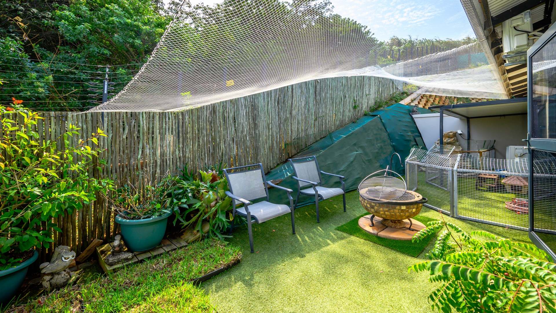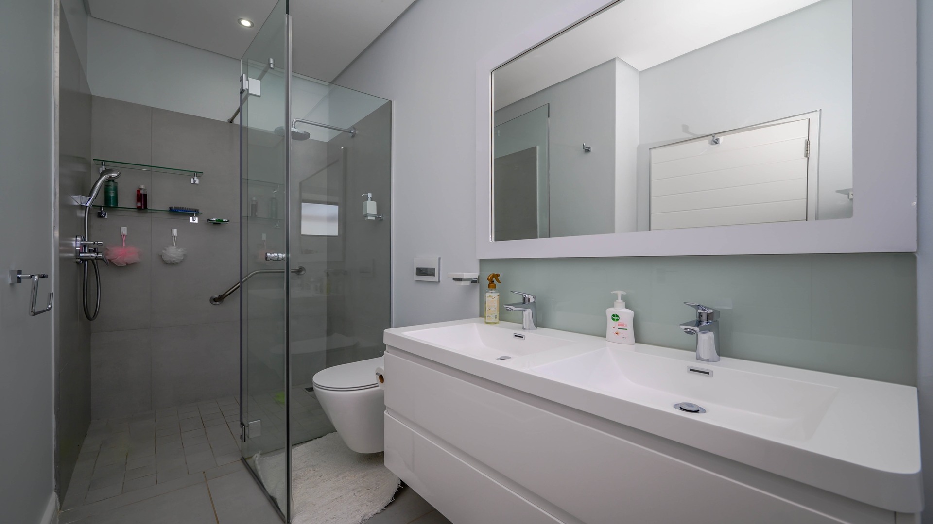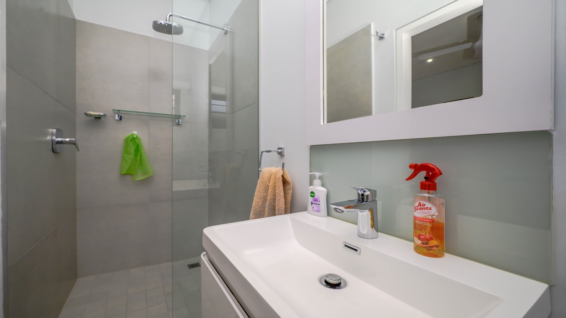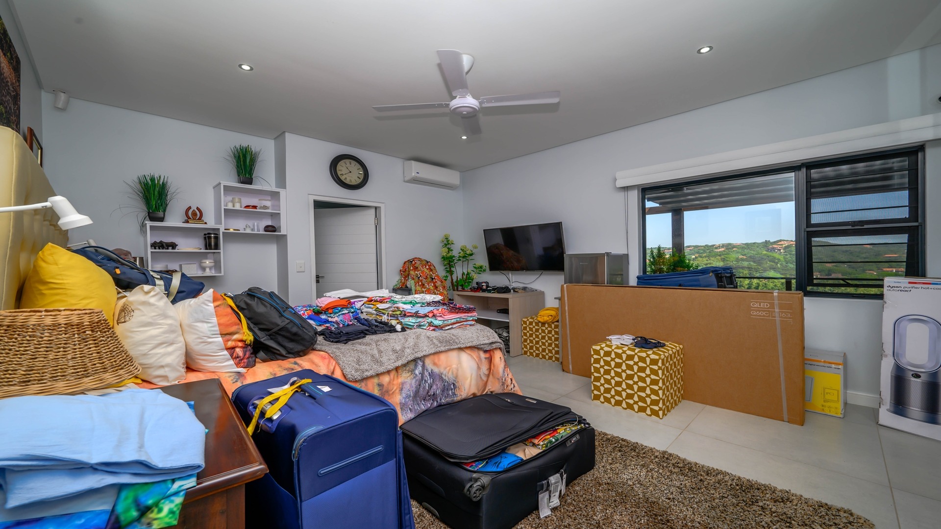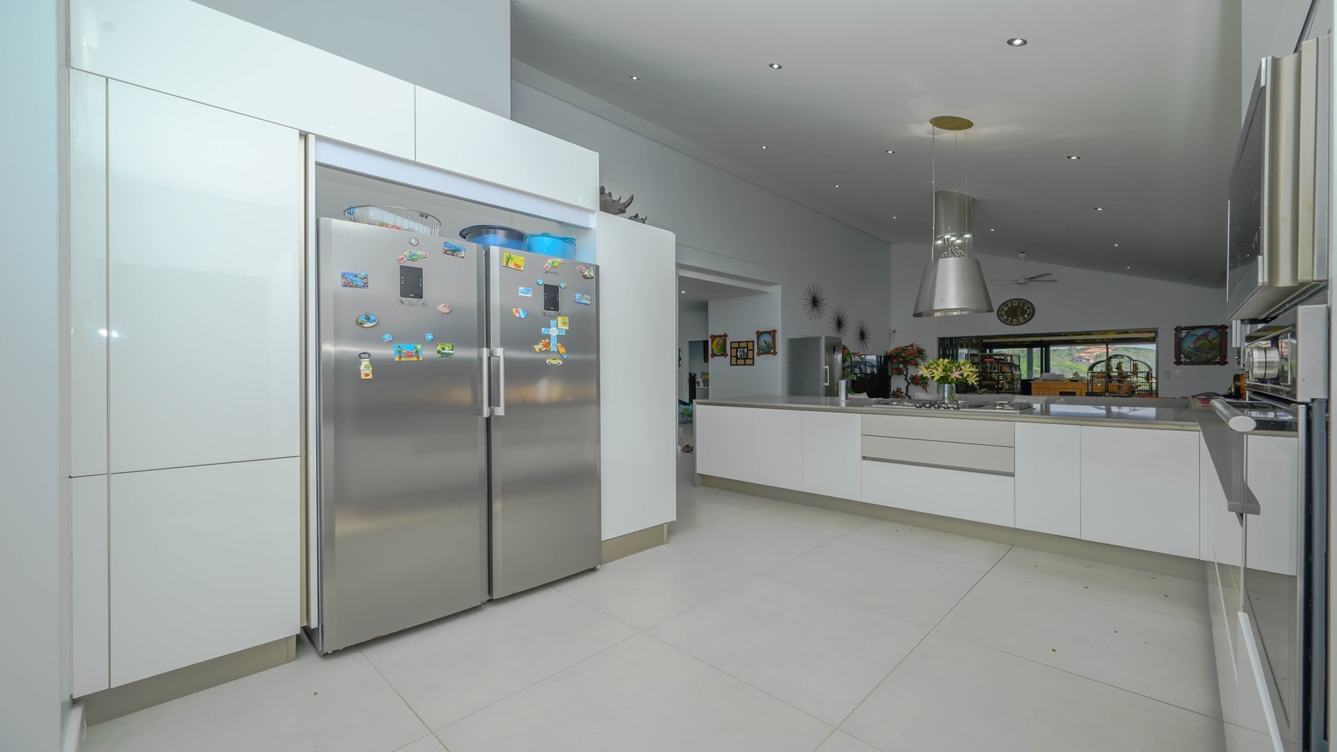 The master bedroom is upstairs fwith a small balcony and en-suite bathroom with double vanity. A guest toilet and two en-suite bedrooms on the lower level add to the luxury throughout the fully air-conditioned home. Insect and monkey screen doors & windows, a gas geyser & hob, private court yard, extra length automated double garage with laundry fittings and additional double undercover parking bay complete the value and style of this home for the discerning buyer.