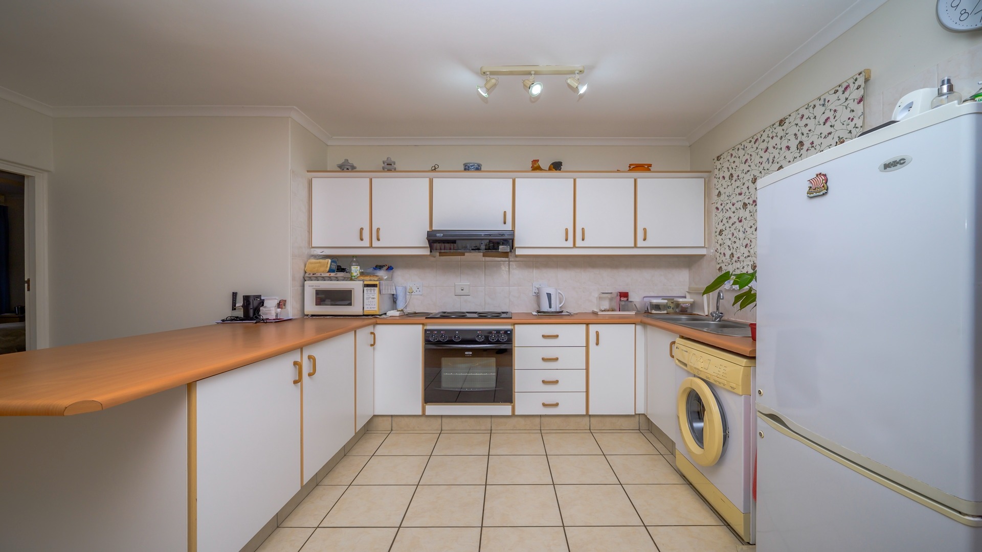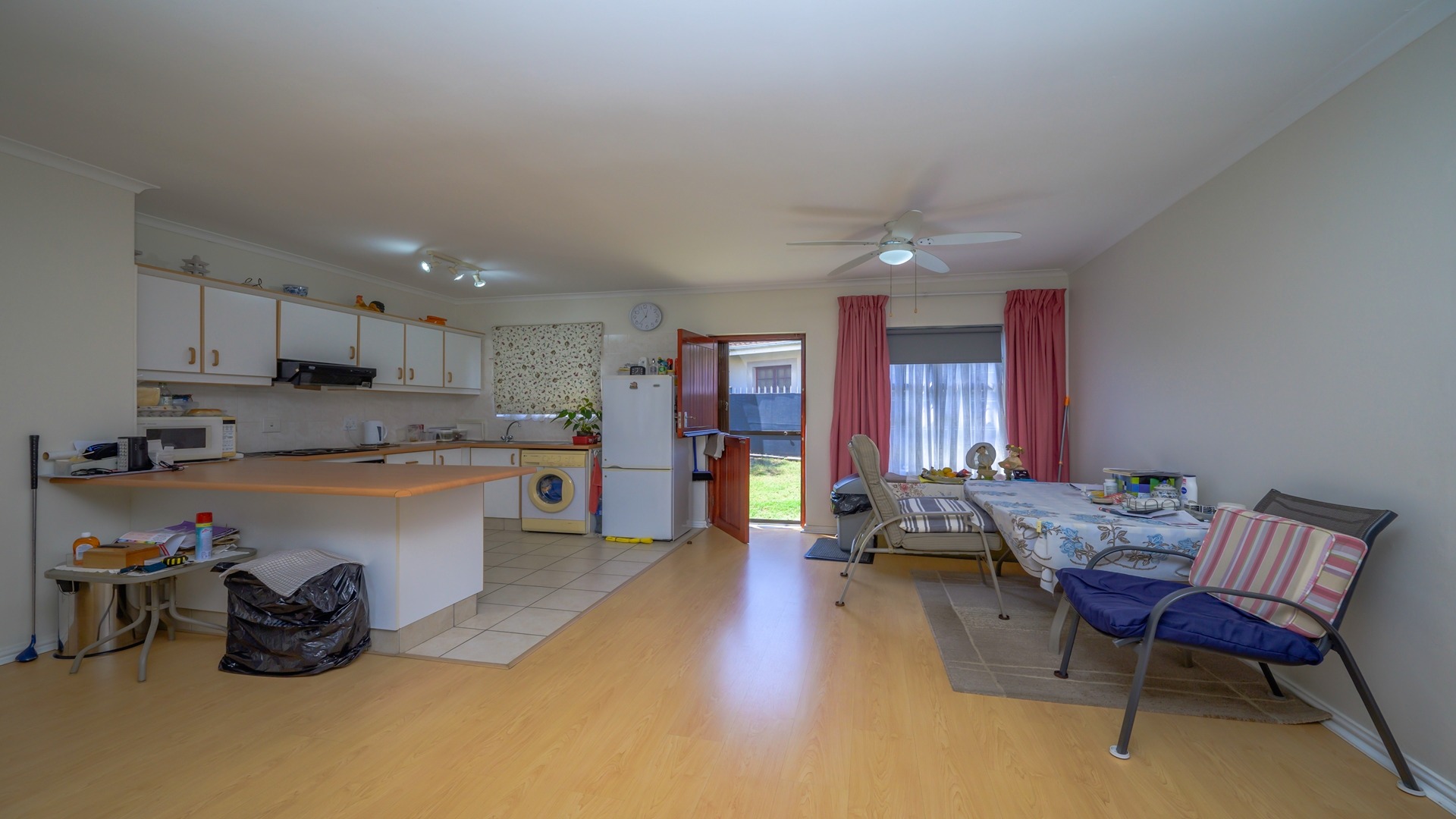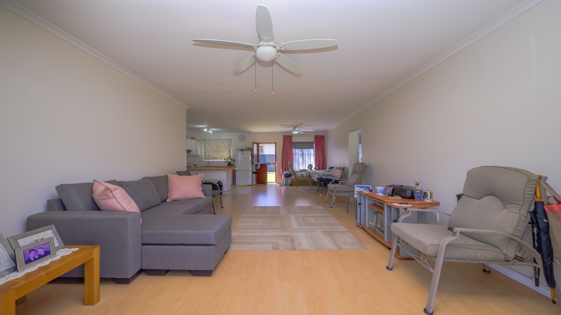 The home features a generous open-plan design with spacious lounge and dining areas that flow seamlessly, creating a welcoming environment for both everyday living and entertaining. The neat, well-organised U-shaped kitchen is practical and functional, offering ample cupboard space and an efficient layout that caters to modern living.