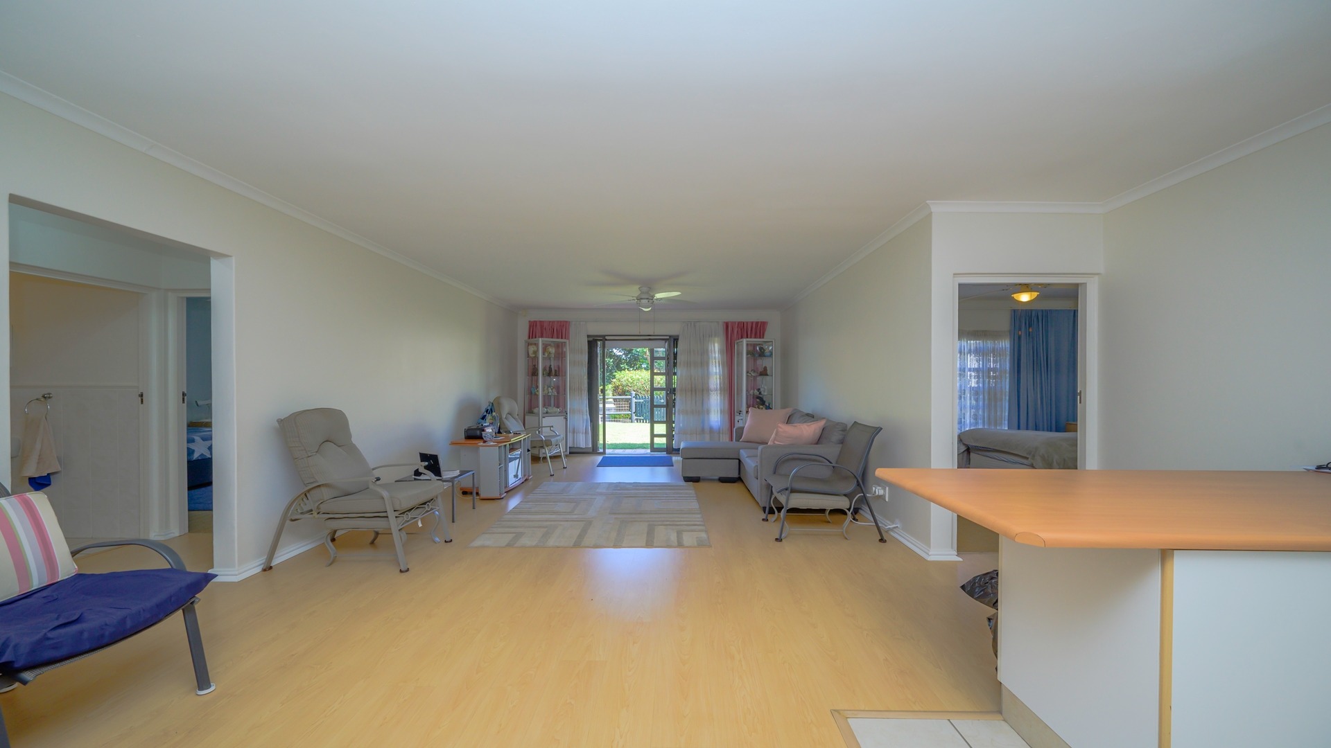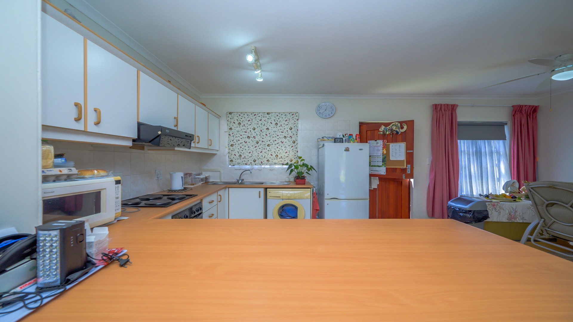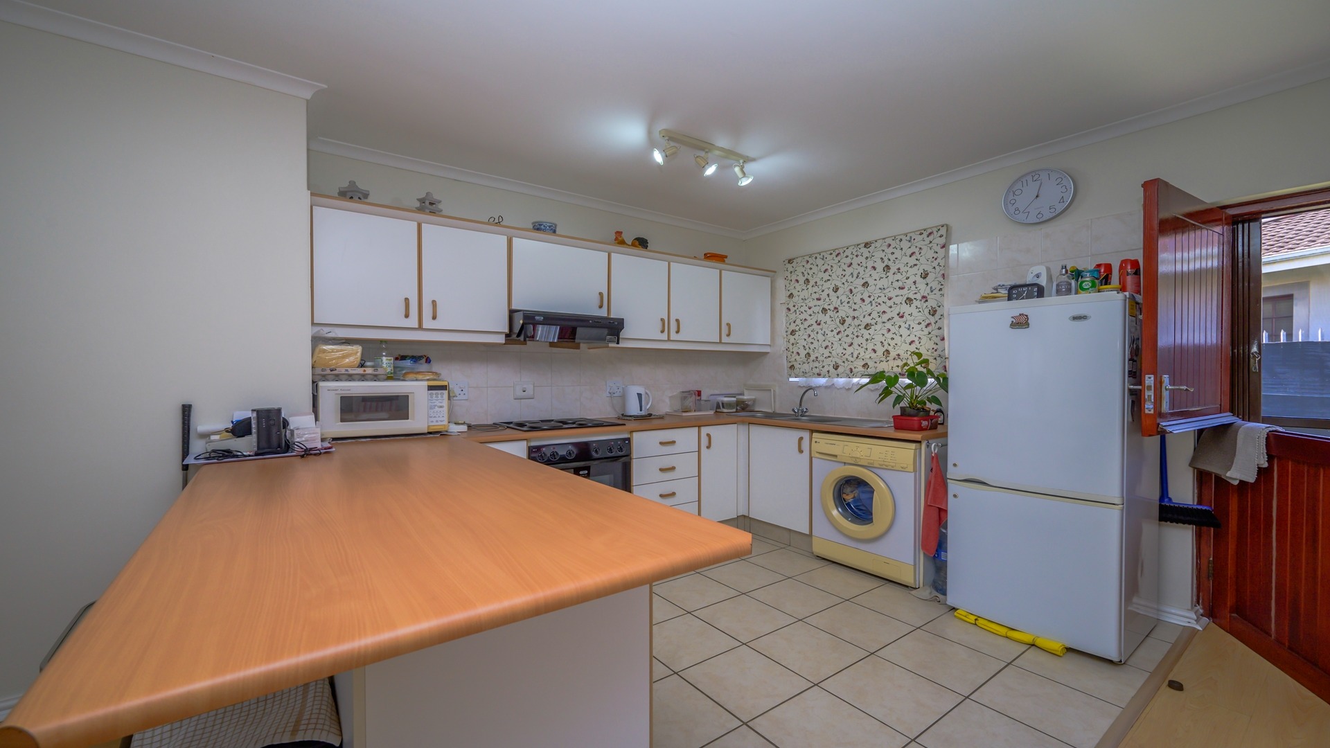 The home features a generous open-plan design with spacious lounge and dining areas that flow seamlessly, creating a welcoming environment for both everyday living and entertaining. The neat, well-organised U-shaped kitchen is practical and functional, offering ample cupboard space and an efficient layout that caters to modern living.
