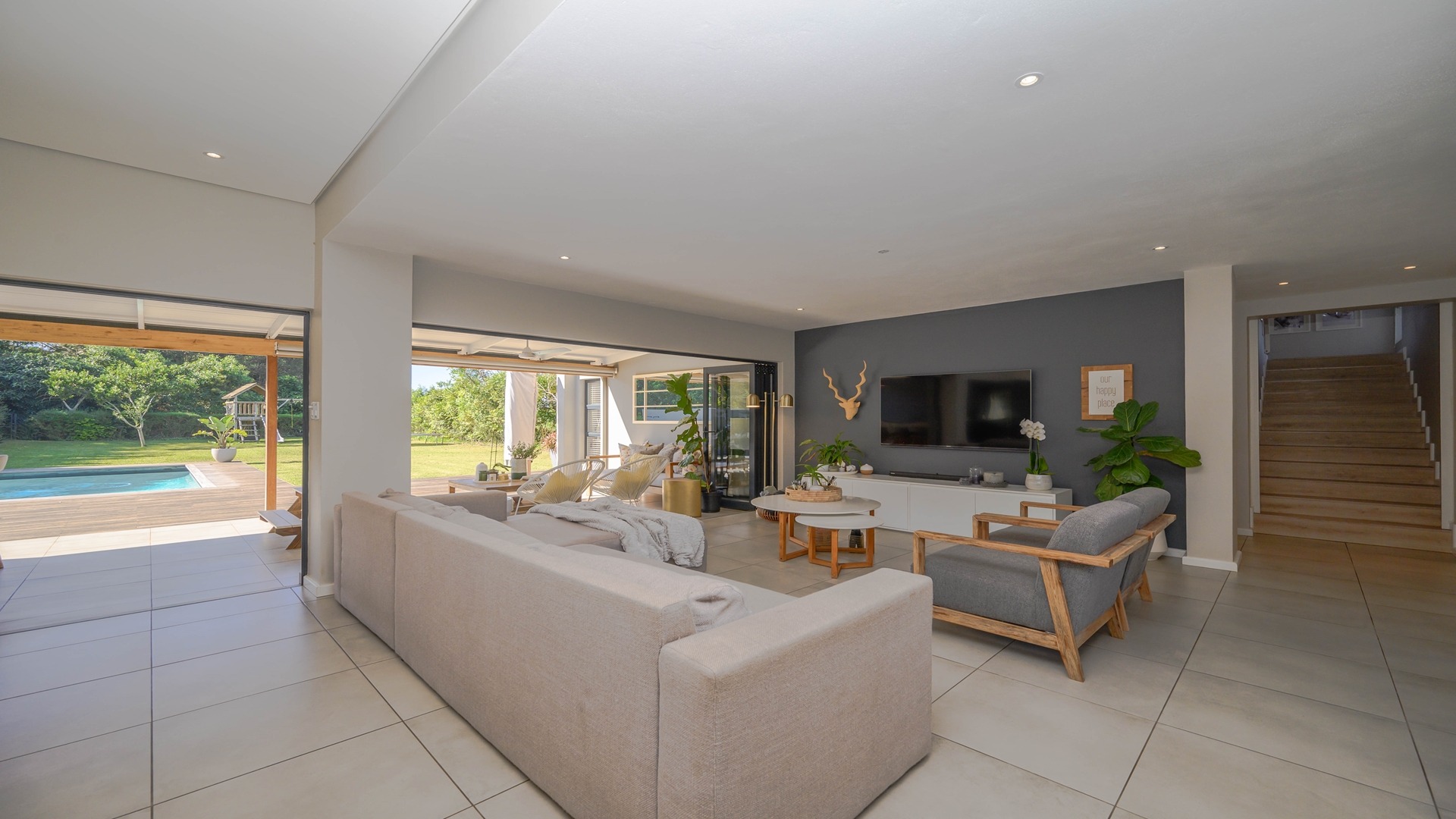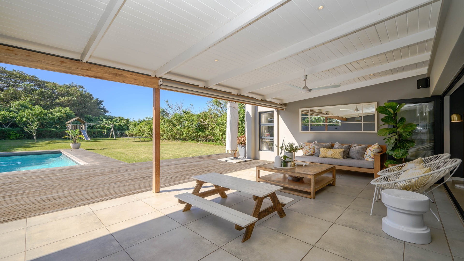 Discover an exceptional opportunity for secure estate living in the sought-after Ballito Central, South Africa. This expansive residential property, nestled within a security estate and complex, offers a generous Erf size of 1306.00 sqm, providing ample space for comfortable family life. Ballito Central is renowned for its vibrant coastal atmosphere and convenient access to amenities, offering an ideal blend of tranquil living and urban accessibility. The interior of this impressive home is designed for both functionality and comfort, featuring five well-proportioned bedrooms and four bathrooms, ensuring privacy and convenience for all residents. The main living areas include two spacious lounges, perfect for relaxation and entertaining. A dedicated study provides an ideal space for remote work or quiet contemplation, complemented by a convenient guest toilet and a practical laundry area. Step outside to embrace a lifestyle of leisure and recreation with a private swimming pool, offering a refreshing escape on warm Ballito days. Residents also benefit from access to a communal clubhouse, enhancing the community feel. Parking is well-catered for with two dedicated garages and a total of three parking spaces. Security is paramount, with electric fencing contributing to a safe and protected environment within this esteemed security estate, where pets are also welcome. Key Features: • 5 Bedrooms • 4 Bathrooms • 2 Lounges • Dedicated Study • Private Swimming Pool • Clubhouse Access • 2 Garages, 3 Parking Spaces • Electric Fencing • Pets Allowed • Laundry Facilities