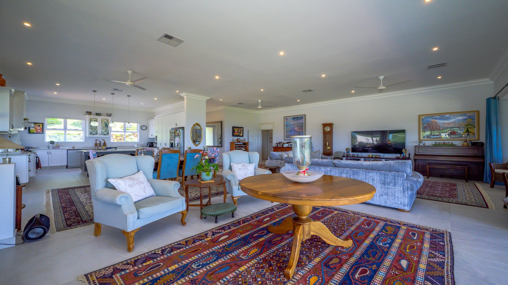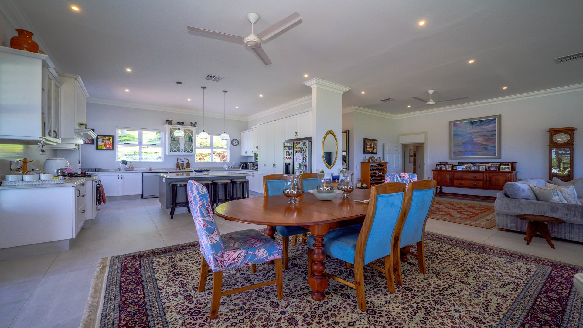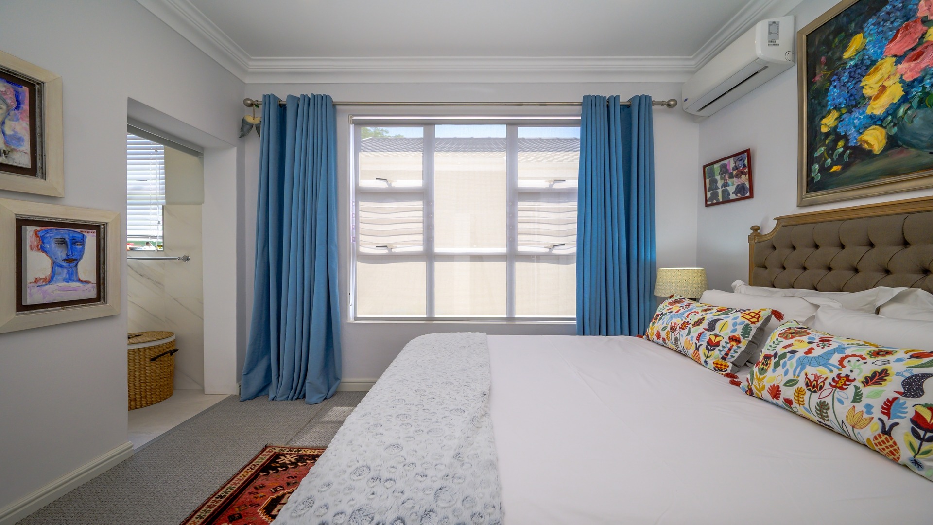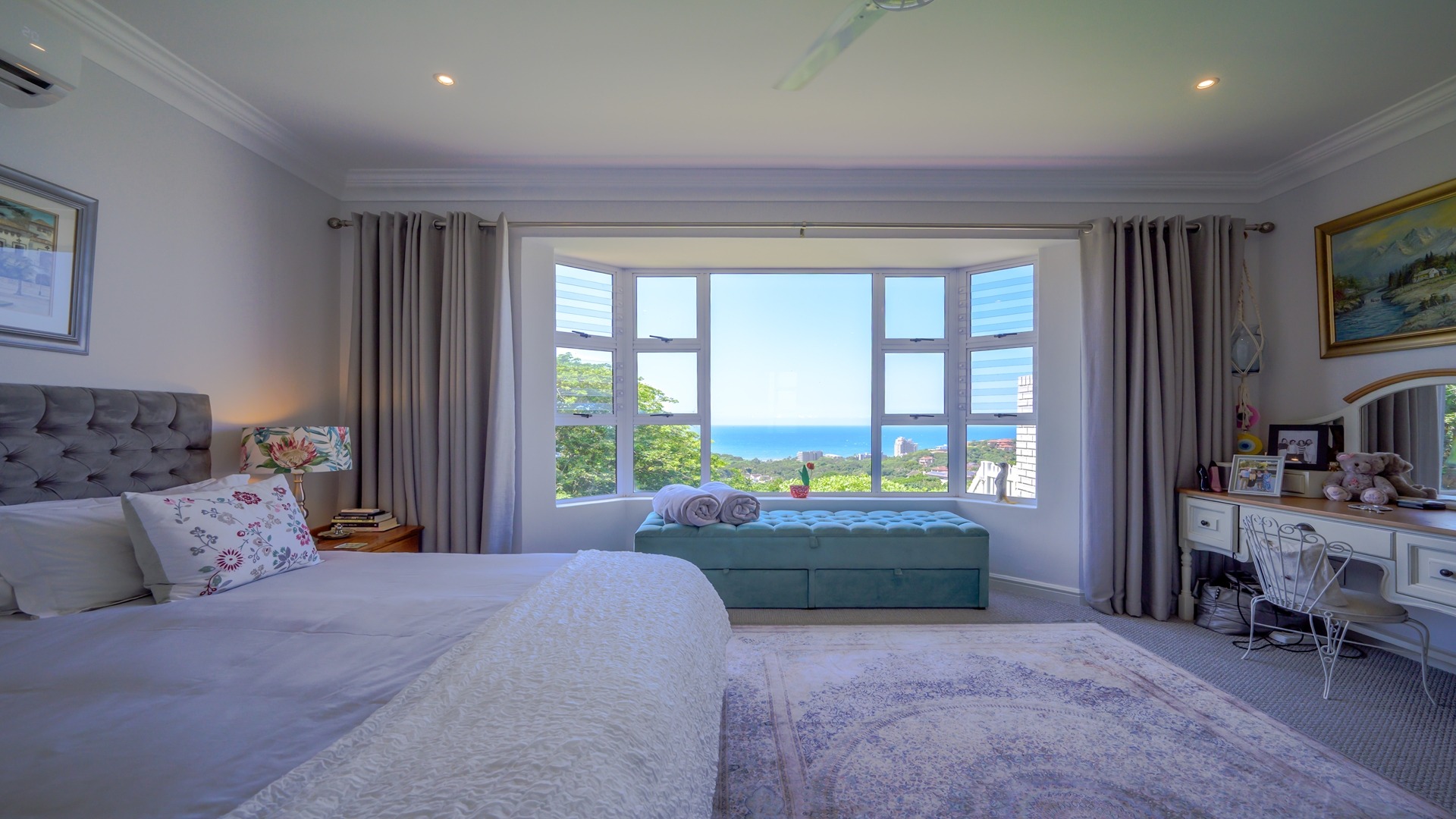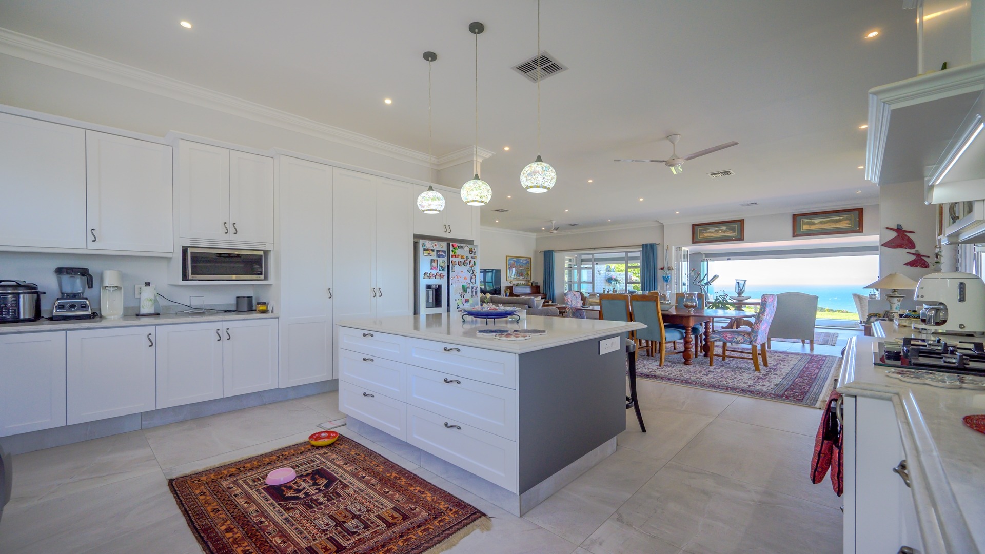 As you step into the expansive, elegantly designed, and beautiful home, your eyes are immediately drawn to the stunning sea views. The spacious, light filled, living areas flow effortlessly into an elegant and well-appointed kitchen featuring a gas stove, ample built-in cupboards, a centre island, and a private courtyard with a wash trough and drying yard. The high ceilings throughout the home enhance the sense of space and elegance, while ducted air conditioning in the living ensures year-round comfort.