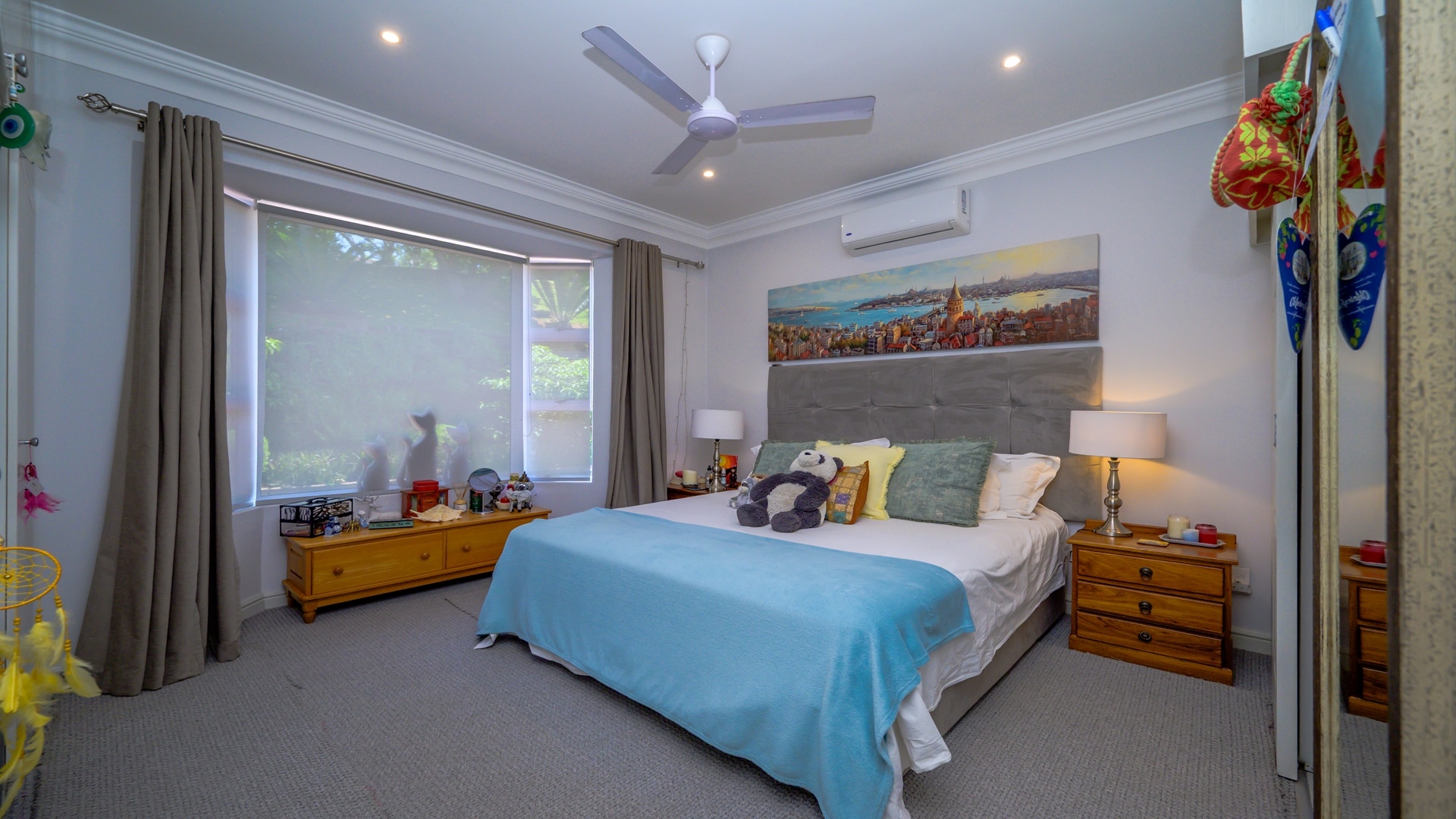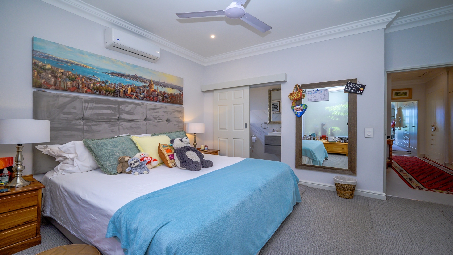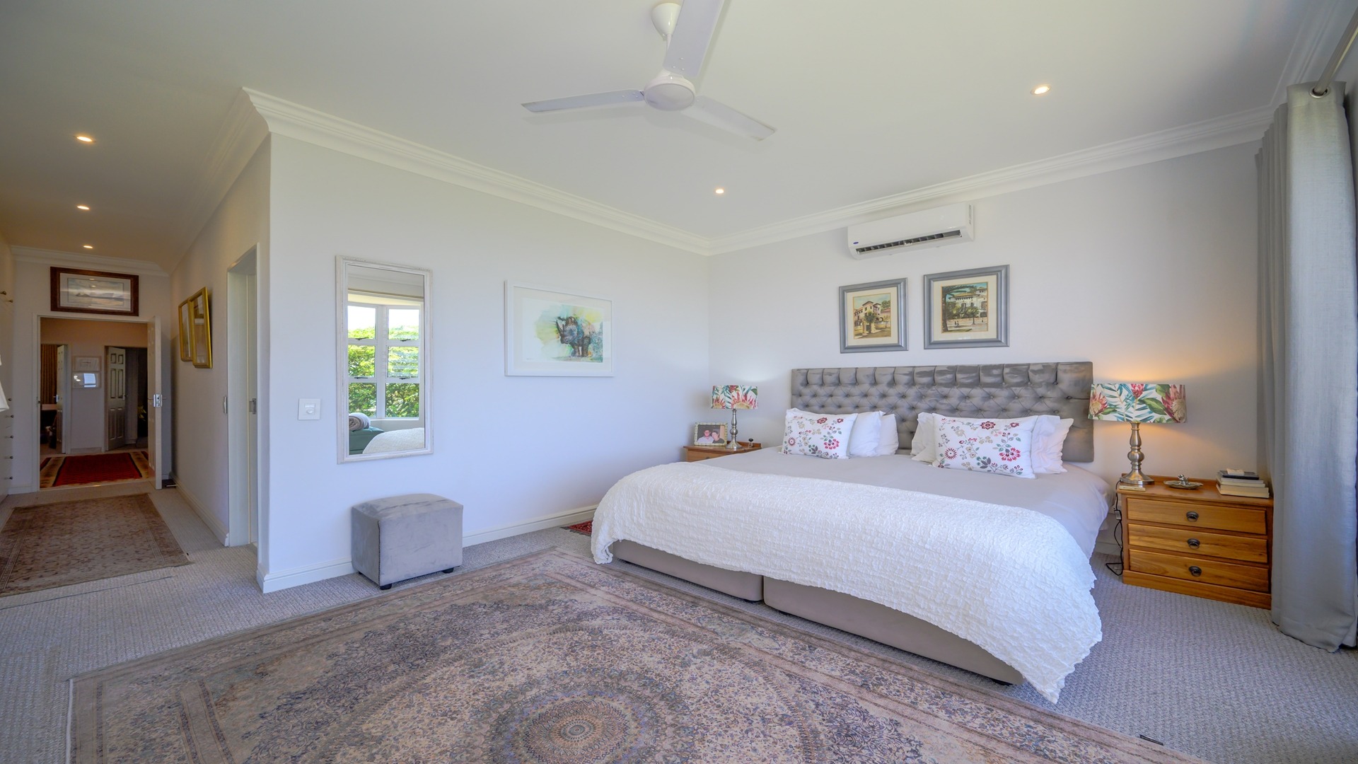 Three generously sized, tastefully renovated en-suite bedrooms feature plush carpeting, air conditioning, and ceiling fans. In addition, a dedicated air-conditioned study provides the perfect home office space. Ample linen cupboards offer convenient storage throughout.