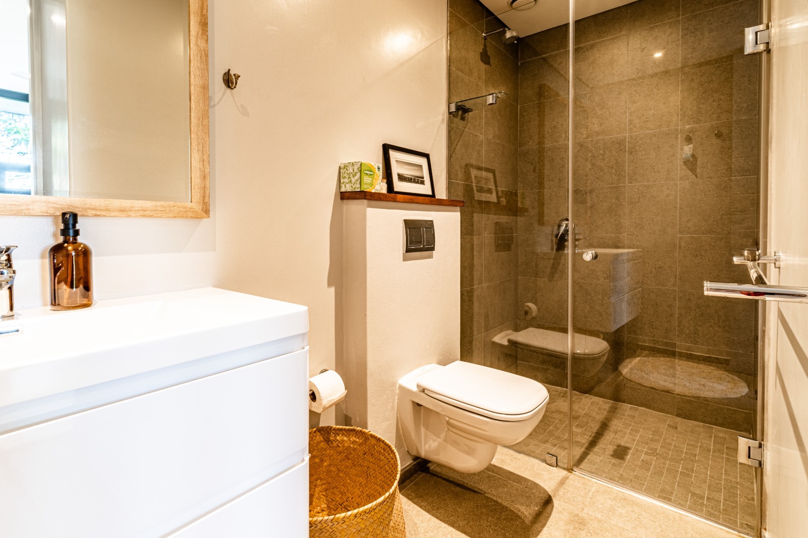 The moody, contemporary interiors are fully air-conditioned, while expansive floor-to-ceiling sliding doors create a seamless flow to the covered terrace and private garden. The main en-suite opens directly onto the terrace, offering a tranquil retreat surrounded by nature.