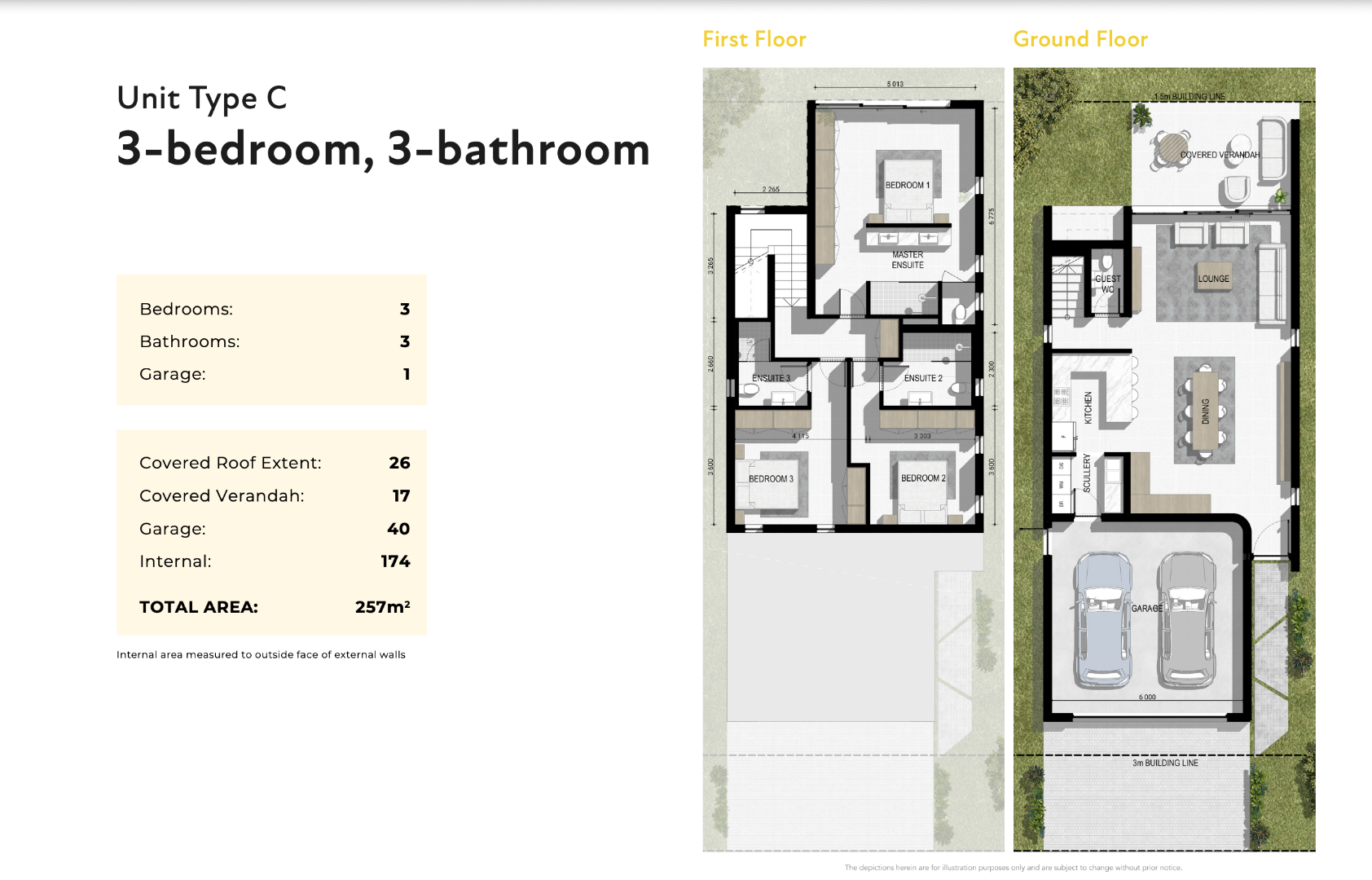 Type C includes 3 bedrooms and 3 bathrooms (all ensuite) upstairs. On ground level the open plan living areas, with guest toilet, undercover outdoor area and garden with a double garage.