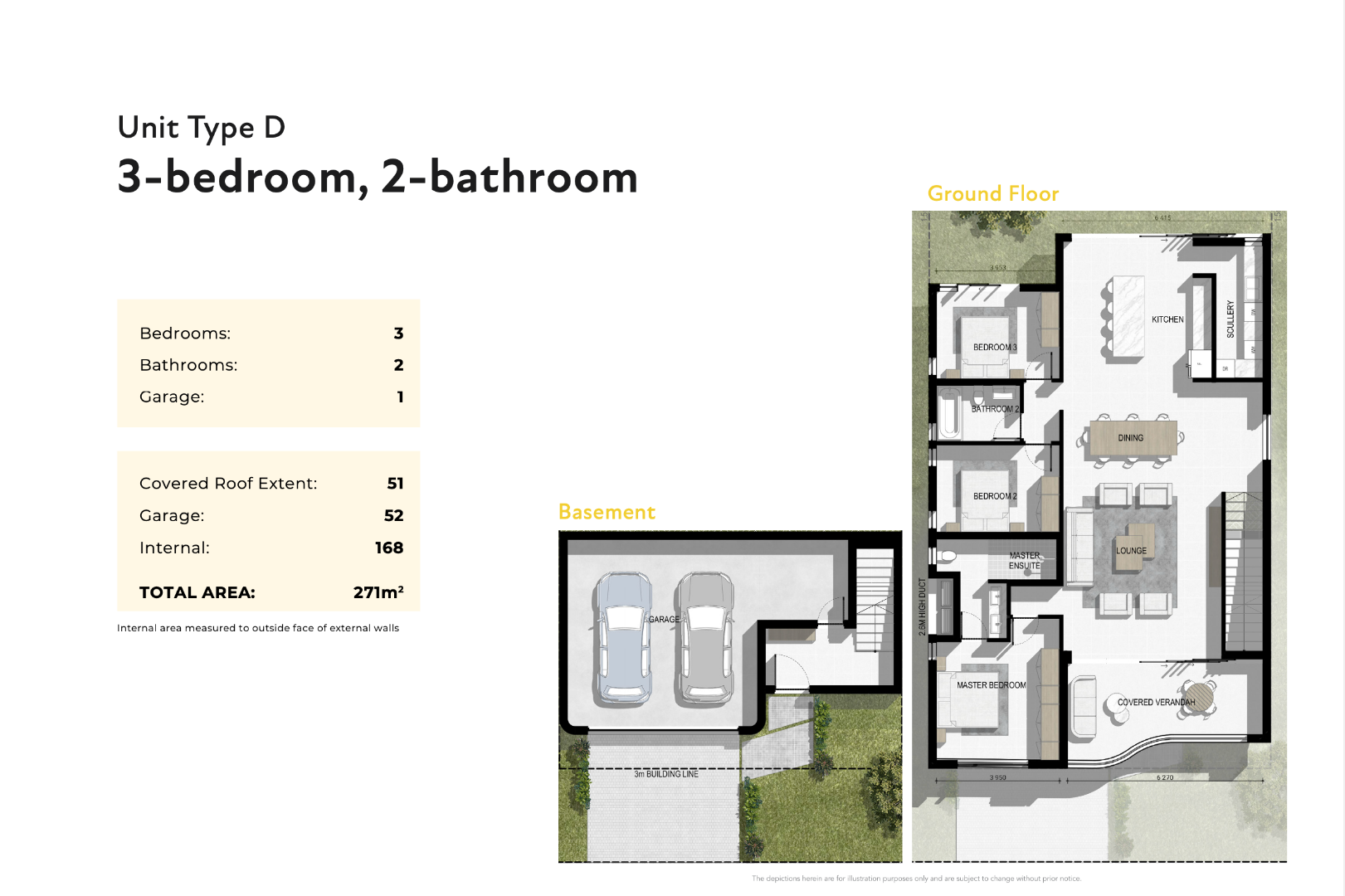 Type D includes 3 bedrooms and 2 bathrooms (main ensuite), open plan living areas, covered outdoor area and garden, with the double garage on basement level.