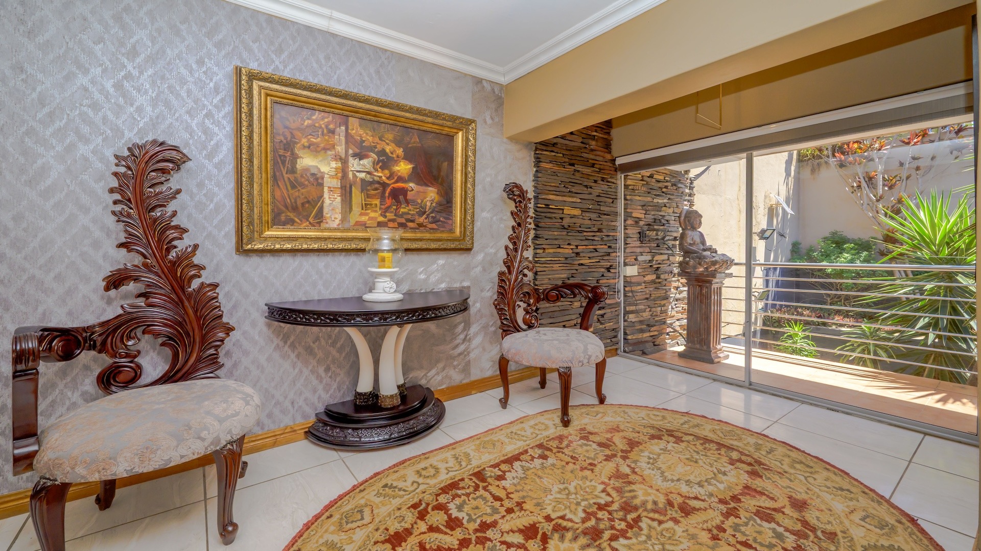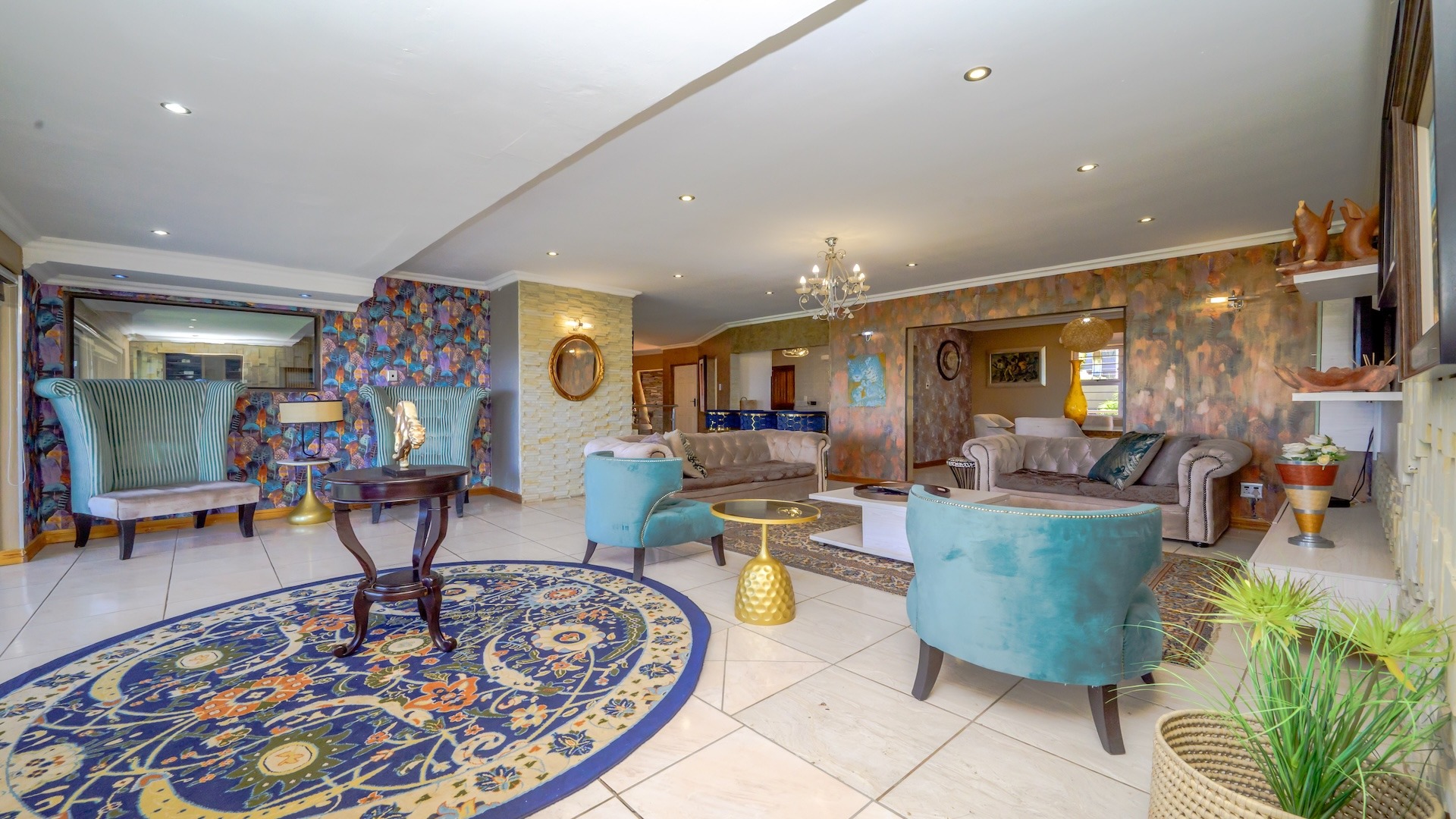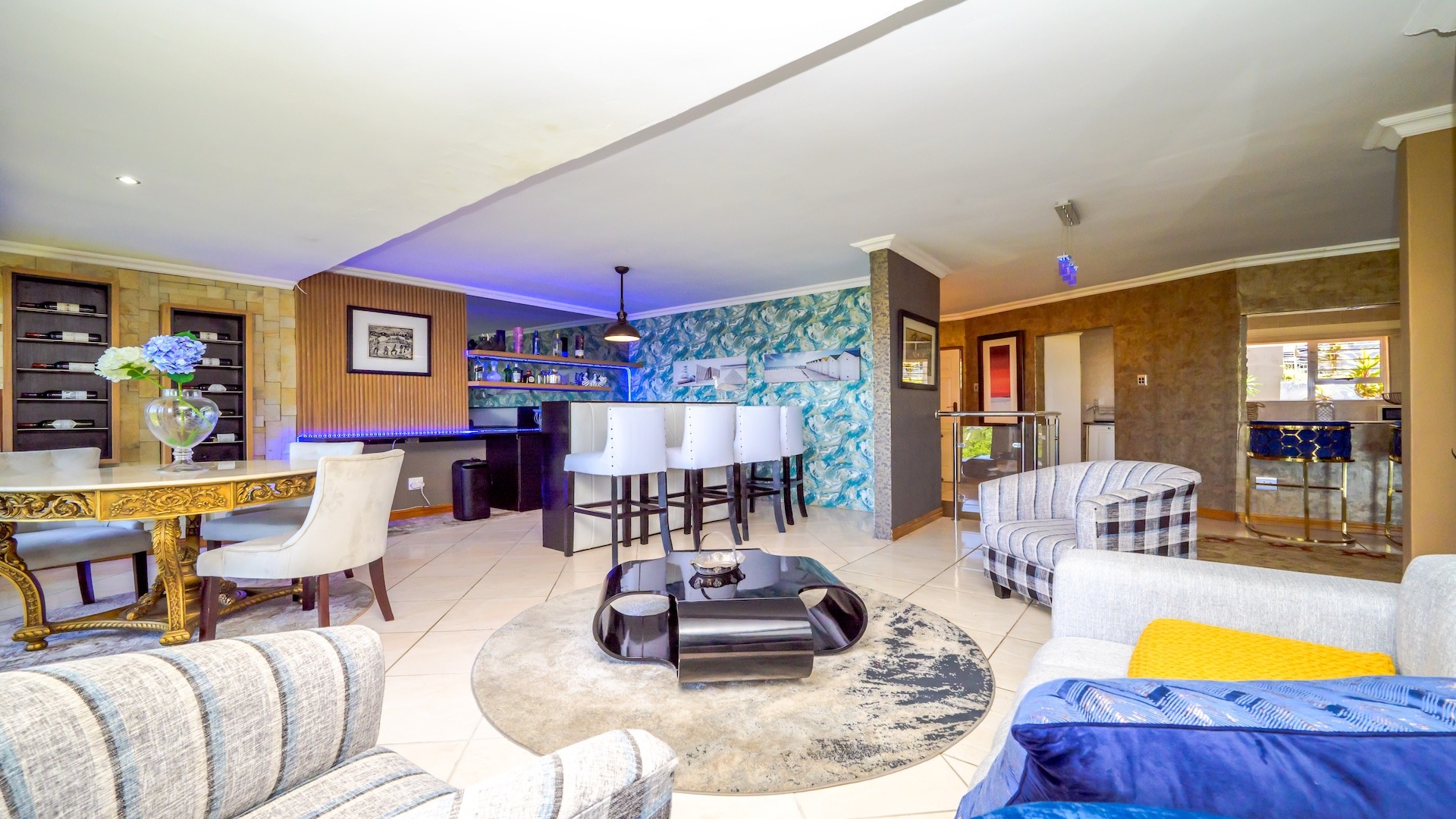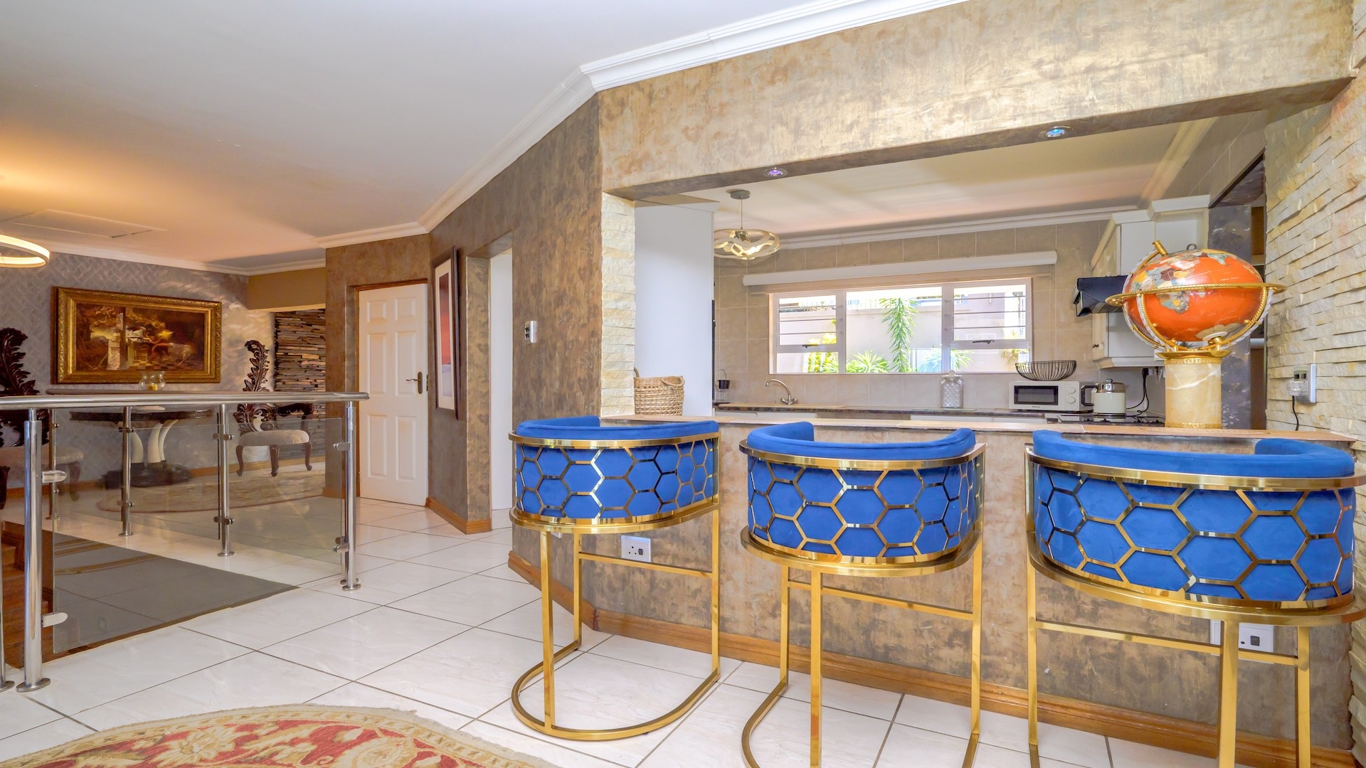Inside, the residence presents an intelligently designed open-plan layout, enhancing the sense of space and flow. It includes two distinct lounges and a dedicated dining room, providing ample areas for relaxation and entertaining. The fully equipped kitchens offers versatility, catering to various culinary needs. A dedicated study provides a quiet space for work or contemplation, complemented by an inviting entrance hall and a built-in bar for social gatherings. Special doors add a touch of unique character throughout the home.