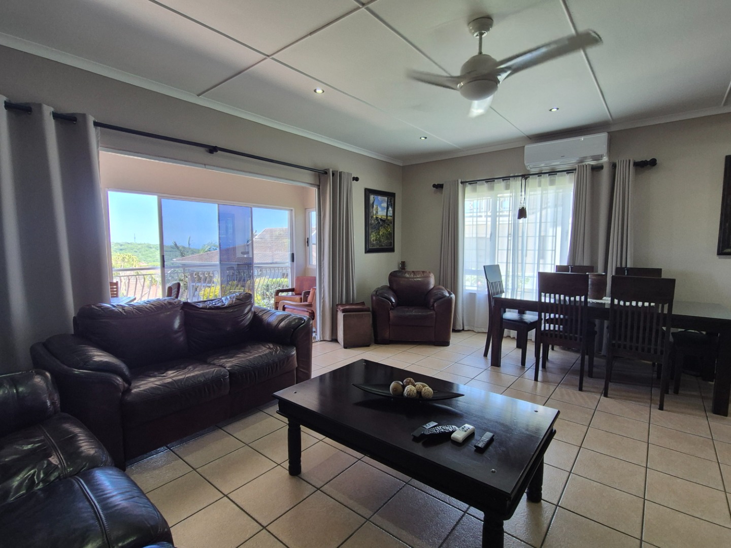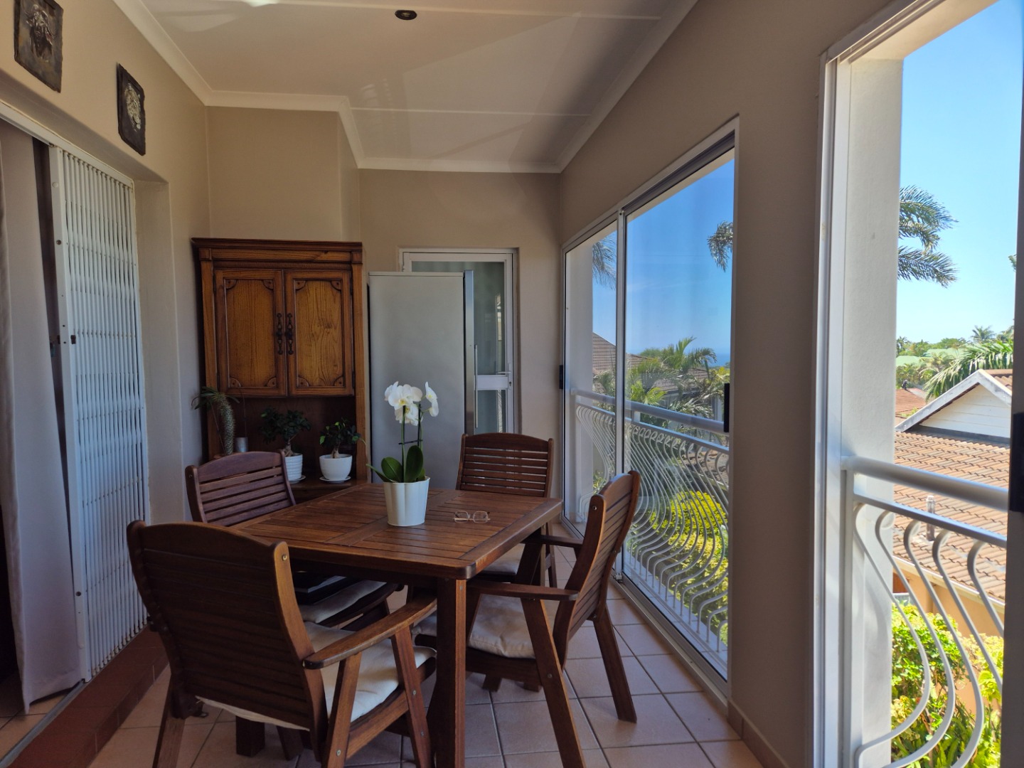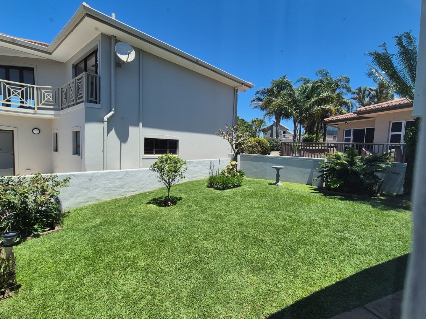 Discover this modern two-story residence in Ballito, boasting a contemporary light creamy exterior and excellent curb appeal. A spacious paved driveway leads to a double garage, providing ample parking. The property features neat landscaping with tropical palm trees, setting a welcoming tone for this well-maintained home.