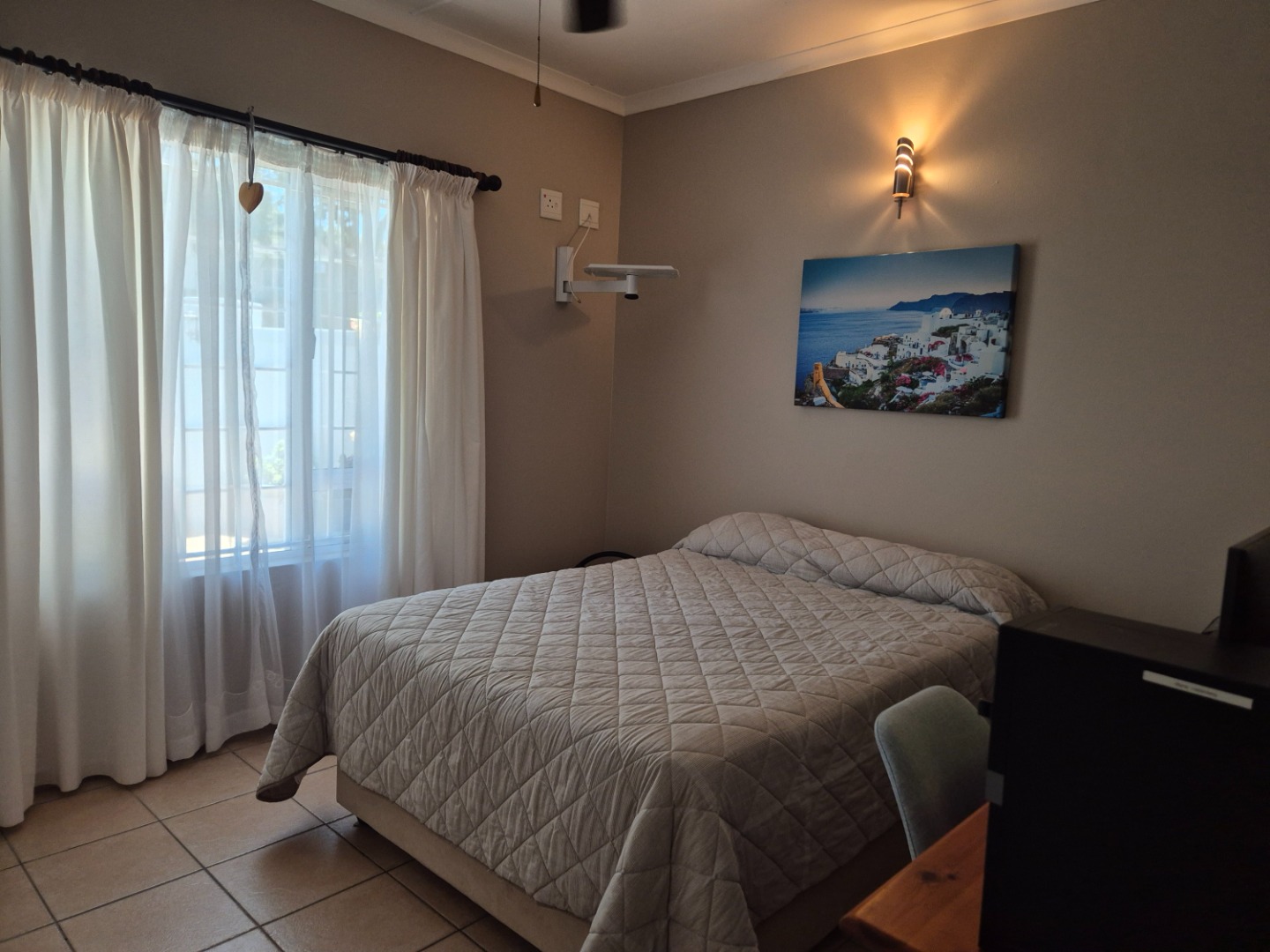 Inside, an inviting entrance hall leads to a well-appointed interior. The home includes a dedicated lounge, a dining room, with an extended enclosed patio , offering versatile spaces for relaxation and entertainment. A functional kitchen and air conditioning in the Open Plan Lounge Area ensures year-round comfort. This residence offers four spacious bedrooms and three bathrooms, two of which have the ensuite bathrooms, providing privacy and convenience. The 4th Bedroom with an ensuite is on the Ground Floor level, great for accommodating extra guests or to use as a private office study area. The Main Bedroom upstairs has an Aircon and Fan, and an ensuite bathroom. All bedrooms are fitted with ceiling fans.