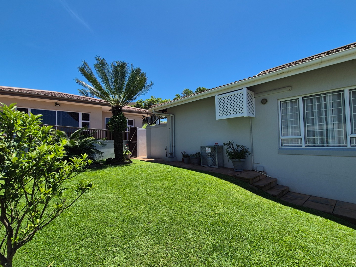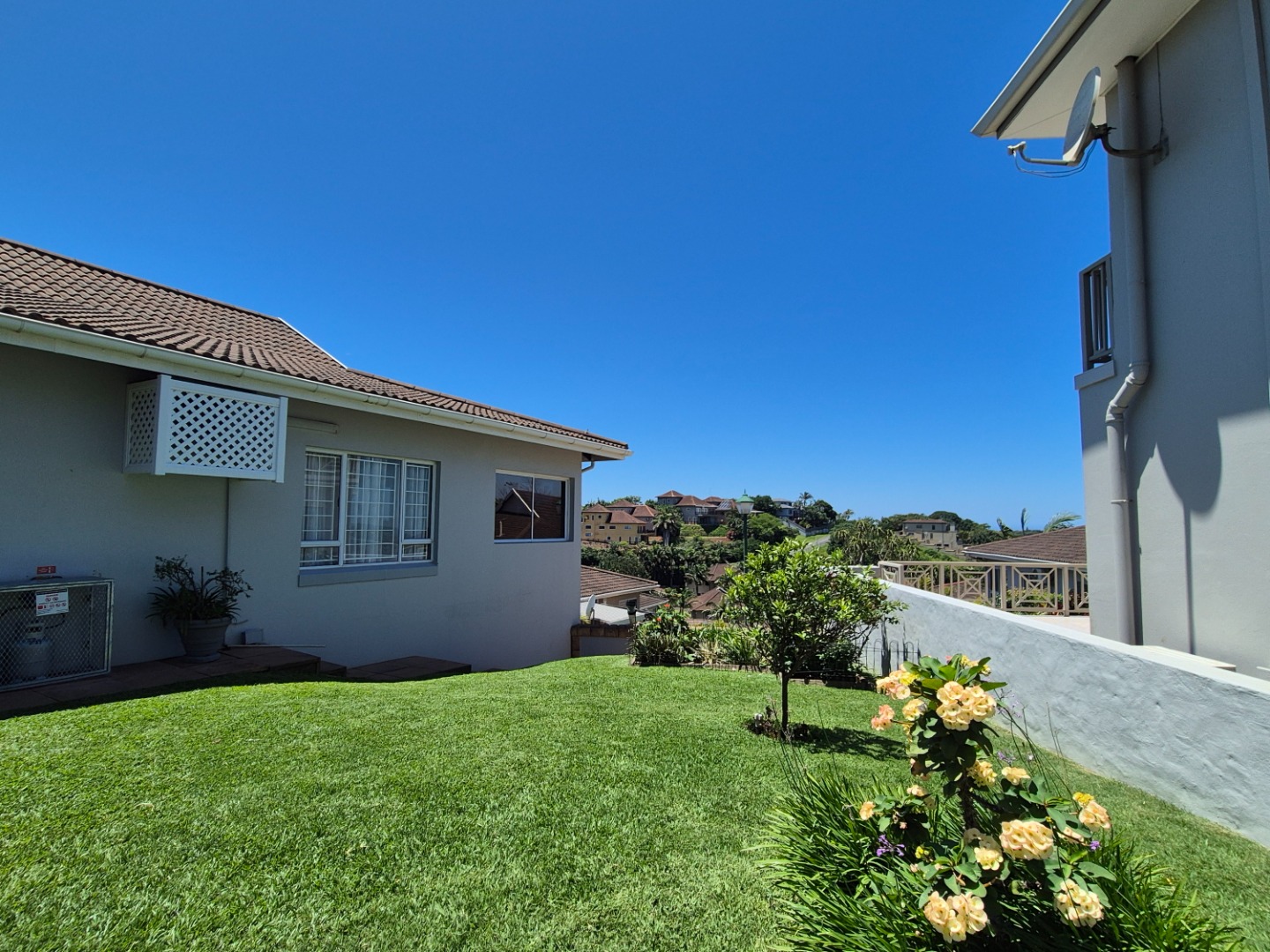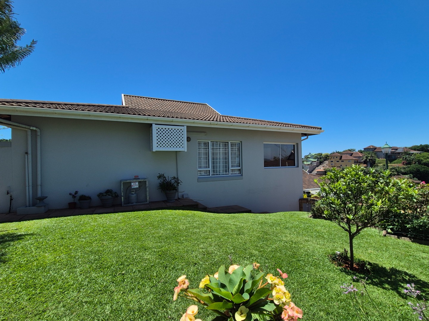 Discover this modern two-story residence in Ballito, boasting a contemporary light creamy exterior and excellent curb appeal. A spacious paved driveway leads to a double garage, providing ample parking. The property features neat landscaping with tropical palm trees, setting a welcoming tone for this well-maintained home.