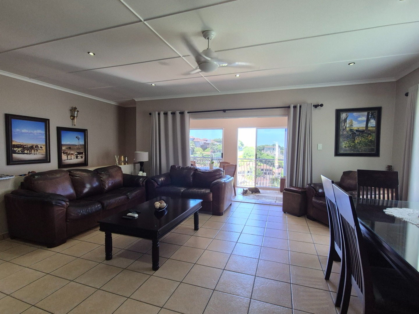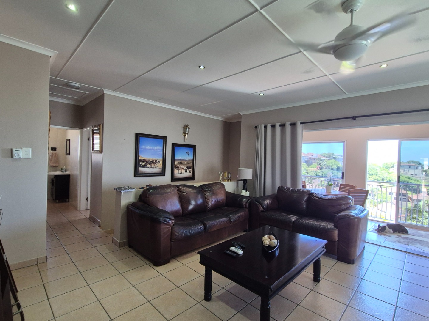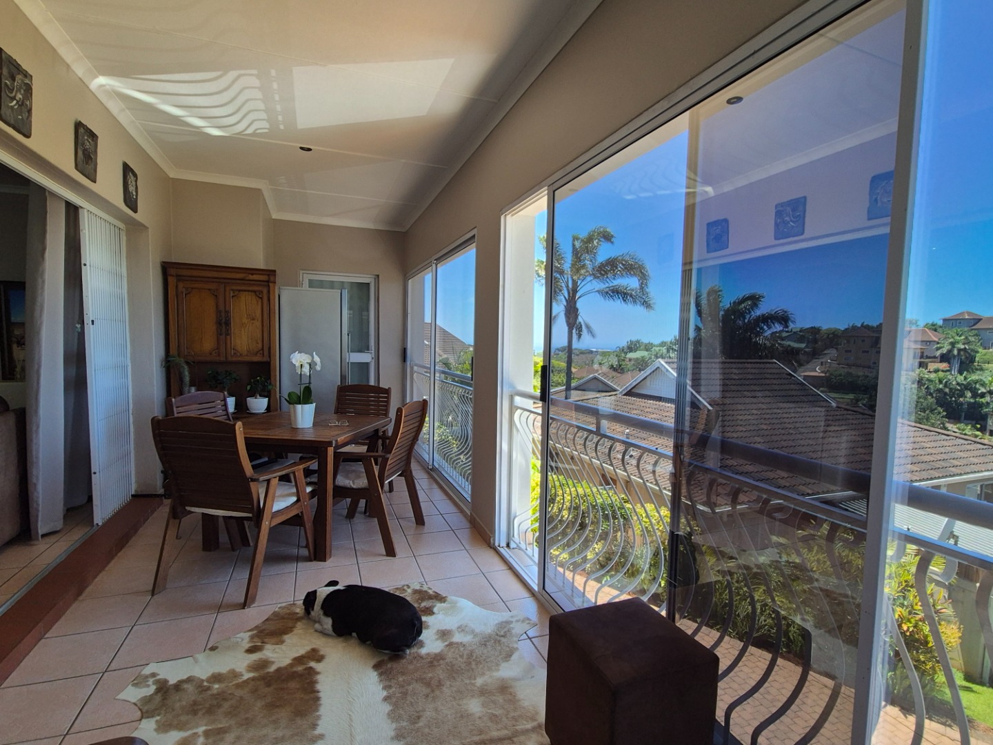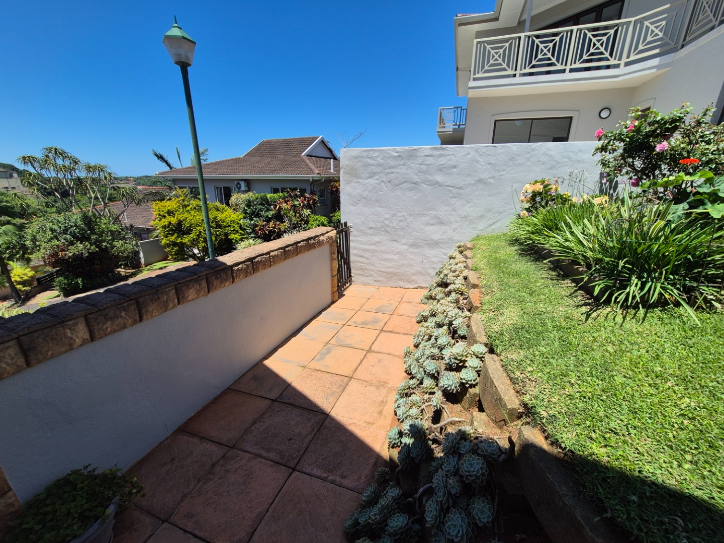 Discover this modern two-story residence in Ballito, boasting a contemporary light creamy exterior and excellent curb appeal. A spacious paved driveway leads to a double garage, providing ample parking. The property features neat landscaping with tropical palm trees, setting a welcoming tone for this well-maintained home.