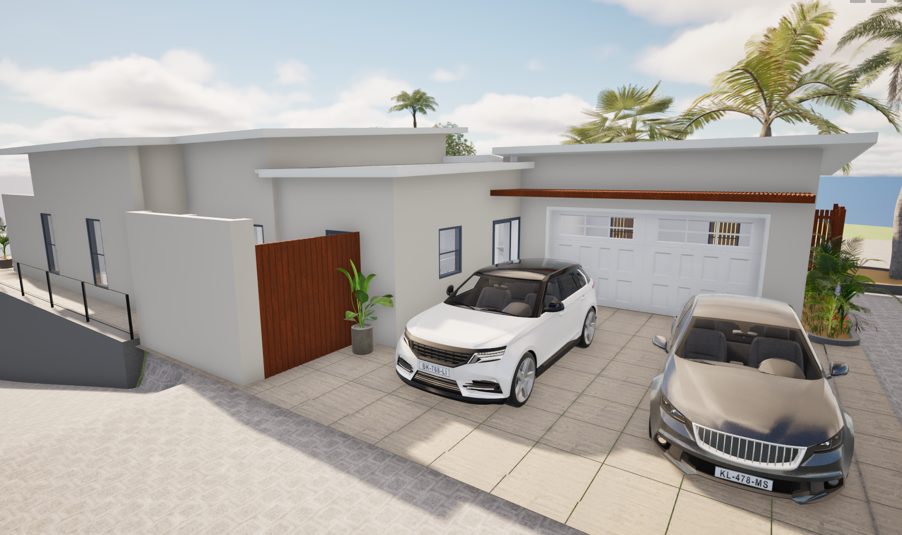 - Pergolas at the main bedroom patio and garage entrance