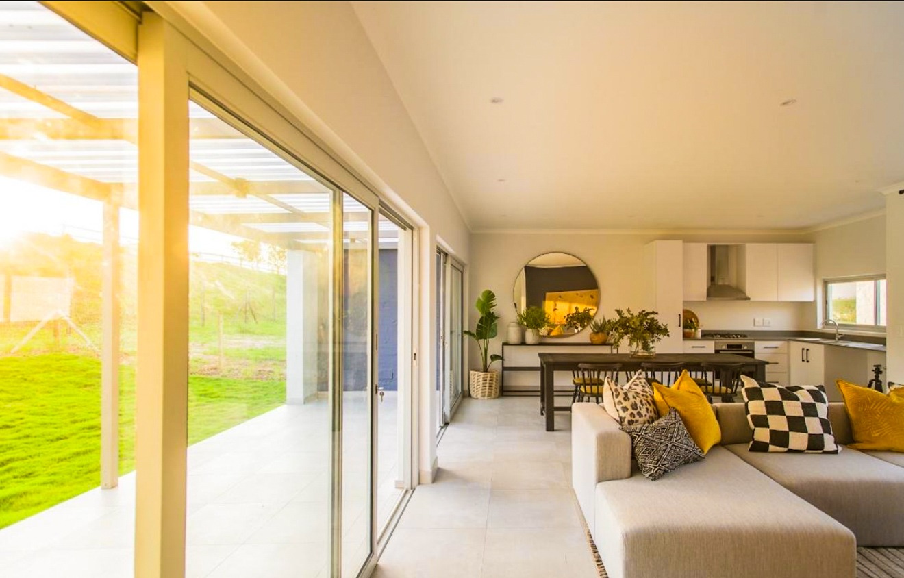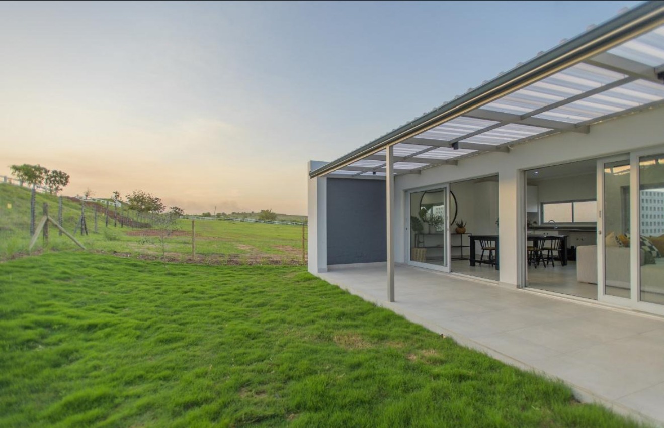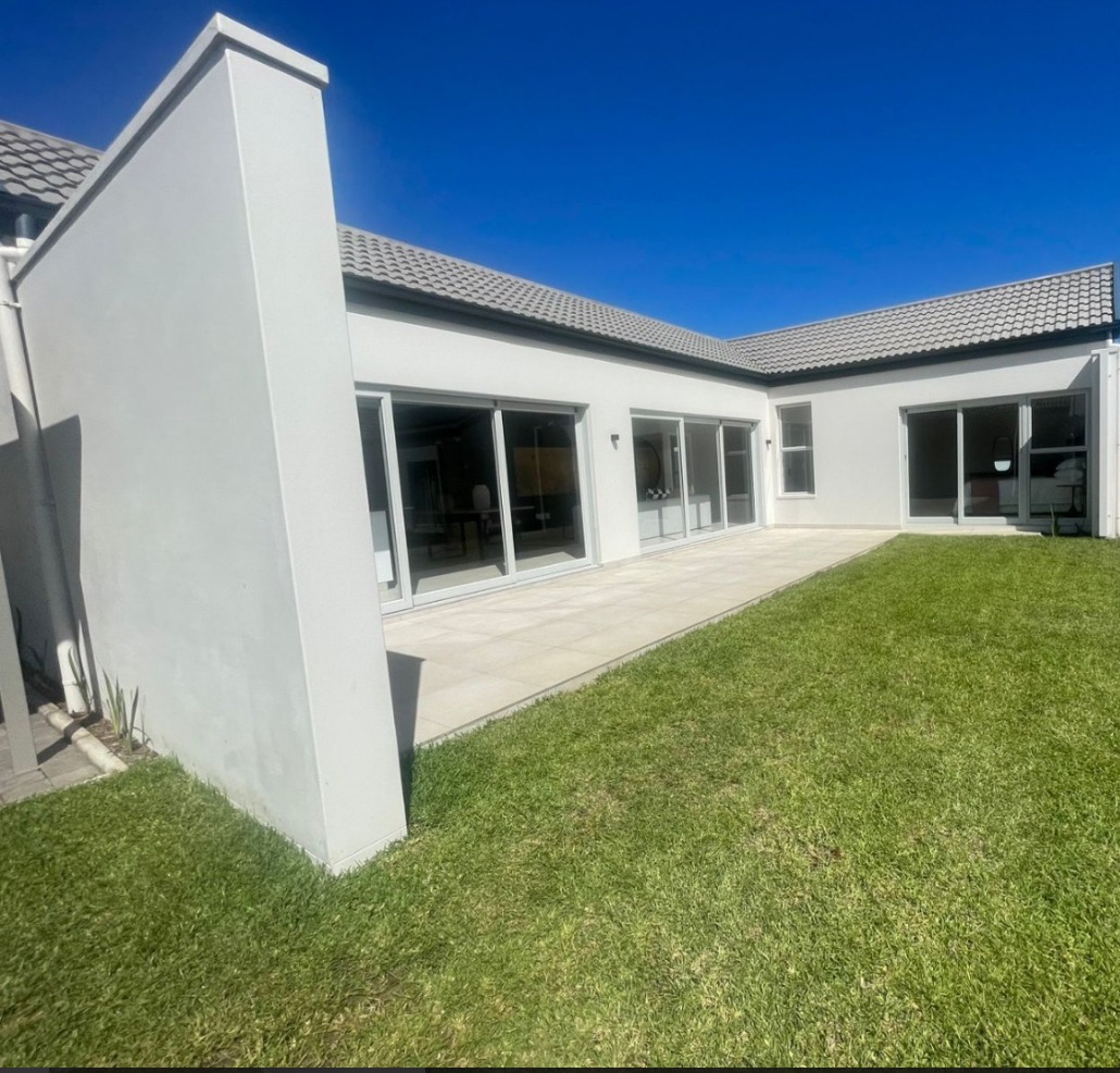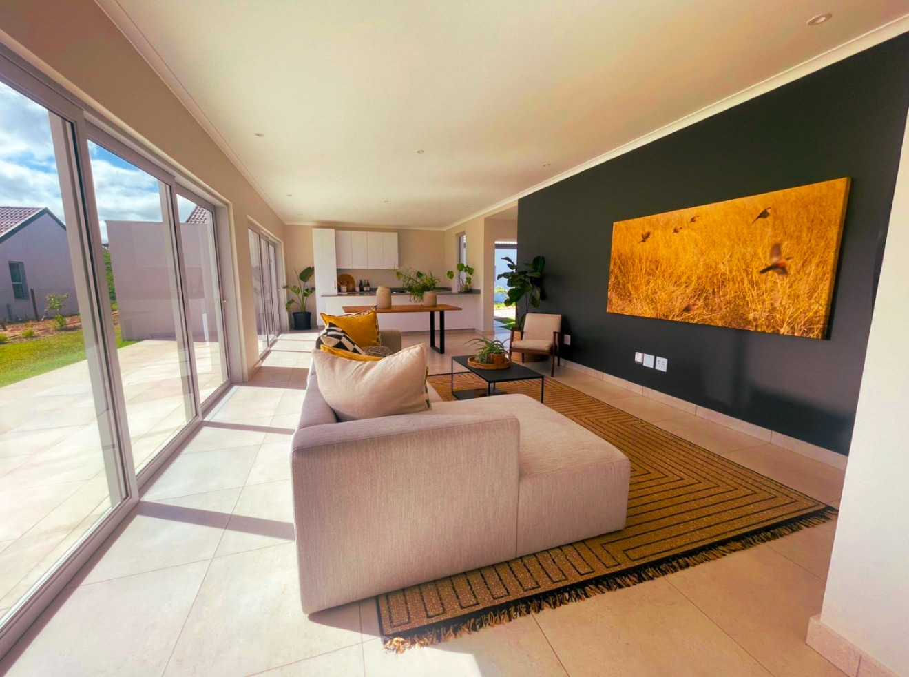Discover an exquisite modern sanctuary nestled within a prestigious security estate in Sheffield Beach, Ballito. This sophisticated 150 sqm residence epitomizes contemporary luxury, offering a harmonious blend of elegant design and seamless indoor-outdoor living. The luminous open-plan interior encompasses a chic lounge, a dedicated dining area, and a state-of-the-art kitchen, all bathed in abundant natural light streaming through expansive sliding glass doors. These doors effortlessly connect the living spaces to a private paved patio and a verdant lawn, creating an idyllic setting for relaxation and entertaining.