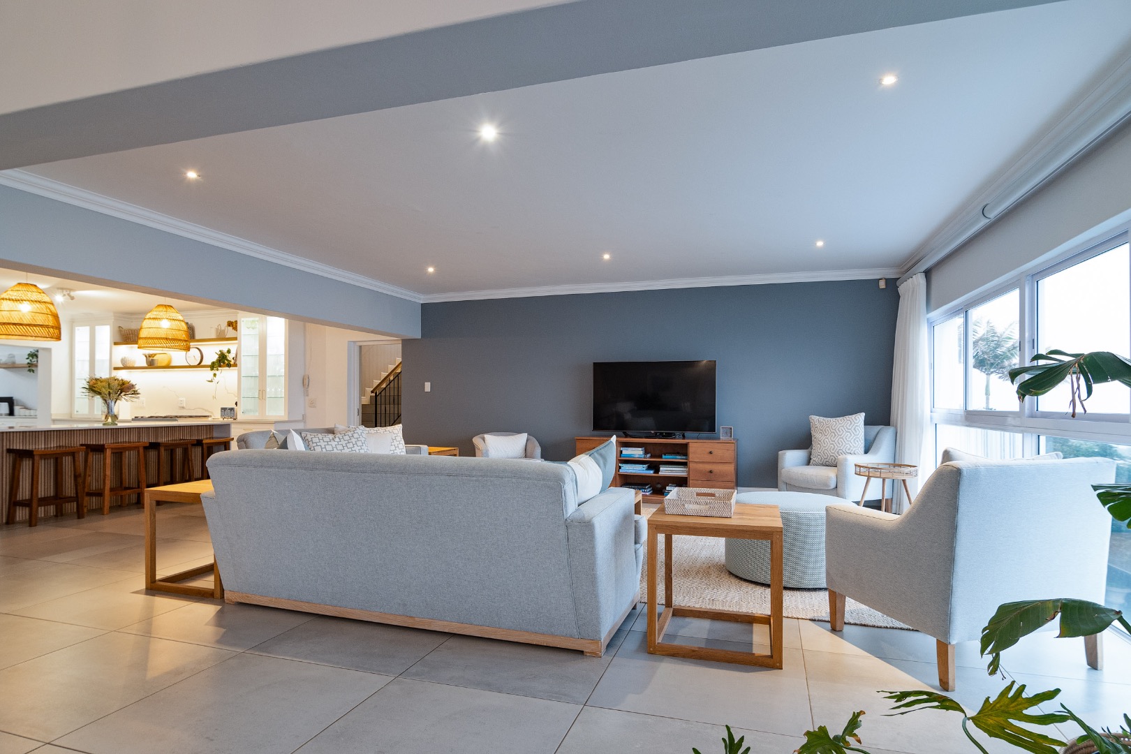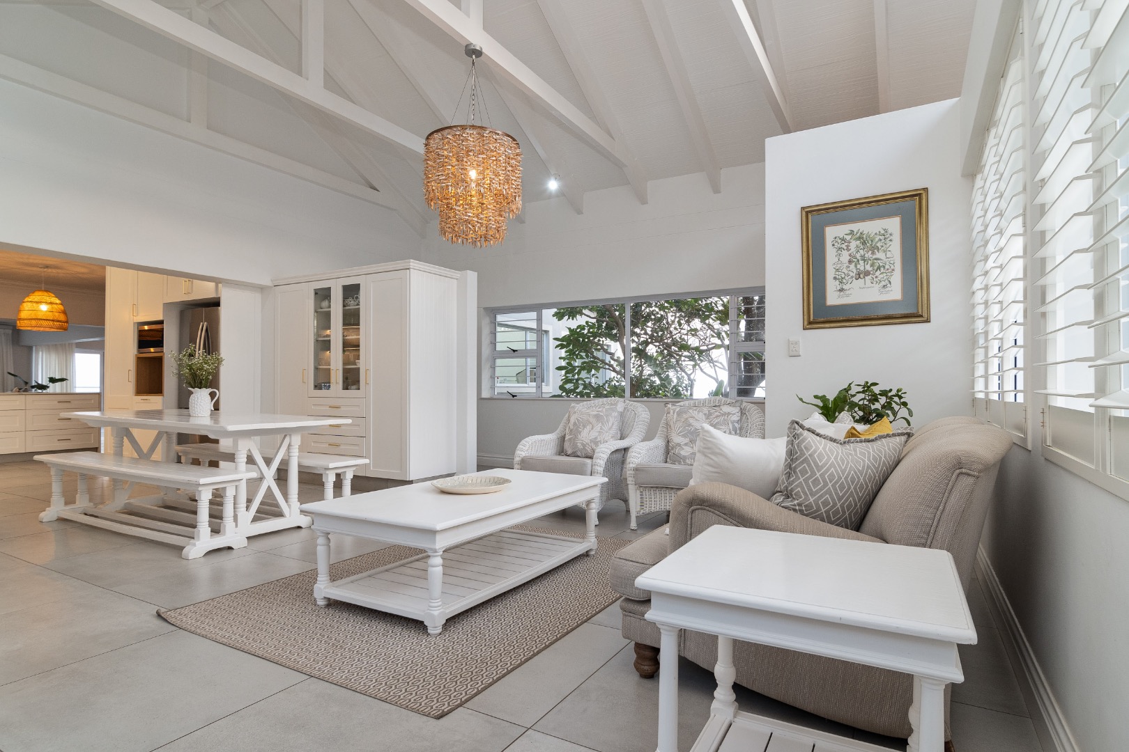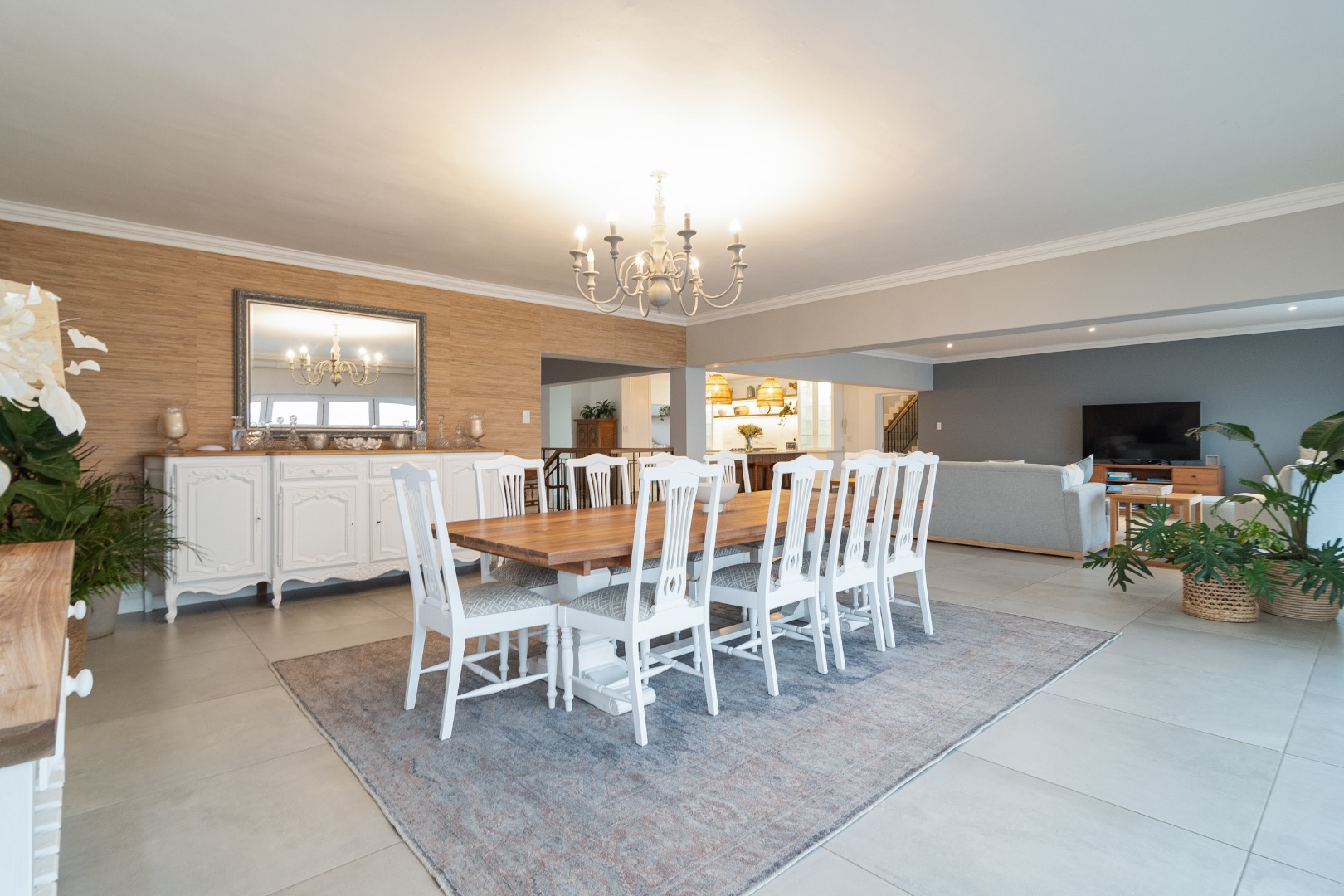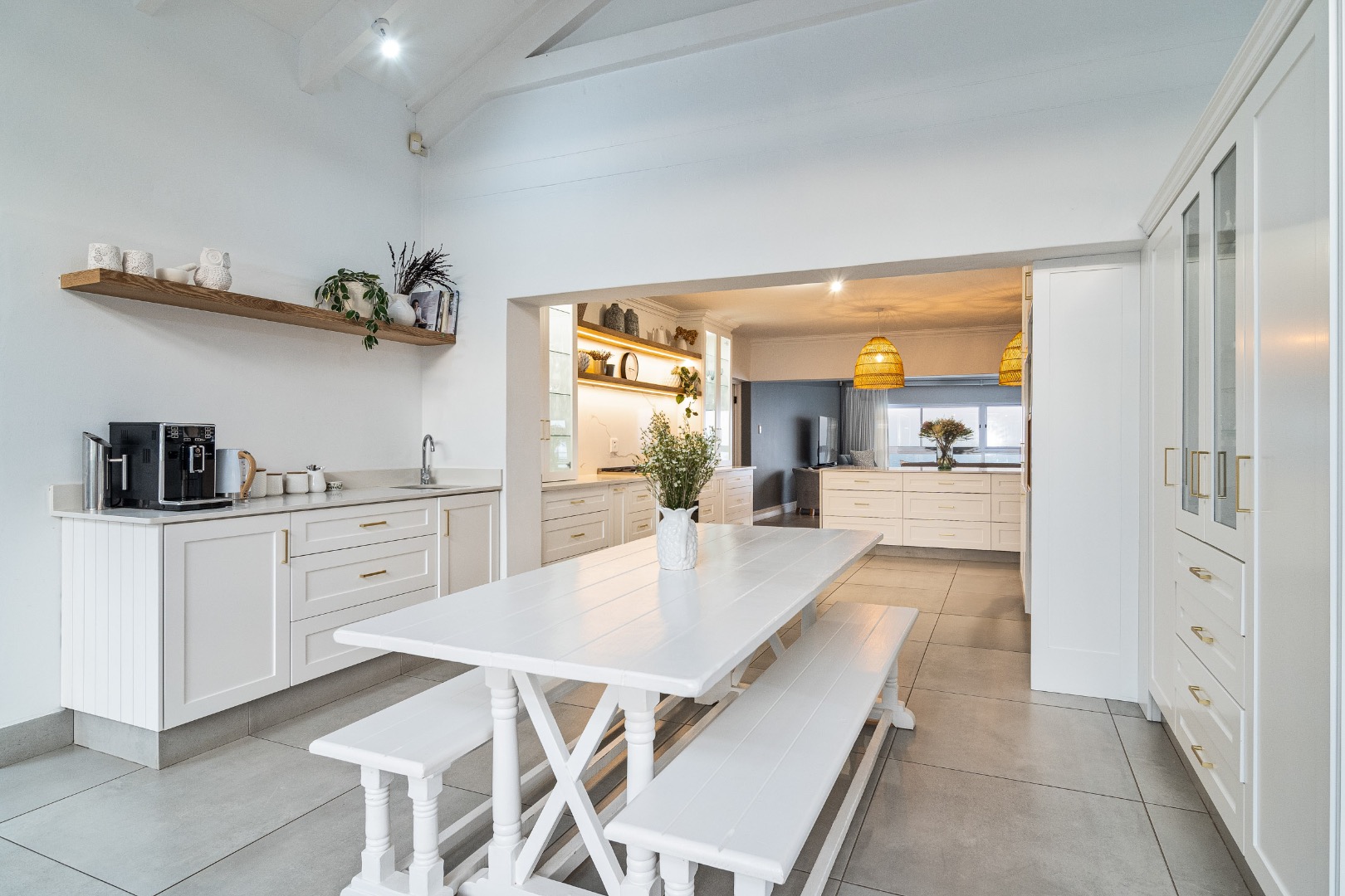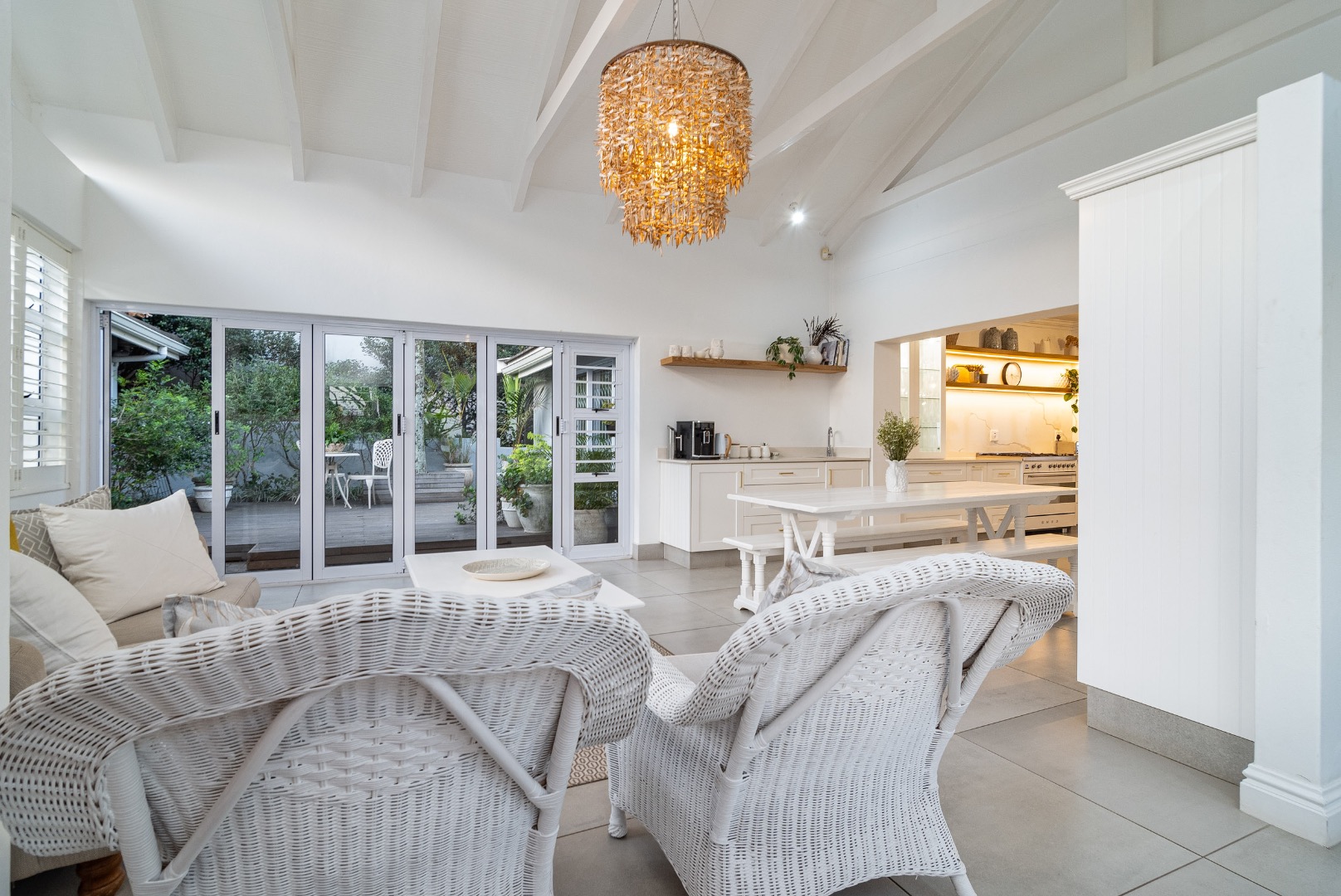 to a spacious covered patio. The patio, equipped with a built-in braai, extends to the manicured garden and pool deck, all while