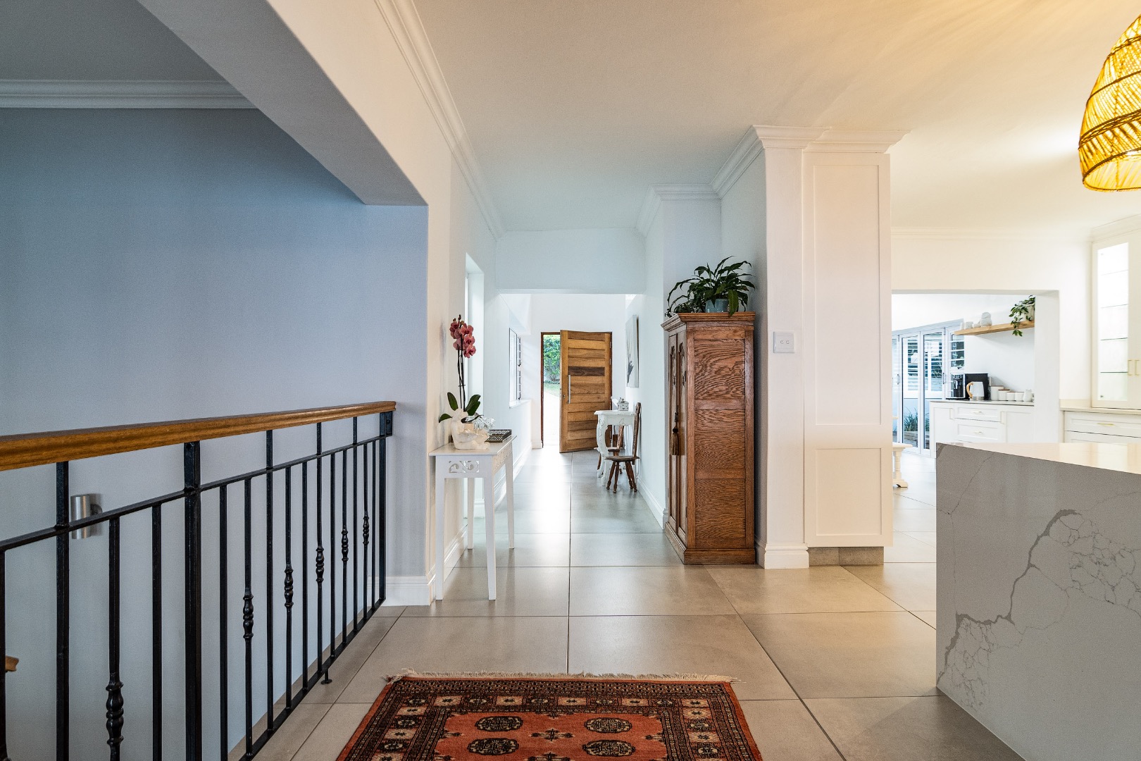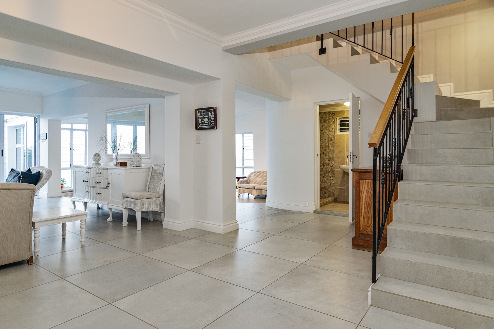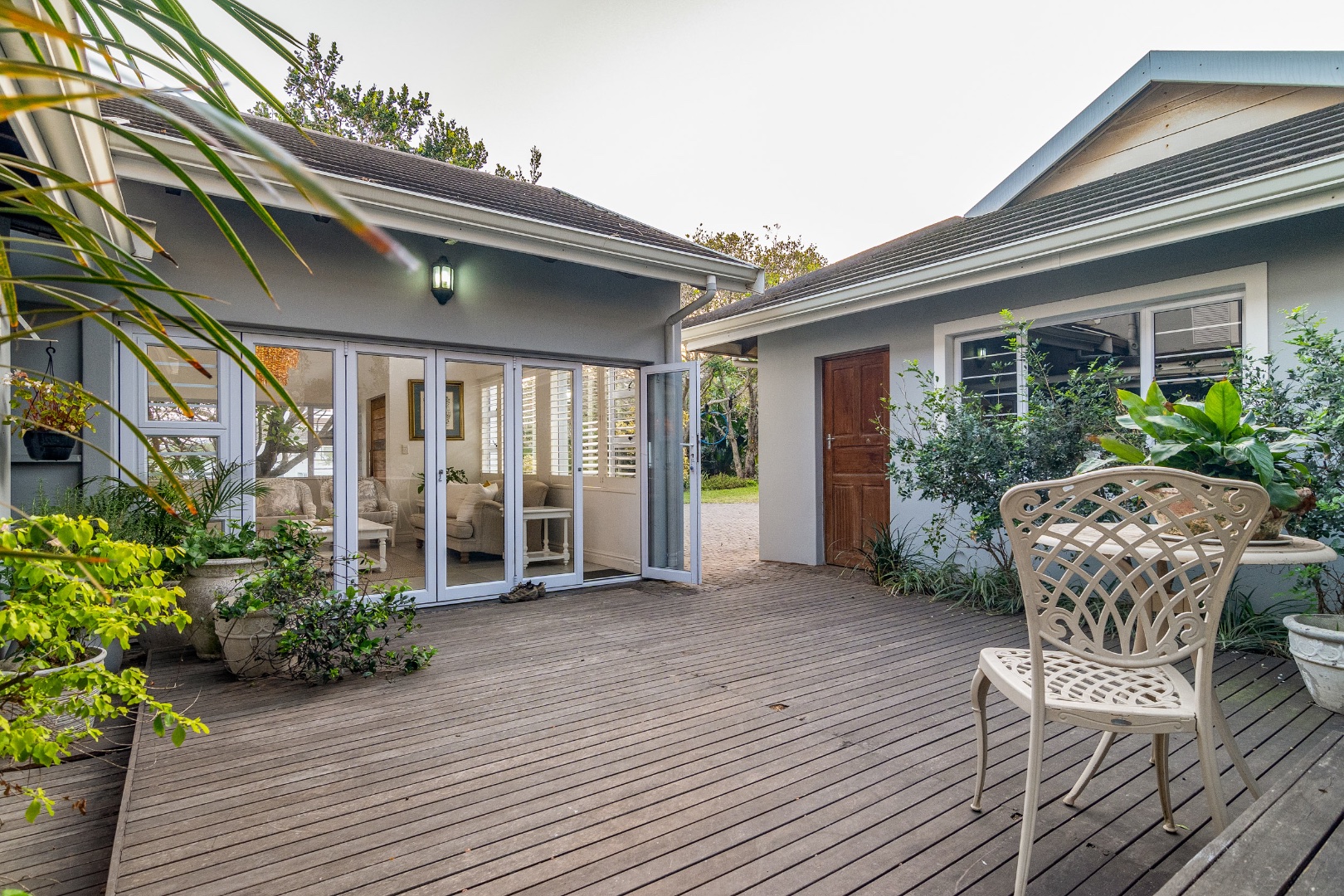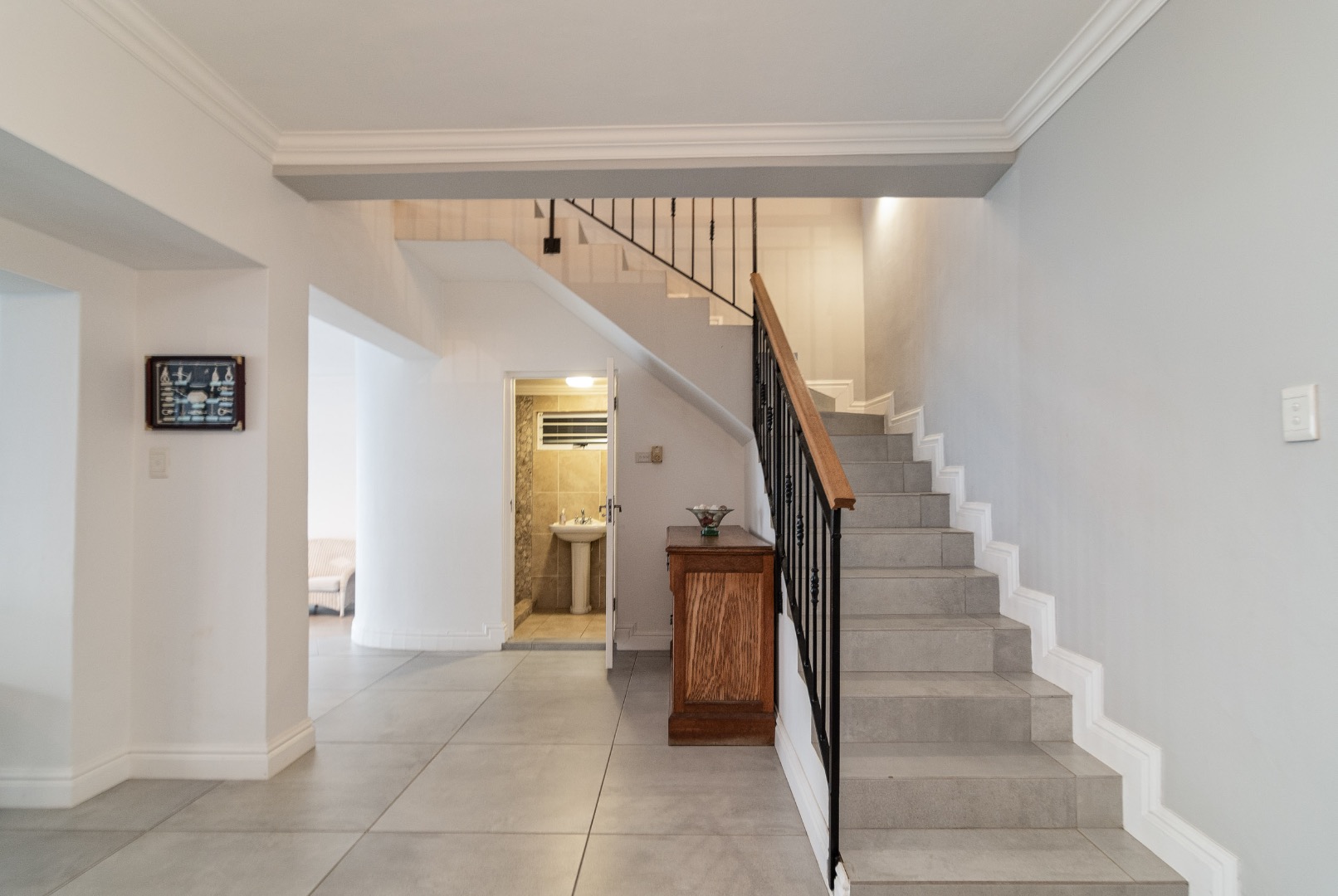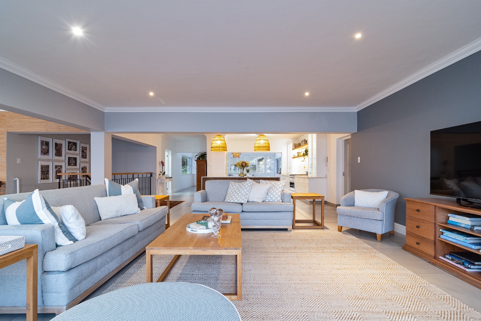to a spacious covered patio. The patio, equipped with a built-in braai, extends to the manicured garden and pool deck, all while