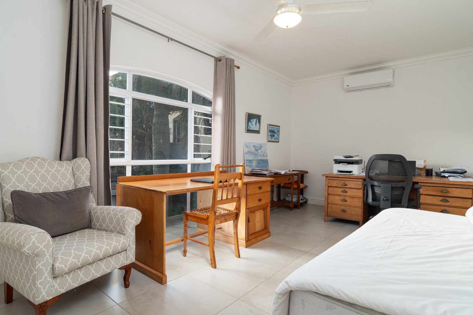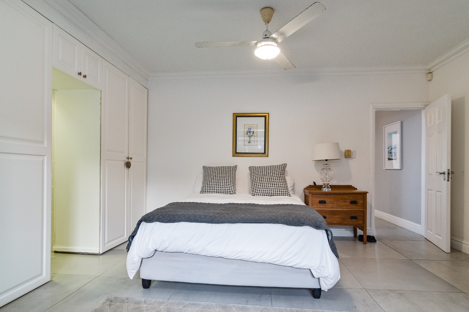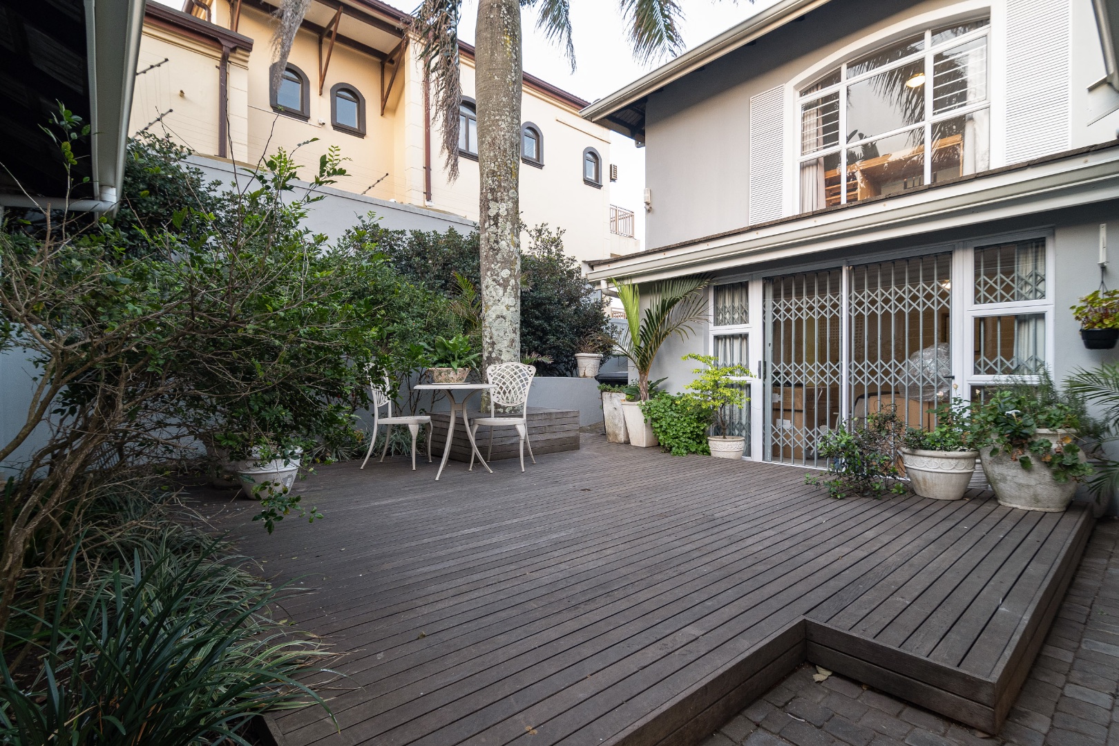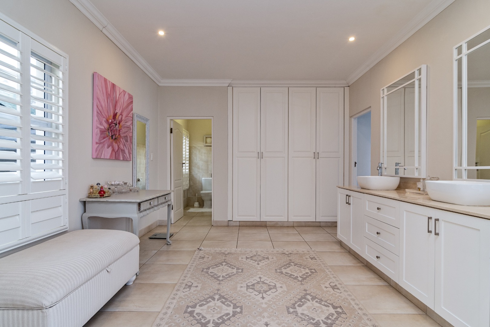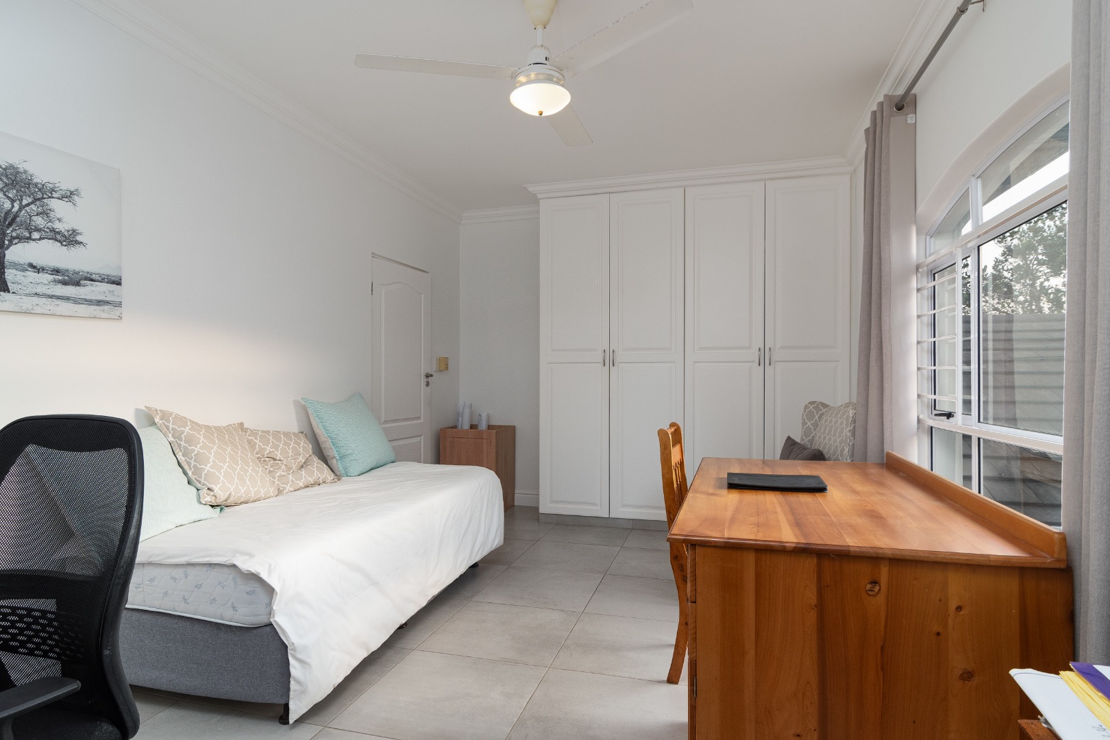 to a spacious covered patio. The patio, equipped with a built-in braai, extends to the manicured garden and pool deck, all while