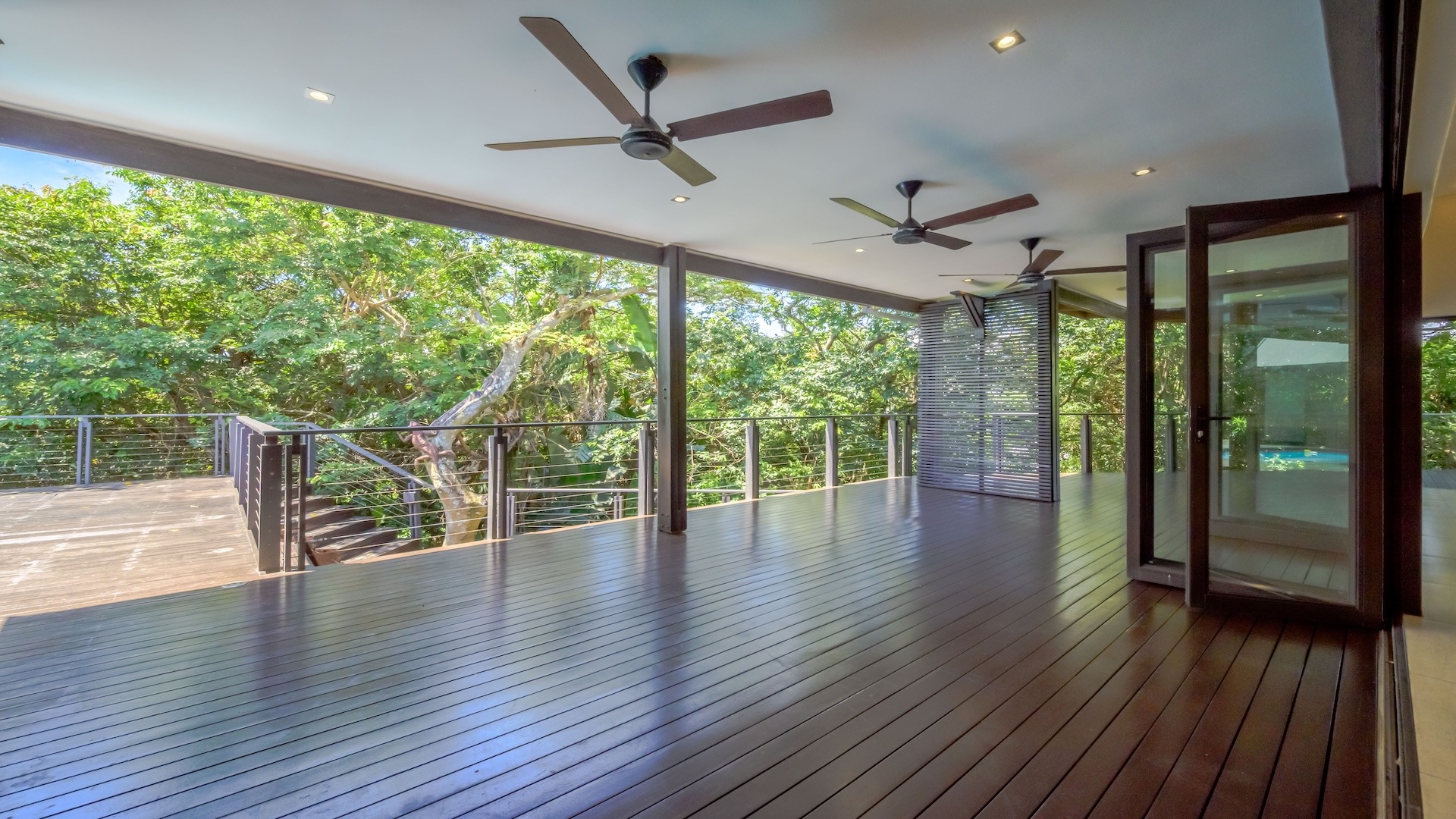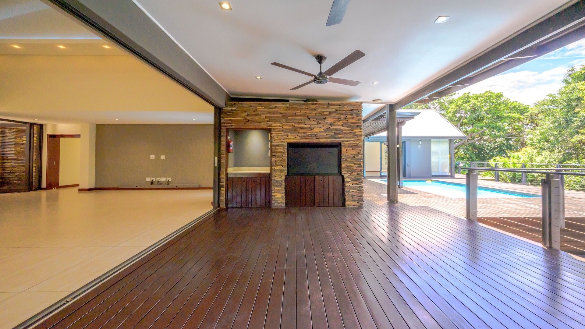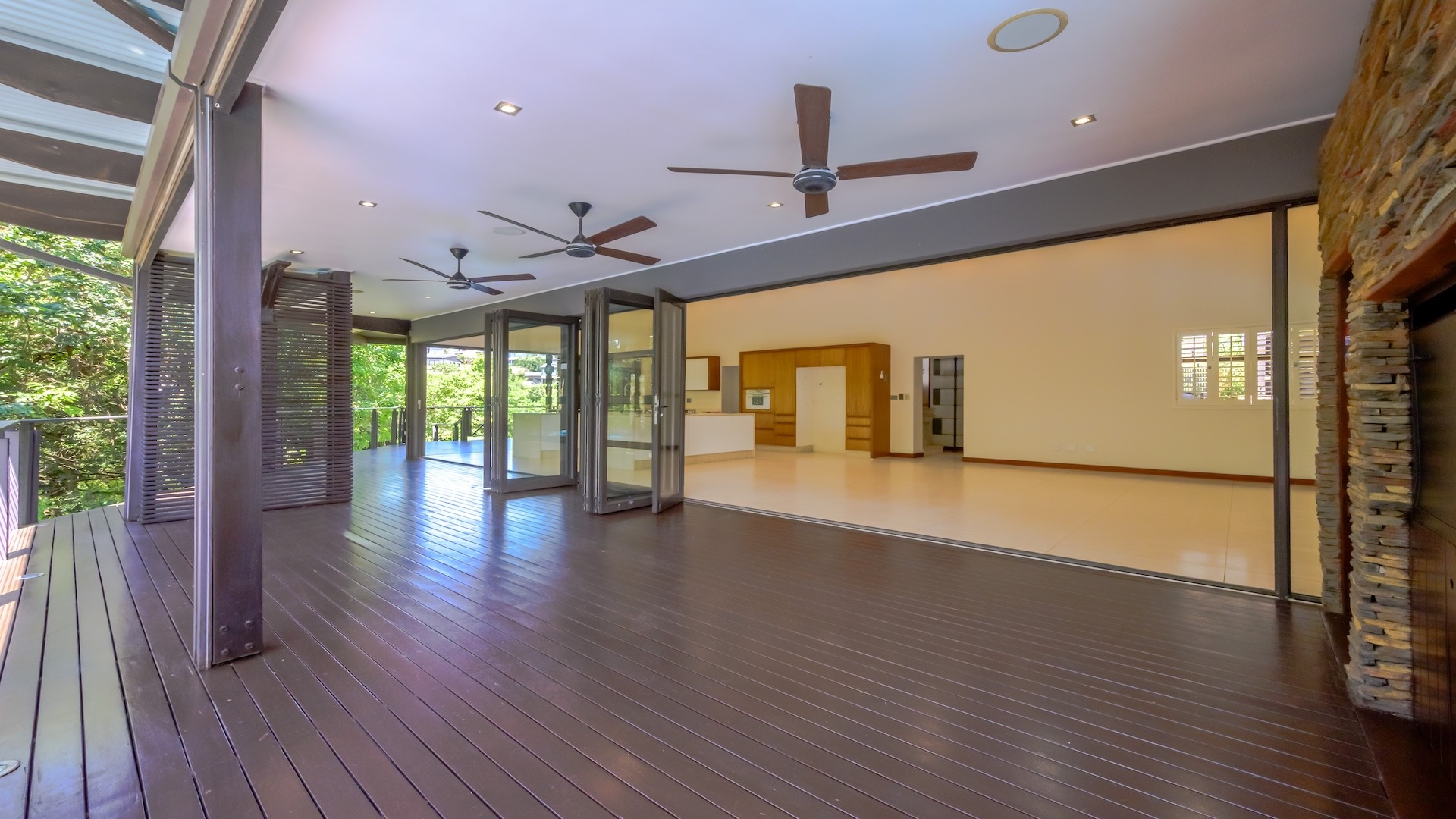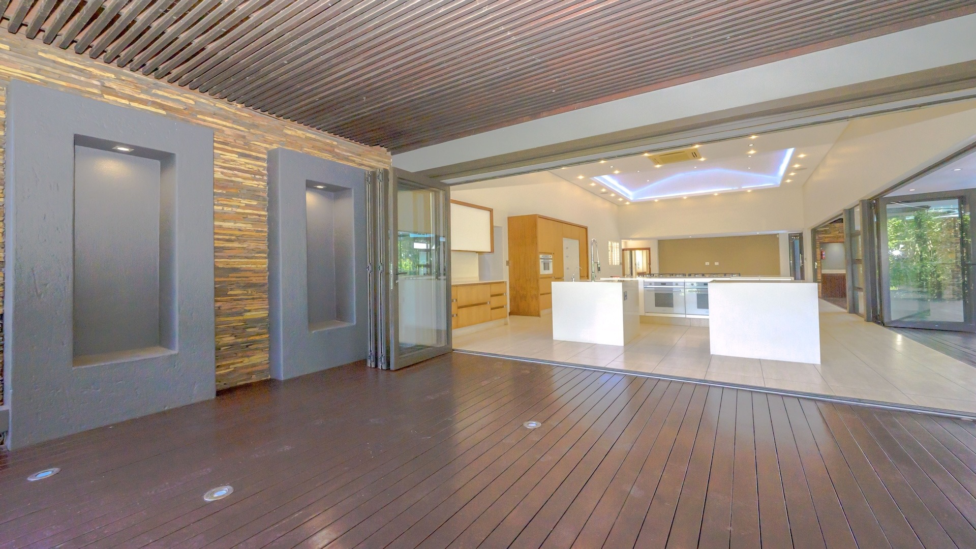 Step inside to discover an expansive open-plan layout, where high ceilings and abundant natural light create an atmosphere of refined elegance. The heart of the home is a state-of-the-art kitchen, boasting multiple islands, integrated appliances, and a harmonious blend of modern white and warm wooden cabinetry. This culinary haven flows effortlessly into the lounge, designed for both grand entertaining and intimate family moments. Large bi-fold glass doors seamlessly connect the interior to the magnificent outdoor living spaces, inviting the lush natural surroundings indoors. The sunken deck creates the perfect setting for a warm, inviting fire pit area.
