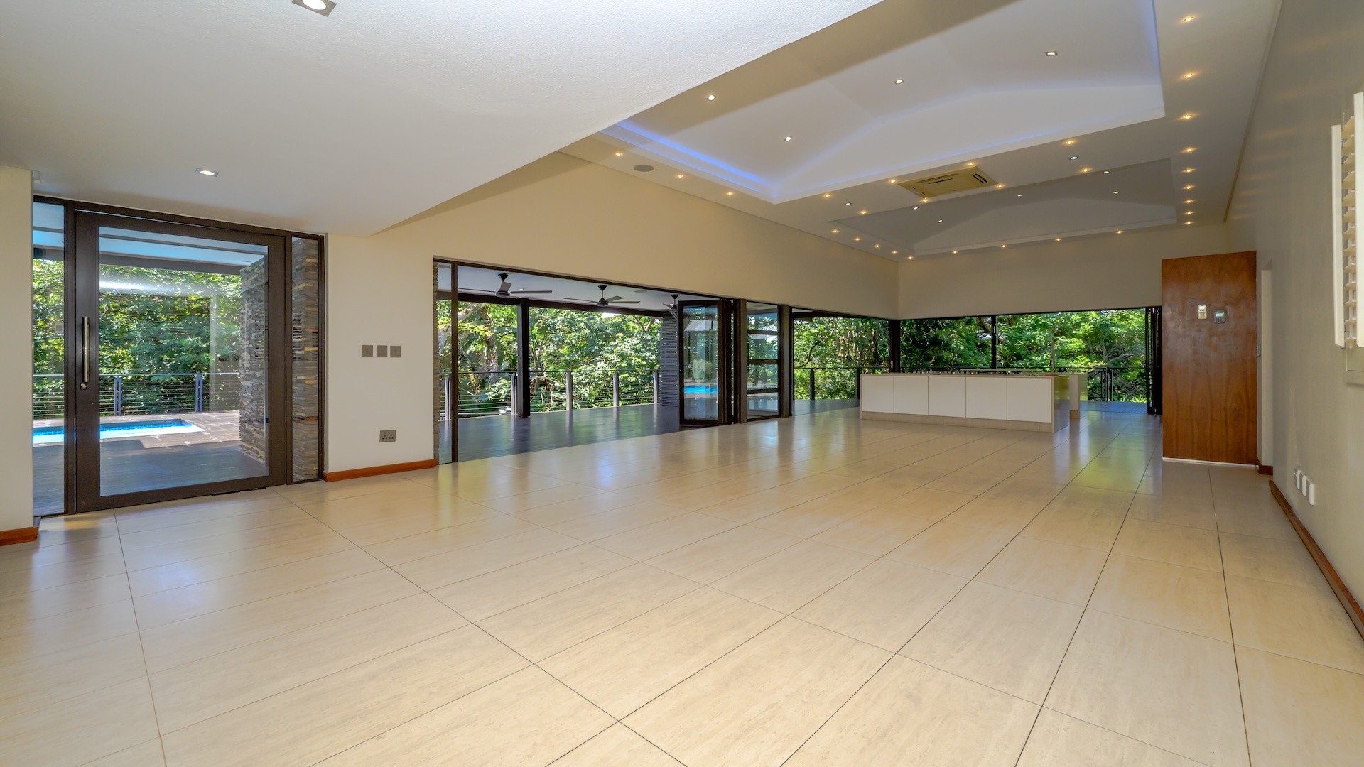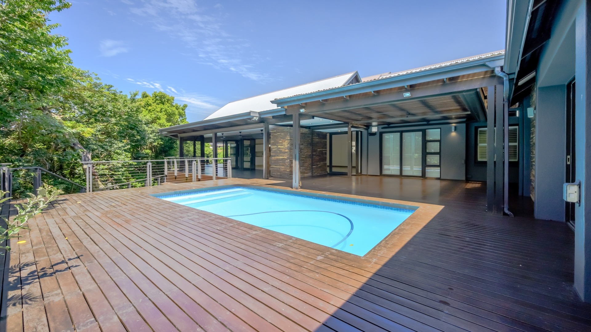 Nestled within the prestigious Simbithi Eco Estate in Ballito, this contemporary residence epitomises sophisticated coastal living. The striking modern architectural design, featuring a sleek grey exterior and corrugated metal roof, immediately captivates, offering exceptional kerb appeal. A generous paved driveway leads to a spacious double garage, providing ample parking for residents and guests alike.