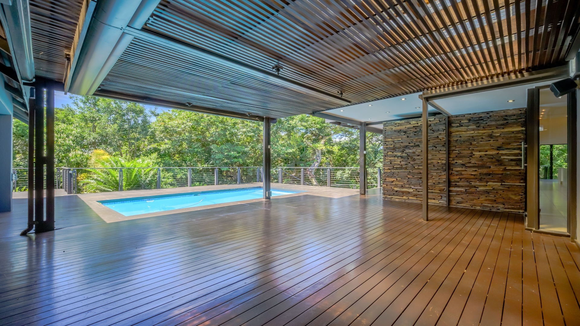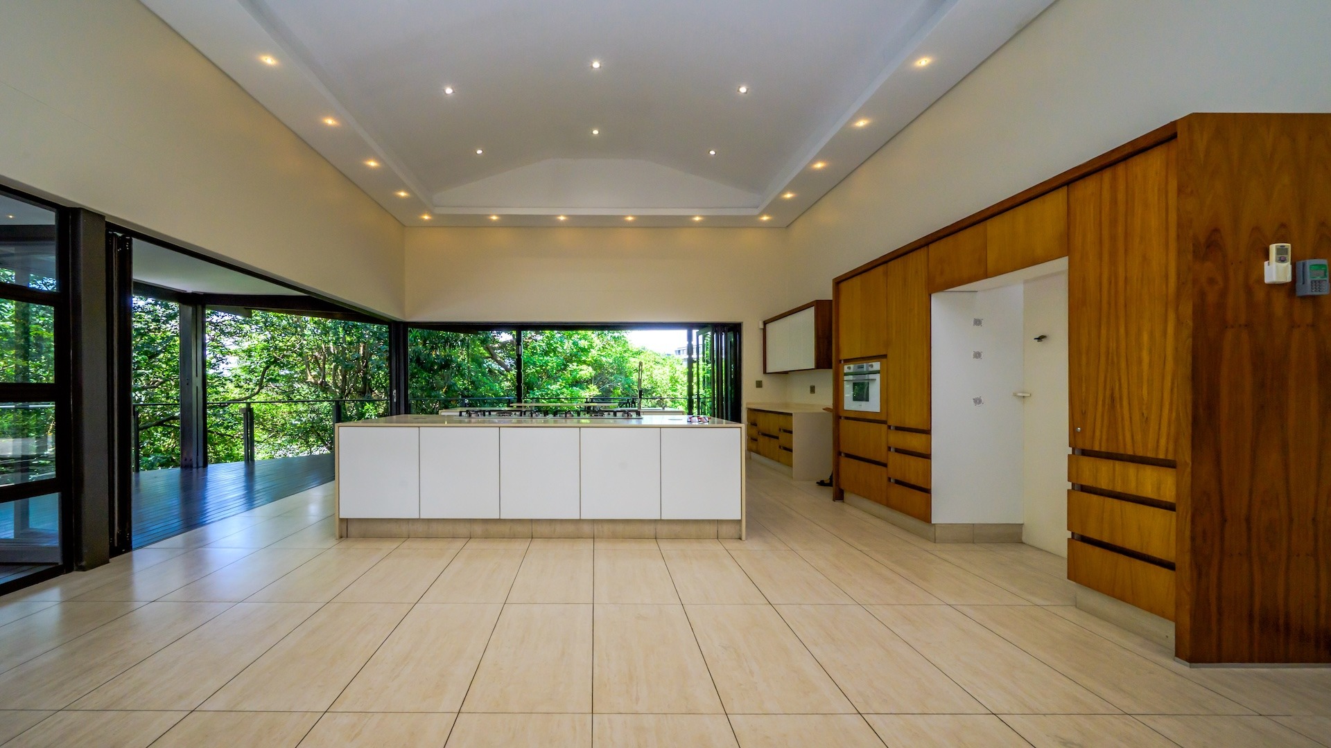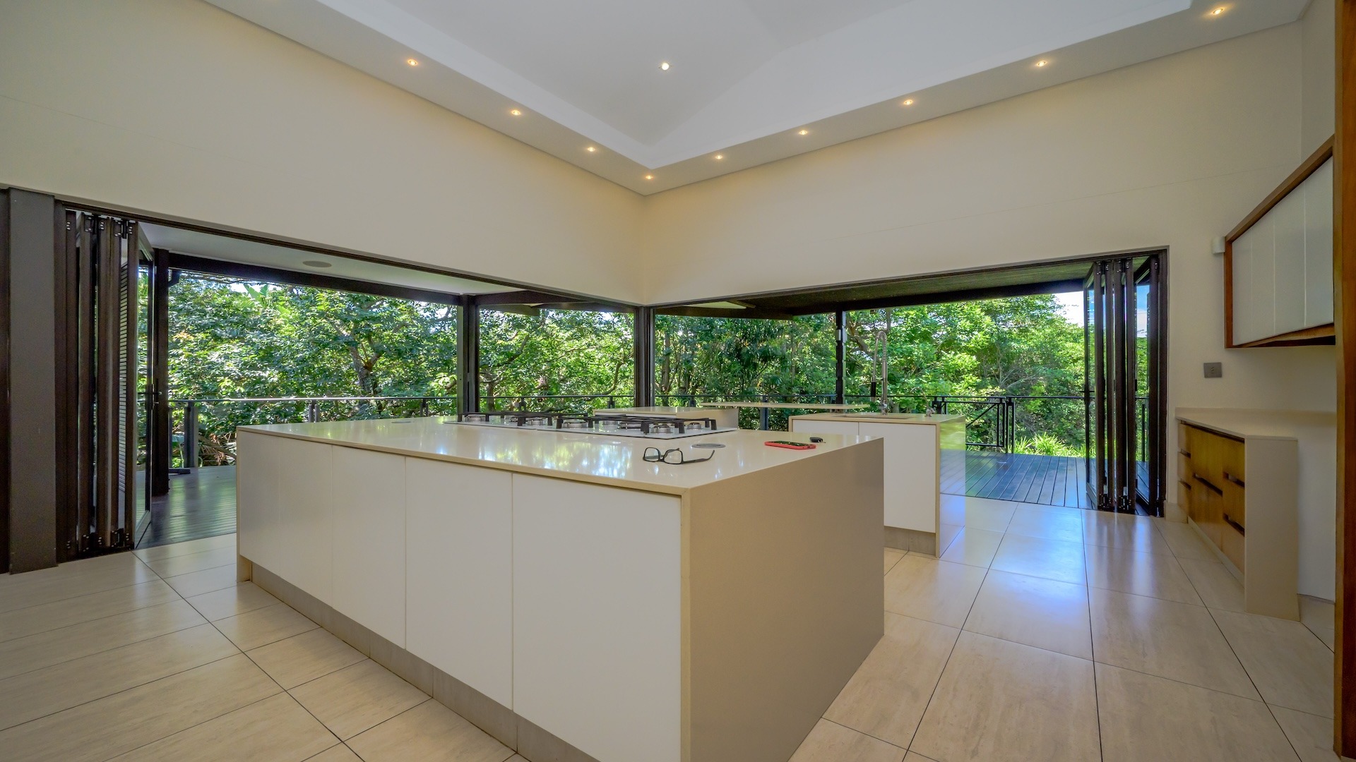 Step inside to discover an expansive open-plan layout, where high ceilings and abundant natural light create an atmosphere of refined elegance. The heart of the home is a state-of-the-art kitchen, boasting multiple islands, integrated appliances, and a harmonious blend of modern white and warm wooden cabinetry. This culinary haven flows effortlessly into the lounge, designed for both grand entertaining and intimate family moments. Large bi-fold glass doors seamlessly connect the interior to the magnificent outdoor living spaces, inviting the lush natural surroundings indoors. The sunken deck creates the perfect setting for a warm, inviting fire pit area.