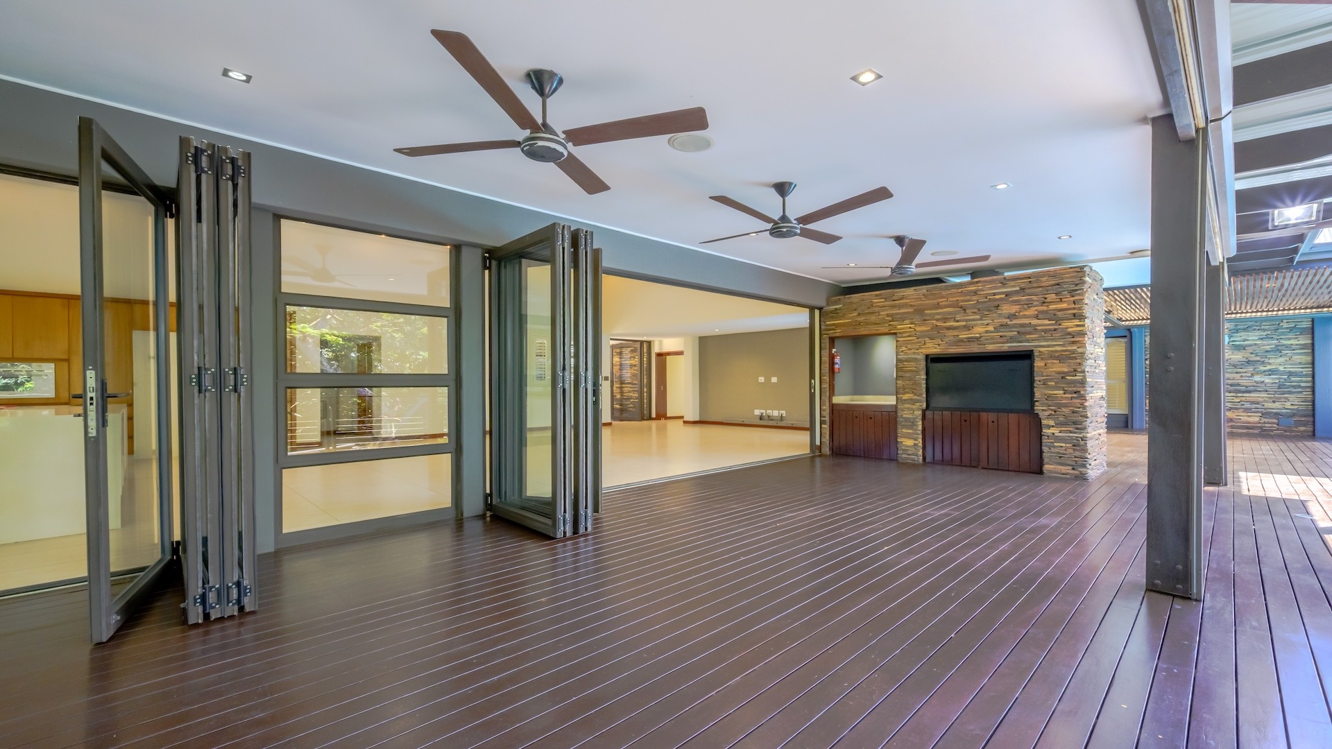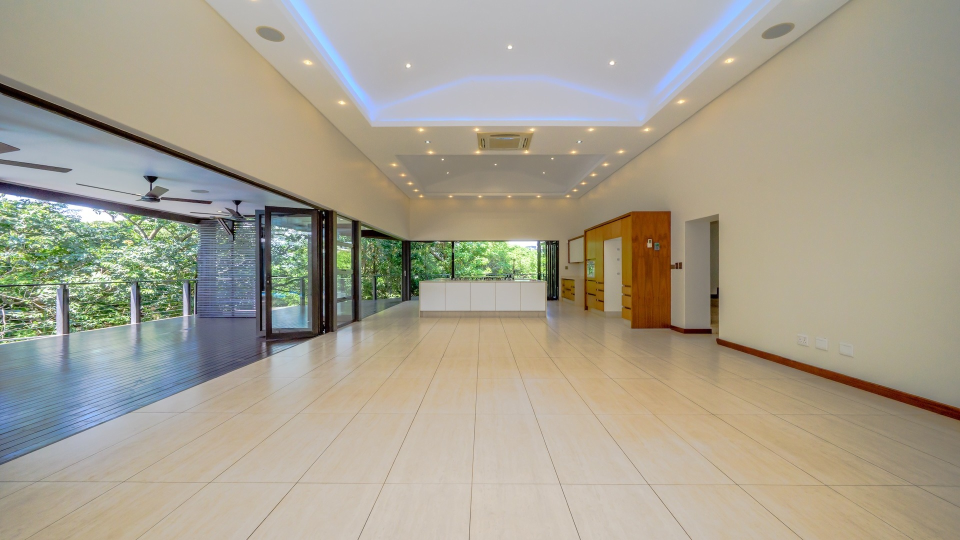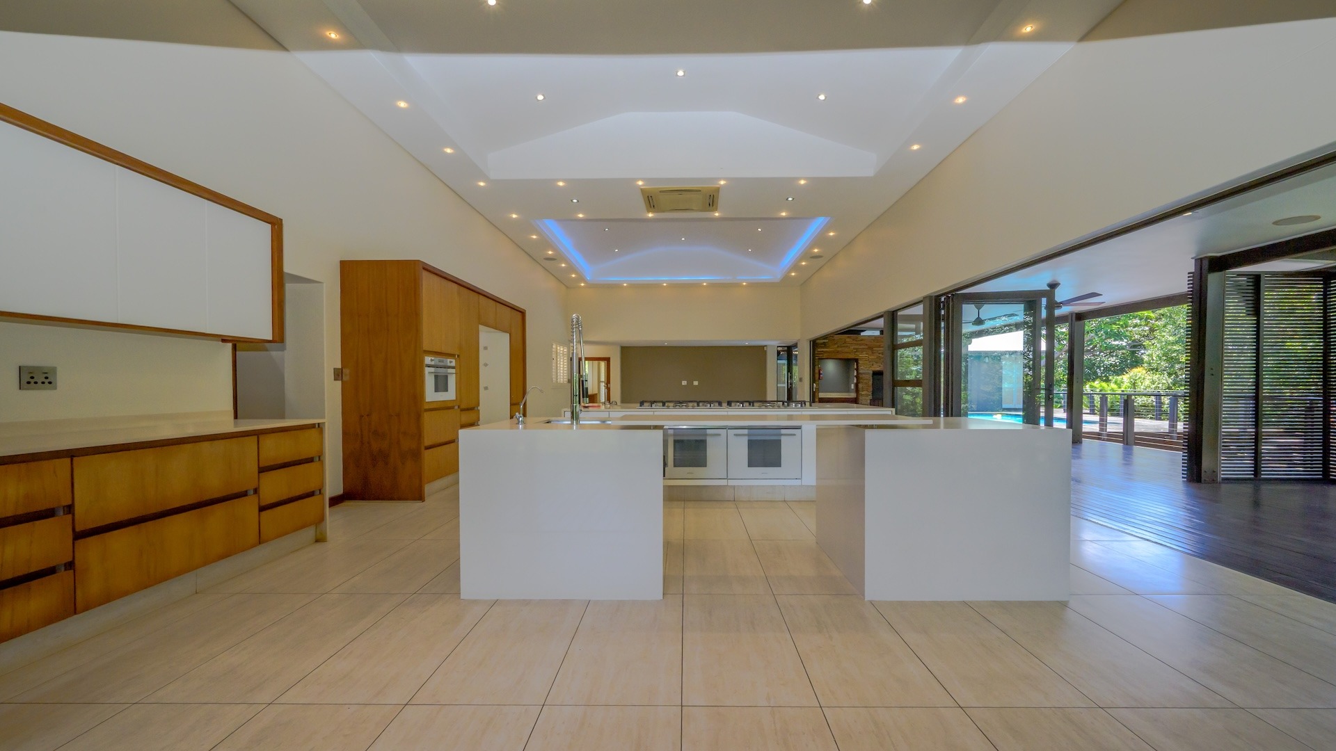 Step inside to discover an expansive open-plan layout, where high ceilings and abundant natural light create an atmosphere of refined elegance. The heart of the home is a state-of-the-art kitchen, boasting multiple islands, integrated appliances, and a harmonious blend of modern white and warm wooden cabinetry. This culinary haven flows effortlessly into the lounge, designed for both grand entertaining and intimate family moments. Large bi-fold glass doors seamlessly connect the interior to the magnificent outdoor living spaces, inviting the lush natural surroundings indoors. The sunken deck creates the perfect setting for a warm, inviting fire pit area.